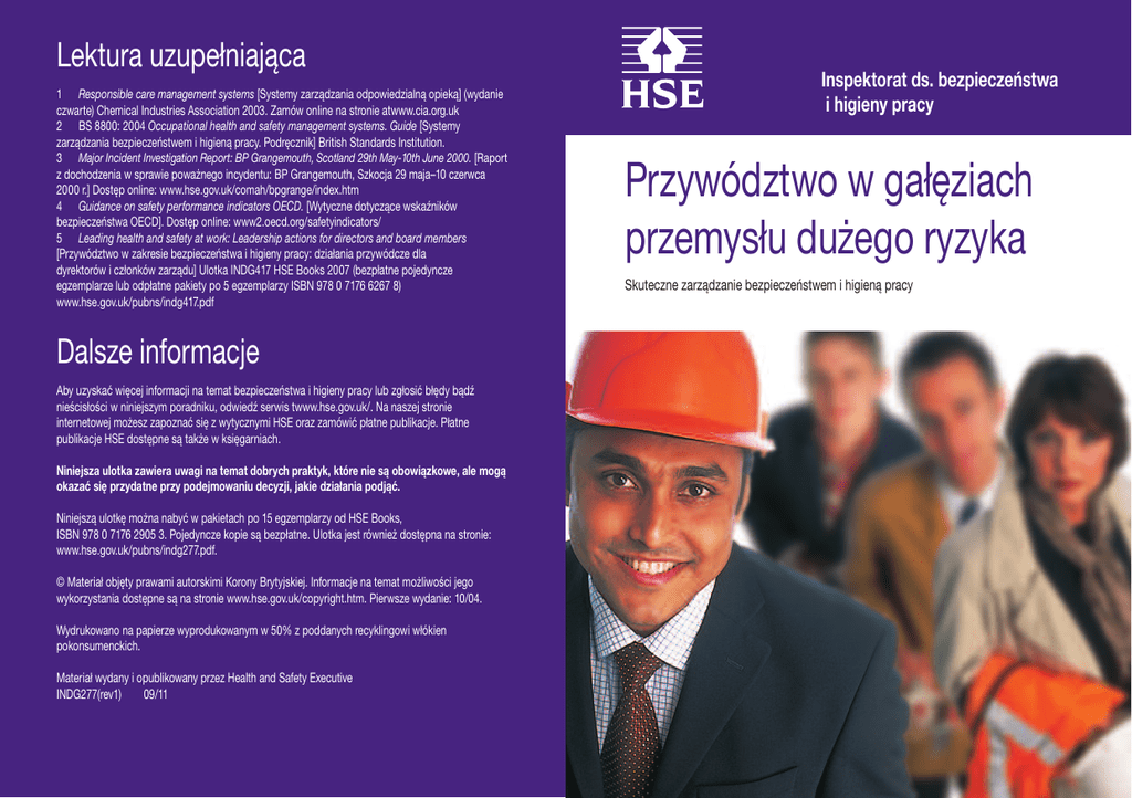 Lektura uzupełniająca 1 Responsible care management systems [Systemy zarządzania odpowiedzialną opieką] (wydanie czwarte) Chemical Industries Association 2003. Zamów online na stronie atwww.cia.org.uk 2 BS 8800: 2004 Occupational health and safety management systems. Guide [Systemy zarządzania bezpieczeństwem i higieną pracy. Podręcznik] British Standards Institution. 3 Major Incident Investigation Report: BP Grangemouth, Scotland 29th May-10th June 2000. [Raport z dochodzenia w sprawie poważnego incydentu: BP Grangemouth, Szkocja 29 maja–10 czerwca 2000 r.] Dostęp online: www.hse.gov.uk/comah/bpgrange/index.htm 4 Guidance on safety performance indicators OECD. [Wytyczne dotyczące wskaźników bezpieczeństwa OECD]. Dostęp online: www2.oecd.org/safetyindicators/ 5 Leading health and safety at work: Leadership actions for directors and board members [Przywództwo w zakresie bezpieczeństwa i higieny pracy: działania przywódcze dla dyrektorów i członków zarządu] Ulotka INDG417 HSE Books 2007 (bezpłatne pojedyncze egzemplarze lub odpłatne pakiety po 5 egzemplarzy ISBN 978 0 7176 6267 8) www.hse.gov.uk/pubns/indg417.pdf Dalsze informacje Aby uzyskać więcej informacji na temat bezpieczeństwa i higieny pracy lub zgłosić błędy bądź nieścisłości w niniejszym poradniku, odwiedź serwis twww.hse.gov.uk/. Na naszej stronie internetowej możesz zapoznać się z wytycznymi HSE oraz zamówić płatne publikacje. Płatne publikacje HSE dostępne są także w księgarniach. Niniejsza ulotka zawiera uwagi na temat dobrych praktyk, które nie są obowiązkowe, ale mogą okazać się przydatne przy podejmowaniu decyzji, jakie działania podjąć. Niniejszą ulotkę można nabyć w pakietach po 15 egzemplarzy od HSE Books, ISBN 978 0 7176 2905 3. Pojedyncze kopie są bezpłatne. Ulotka jest również dostępna na stronie: www.hse.gov.uk/pubns/indg277.pdf. © Materiał objęty prawami autorskimi Korony Brytyjskiej. Informacje na temat możliwości jego wykorzystania dostępne są na stronie www.hse.gov.uk/copyright.htm. Pierwsze wydanie: 10/04. Wydrukowano na papierze wyprodukowanym w 50% z poddanych recyklingowi włókien pokonsumenckich. Materiał wydany i opublikowany przez Health and Safety Executive INDG277(rev1) 09/11 Inspektorat ds. bezpieczeństwa i higieny pracy Przywództwo w gałęziach przemysłu dużego ryzyka Skuteczne zarządzanie bezpieczeństwem i higieną pracy Wprowadzenie Widoczne zaangażowanie kierownictwa wyższego szczebla jest kluczowe dla osiągnięcia zadowalających wyników w zakresie bezpieczeństwa i higieny pracy. Niniejsza broszura została opracowana dla kierowników wyższego szczebla, aby ułatwić im — stanowiącą jeden z priorytetów każdej organizacji — stałą poprawę wyników w zakresie bezpieczeństwa i higieny pracy. Broszura ta została pierwotnie opracowana z myślą o morskim przemyśle wydobywczym, jednak Dyrektoriat ds. niebezpiecznych instalacji (Hazardous Installations Directorate) działający w ramach Inspektoratu ds. zdrowia i bezpieczeństwa (Health and Safety Executive — HSE) uzupełnił jej treść, aby pomóc liderom branżowym osiągać lepsze wyniki w zakresie bezpieczeństwa i higieny pracy we wszystkich gałęziach przemysłu, z którymi wiąże się duże ryzyko — zarówno na lądzie, jak i na morzu. W broszurze używamy sformułowania „kierownicy wyższego szczebla”. Należy przez to rozumieć dyrektorów wykonawczych i innych kierowników oraz członków zarządu, którzy z racji stanowiska i zakresu odpowiedzialności mają znaczący wpływ na kwestie związane z bezpieczeństwem i higieną pracy w danym przedsiębiorstwie. Broszura składa się z czterech części. Są to: Kultura bezpieczeństwa i higieny pracy Systemy Przywództwo poprzez dawanie przykładu Personel Każda część rozpoczyna się od listy punktów kluczowych, po której następują bardziej szczegółowe objaśnienia. Wybraliśmy akurat te kwestie, ponieważ należą one do najważniejszych czynników — których ogółem jest oczywiście znacznie więcej — gwarantujących skuteczne przywództwo. Broszura ma na celu: • odświeżenie Twojej wiedzy w zakresie skutecznego zarządzania bezpieczeństwem i higieną pracy; • zachęcenie Cię do refleksji na temat Twojego obecnego podejścia do omawianych zagadnień; • zmobilizowanie Cię do stałej poprawy wyników Twojej firmy w zakresie bezpieczeństwa i higieny pracy. 2 3 Kultura bezpieczeństwa i higieny pracy Stworzenie właściwej kultury jest podstawą skutecznego zarządzania bezpieczeństwem i higieną pracy w każdej organizacji. Wiem i rozumiem, jakie czynniki wpływają na kulturę bezpieczeństwa i higieny pracy w naszej organizacji. Kluczowe zagadnienia 1 Opracuję własne rozumienie wpływu poszczególnych szczebli struktury zarządzania na klimat organizacyjny przedsiębiorstwa. 2 Upewnię się, że wszyscy kierownicy są zaangażowani w promowanie bezpieczeństwa i higieny pracy. 3 Stworzę otwartą i szczerą organizację, tak samo skłonną do przyjmowania złych, jak i dobrych wiadomości. 4 Wiem, że zwiększenie „motywacji pracowników w zakresie bezpieczeństwa i higieny pracy” ma zasadnicze znaczenie dla zwiększenia bezpieczeństwa. Muszę upewnić się, że fraza ta jest zrozumiała i że wszyscy podejmujemy w tym obszarze niezbędne działania. Muszę przekonać kluczowe grupy, takie jak zespoły nadzorcze, o ich znaczeniu dla naszej kultury bezpieczeństwa. 5 Zasady społecznej odpowiedzialności biznesu podpowiadają mi, że skuteczne zarządzanie wszystkimi rodzajami ryzyka jest uzasadnione z biznesowego punktu widzenia. Bezpieczeństwo i higiena pracy nie są opcjonalnymi dodatkami. 4 Kultura bezpieczeństwa i higieny pracy 1 Uznaję, że postawy i decyzje kierowników wyższego szczebla mają zasadnicze znaczenie dla określania priorytetów organizacji. Zarówno moje własne nastawienie, jak i postawy kierowników wyższego szczebla ma