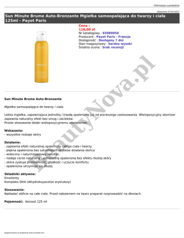 Informacje o produkcie Utworzono 07-03-2017 Sun Minute Brume Auto-Bronzante Mgiełka samoopalająca do twarzy i ciała 125ml - Payot Paris Cena : 116,00 zł ov a. pl Nr katalogowy : 65089050 Producent : Payot Paris - Francja Dostępność : Dostępny 7 dni Stan magazynowy : bardzo wysoki Średnia ocena : brak recenzji Sun Minute Brume Auto-Bronzante yN Mgiełka samoopalająca do twarzy i ciała Wskazania: - wszystkie rodzaje skóry ut Lekka mgiełka, zapewniajaca jednolitą i trwałą opaleniznę już od pierwszego zastosowania. Wielopozycyjny atomizer zapewnia naturalny efekt bez smug i zacieków. Proste stosowanie dzięki wielopozycyjnemu atomizerowi. B ea Działanie: - zapewnia efekt naturalnej opalenizny całego ciała i twarzy - piękna opalenizna bez szkodliwych skutków działania słońca - widoczny i natychmiastowy rezultat. - nadaje cerze naturalną i jednorodną opaleniznę bez efektu tłustej skóry - skóra zyskuje promienność, gładkość i uczucie komfortu - opalenizna utrzymuje się dłużej Składniki aktywne: Emolienty Kompleks DHA (dihydroksyaceton erytrulozy) Stosowanie: Nakładać obficie na całe ciało. Przed nałożeniem na twarz preparat rozprowadzić na dłoniach. Pojemność: Aerosol 125 ml Wygenerowano w programie www.oscGold.com