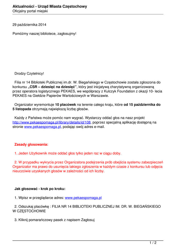 Aktualności - Urząd Miasta Częstochowy Oficjalny portal miejski 29 października 2014 Pomóżmy naszej bibliotece, zagłosujmy! Drodzy Czytelnicy! Filia nr 14 Biblioteki Publicznej im.dr. W. Biegańskiego w Częstochowie została zgłoszona do konkursu „CSR – dziesięć na dziesięć”, który jest inicjatywą charytatywną organizowaną przez operatora logistycznego PEKAES, we współpracy z Kulczyk Foundation z okazji 10- lecia PEKAES na Giełdzie Papierów Wartościowych w Warszawie. Organizator wyremontuje 10 placówek na terenie całego kraju, które od 15 października do 5 listopada otrzymają największą liczbę głosów. Każdy z Państwa może pomóc nam wygrać. Wystarczy oddać głos na nasz projekt http://www.pekaespomaga.pl/library/details/id/108, poprzez specjalną aplikację dostępną na stronie www.pekaespomaga.pl, podając swój adres e-mail. Zasady głosowania: 1. Jeden Użytkownik może oddać głos tylko jeden raz w ciągu doby. 2. W przypadku wykrycia przez Organizatora podejrzenia prób obejścia systemu zabezpieczeń Organizator ma prawo do usunięcia takiego zgłoszenia w każdym czasie z konkursu lub odjęcia nieuczciwie uzyskanych głosów w zależności od ich liczby. Jak głosować - krok po kroku: 1. Wpisz w przeglądarce adres: www.pekaespomaga.pl 2. Odszukaj placówkę : FILIA NR 14 BIBLIOTEKI PUBLICZNEJ IM. DR. W. BIEGAŃSKIEGO W CZĘSTOCHOWIE 3. Kliknij pomarańczowy pasek z napisem Zagłosuj 1/2 Aktualności - Urząd Miasta Częstochowy Oficjalny portal miejski 4. Podaj imię, nazwisko i adres email. 5. Sprawdź swoją pocztę. Powinna pojawić się taka informacja: " Pekaes Pomaga Twój adres email został podany podczas oddawania głosu w portalu Pekaes Pomaga. Głusujesz na: FILIA NR 14 BIBLIOTEKI PUBLICZNEJ IM. DR. W. BIEGAŃSKIEGO W CZĘSTOCHOWIE Aby potwierdzić oddanie głosu kliknij poniższy link http://www.pekaespomaga.pl/site/confirmVote?token=e127d601-fffa-47b0-87a3-3a8f73ffa972 Jeżeli to nie ty oddałeś głos - zignoruj tę wiadomość " 6. Koniecznie kliknij podany w wiadomości link. 7. Jutro znów możesz zagłosować. 8. Ostatni raz zagłosujesz 5 listopada. Prosimy o przekazanie naszej prośby o głosy znajomym i przyjaciołom. Liczy się każdy głos. Dziękujemy. Informacja pochodzi z http://www.biblioteka.czest.pl/wydarzenia/2014/g%C5%82osujemy-nanasz%C4%85-bibliotek%C4%99 Pozostałe aktualności 2/2 Powered by TCPDF (www.tcpdf.org)