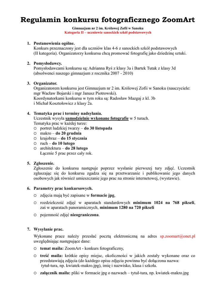 Regulamin konkursu fotograficznego ZoomArt Gimnazjum nr 2 im. Królowej Zofii w Sanoku Kategoria II – uczniowie sanockich szkół podstawowych 1. Postanowienia ogólne. Konkurs przeznaczony jest dla uczniów klas 4-6 z sanockich szkół podstawowych (II kategoria). Organizatorzy konkursu chcą promować fotografię jako dziedzinę sztuki. 2. Pomysłodawcy. Pomysłodawcami konkursu są: Adrianna Ryś z klasy 3a i Bartek Tutak z klasy 3d (absolwenci naszego gimnazjum z rocznika 2007 - 2010) 3. Organizator. Organizatorem konkursu jest Gimnazjum nr 2 im. Królowej Zofii w Sanoku (nauczyciele: mgr Wacław Bojarski i mgr Janusz Piotrowski). Koordynatorkami konkursu w tym roku są: Radosław Mazgaj z kl. 3b i Michał Kosztołowicz z klasy 2a. 4. Tematyka prac i terminy nadsyłania. Uczestnik wysyła samodzielnie wykonane fotografie w 5 turach. Tematyka prac w każdej turze: portret ludzkiej twarzy – do 30 listopada makro – do 20 grudnia krajobraz – do 15 stycznia ruch – do 10 lutego architektura – do 28 lutego Łącznie 5 prac przez cały rok. 5. Zgłoszenie. Zgłoszenie do konkursu następuje poprzez wysłanie pierwszej tury zdjęć. Uczestnik zgłaszając się do konkursu zgadza się na przetwarzanie i publikowanie jego danych osobowych jak również umieszczanie jego prac na stronie internetowej, (wystawie). 6. Parametry prac konkursowych. zdjęcia mają być zapisane w formacie jpg, rozdzielczość zdjęć w aparatach standardowych minimum 1024 na 768 pikseli, zaś w aparatach panoramicznych, minimum 1280 na 720 pikseli pojemność zdjęć nieograniczona. 7. Wysyłanie prac. Wykonane prace należy przesłać pocztą elektroniczną na adres [email protected] uwzględniając następujące dane: temat maila: ZoomArt - konkurs fotograficzny, treść maila: krótkie opisy miejsc, okoliczności w jakich zostały wykonane oraz co przedstawiają zdjęcia (do każdego opisu zdjęcia powinna być dołączona nazwa: tytuł-tura, np. kwiatek-makro.jpg), imię i nazwisko, klasa i szkoła. załącznik maila: pliki w formacie jpg o nazwach – tytuł-tura, np. kwiatek-makro.jpg 8. Jury. W jury obradować będą specjaliści w składzie: - Dorota Bodnar – Foto - Dorota - www.foto-dorota.pl - Piotr Kobiałka – FOTO - VIDEO - www.fotovideo.sanok.pl - Krzysztof Małek – Best Foto Studio Fotografie będą odpowiednio zakodowane, aby prace były rzetelnie oceniane. Po każdej turze fotografie ukażą się na stronie internetowej g2.sanok.pl wraz z wynikami tejże tury. Dzięki temu uczestnicy będą mieli podgląd do wyników, porównania prac i poprawienia pozycji z poprzednich tur. 9. Rozdanie nagród. Ogłoszenie łącznych wyników (z 5 tur) i rozdanie nagród nastąpi podczas FESTIWALU NAUKI w Gimnazjum nr 2 im. Królowej Zofii w Sanoku (marzec). Zwycięzcy konkursu otrzymają z rąk kapituły certyfikat potwierdzający uzyskanie zaszczytnego tytułu FOTOGRAFA ROKU Gimnazjum nr 2 im. Królowej Zofii w Sanoku oraz nagrody rzeczowe. Pozostali laureaci otrzymają nagrody rzeczowe i dyplomy. 11. Informacje dodatkowe. Prace nie mogą podlegać obróbce w programach graficznych. Organizator zastrzega sobie prawo zmiany regulaminu oraz wszelkich jego interpretacji. W razie wątpliwości proszę o kontakt pod numerem: 698768471