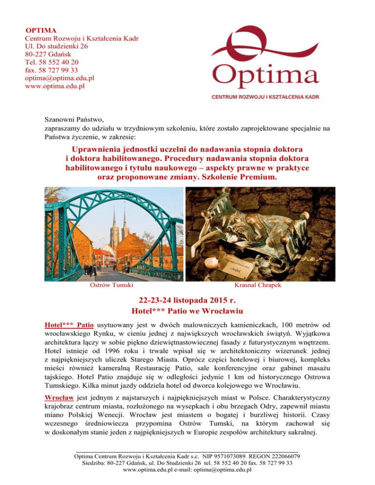 OPTIMA Centrum Rozwoju i Kształcenia Kadr Ul. Do studzienki 26 80-227 Gdańsk Tel. 58 552 40 20 fax. 58 727 99 33 [email protected] www.optima.edu.pl Szanowni Państwo, zapraszamy do udziału w trzydniowym szkoleniu, które zostało zaprojektowane specjalnie na Państwa życzenie, w zakresie: Uprawnienia jednostki uczelni do nadawania stopnia doktora i doktora habilitowanego. Procedury nadawania stopnia doktora habilitowanego i tytułu naukowego – aspekty prawne w praktyce oraz proponowane zmiany. Szkolenie Premium. Ostrów Tumski Krasnal Chrapek 22-23-24 listopada 2015 r. Hotel*** Patio we Wrocławiu Hotel*** Patio usytuowany jest w dwóch malowniczych kamieniczkach, 100 metrów od wrocławskiego Rynku, w cieniu jednej z największych wrocławskich świątyń. Wyjątkowa architektura łączy w sobie piękno dziewiętnastowiecznej fasady z futurystycznym wnętrzem. Hotel istnieje od 1996 roku i trwale wpisał się w architektoniczny wizerunek jednej z najpiękniejszych uliczek Starego Miasta. Oprócz części hotelowej i biurowej, kompleks mieści również kameralną Restaurację Patio, sale konferencyjne oraz gabinet masażu tajskiego. Hotel Patio znajduje się w odległości jedynie 1 km od historycznego Ostrowa Tumskiego. Kilka minut jazdy oddziela hotel od dworca kolejowego we Wrocławiu. Wrocław jest jednym z najstarszych i najpiękniejszych miast w Polsce. Charakterystyczny krajobraz centrum miasta, rozłożonego na wysepkach i obu brzegach Odry, zapewnił miastu miano Polskiej Wenecji. Wrocław jest miastem o bogatej i burzliwej historii. Czasy wczesnego średniowiecza przypomina Ostrów Tumski, na którym zachował się w doskonałym stanie jeden z najpiękniejszych w Europie zespołów architektury sakralnej. _______________________________________________________________________ Optima Centrum Rozwoju i Kształcenia Kadr s.c. NIP 9571073089 REGON 222066079 Siedziba: 80-227 Gdańsk, ul. Do Studzienki 26 tel. 58 552 40 20 fax. 58 727 99 33 www.optima.edu.pl e-mail: [email protected] Ekspert Zajęcia prowadzi adwokat, absolwent Wydziału Prawa i Administracji ówczesnej Filii Uniwersytetu Marii Curie Skłodowskiej w Rzeszowie. Doktor nauk prawnych na Wydziale Prawa i Administracji Uniwersytetu Marii Curie Skłodowskiej w Lublinie. Zainteresowania naukowe koncentruje wokół prawa i postępowania podatkowego, prawa szkolnictwa wyższego, prawa cywilnego oraz autorskiego. Ekspert z zakresu prawa szkolnictwa wyższego. Członek Rady Głównej Nauki i Szkolnictwa Wyższego. Uczestniczył w pracach sejmowej Komisji Edukacji, Nauki i Młodzieży nad ustawą – Prawo o szkolnictwie wyższym. Autor publikacji z zakresu problematyki kariery naukowej i akademickiej. PROGRAM SZKOLENIA DZIEŃ I (22 listopada 2015 r.) 14:00 - zakwaterowanie, 16:00-19:00 - powitanie Uczestników, zajęcia integrujące grupę. 19:30 - kolacja dla osób zakwaterowanych w hotelu. Dzień II (23 listopada 2015 r.) Godz. 9:00 – rozpoczęcie szkolenia: Uprawnienia jednostki uczelni do nadawania stopnia doktora i doktora habilitowanego. 1. Kto może ubiegać się o uzyskanie uprawnień? 2. Wniosek o uzyskanie uprawnień: co jest ważne, a czego należy unikać? 3. Postępowanie przed Centralną Komisją ds. stopni i tytułów naukowych oraz Radą Główną Nauki i Szkolnictwa Wyższego. 4. Zaskarżanie odmownych decyzji Centralnej Komisji. 5. Zawieszenie i utrata uprawnień. 6. "Odzyskiwanie" utraconych uprawnień. 7. Podsumowanie szkolenia i indywidualne konsultacje. Dzień III (24 listopada 2015 r.) Godz. 8:30 – rozpoczęcie szkolenia: Procedury nadawania stopnia doktora habilitowanego i tytułu naukowego – aspekty prawne w praktyce oraz proponowane zmiany. 1. Nadawanie stopnia naukowego doktora habilitowanego: a) warunki uzyskania stopnia doktora habilitowanego, b) przebieg postępowania habilitacyjnego:  wniosek,  czynności dokonywane przez Centralną Komisję do Spraw Stopni i Tytułów,  czynności dokonywane przez komisję habilitacyjną, c) nadanie stopnia naukowego doktora habilitowanego, d) sądowa kontrola przewodu habilitacyjnego. _______________________________________________________________________ Optima Centrum Rozwoju i Kształcenia Kadr s.c. NIP 9571073089 REGON 222066079 Siedziba: 80-227 Gdańsk, ul. Do Studzienki 26 tel. 58 552 40 20 fax. 58 727 99 33 www.optima.edu.pl e-mail: [email protected] 2. Nadawanie uprawnień równoważnych uprawnieniom wynikającym z posiadania stopnia doktora habilitowanego: a) podmioty uprawnione, b) warunki nadania, c) kontrola zasadności nadania uprawnień. 3. Uzyskiwanie tytułu naukowego: a) warunki uzyskania tytułu naukowego, b) postępowanie o nadanie tytułu:  wniosek,  postępowanie przed radą jednostki,  postępowanie przed Centralną Komisją do Spraw Stopni i Tytułów, c) sądowa kontrola postępowania o nadanie tytułu naukowego. 4. Podsumowanie szkolenia i indywidualne konsultacje. Termin: 22-23-24 listopada 2015 r. Miejsce: Hotel*** Patio we Wrocławiu, ul. Kiełbaśnicza 25 Cena promocyjna przy zgłoszeniu do 29 października: 1.665 zł.* Cena regularna: 1.850 zł.* Cena zawiera: - udział w szkoleniu, - materiały szkoleniowe i Certyfikat ukończenia szkolenia, - indywidualne konsultacje z Wykładowcą, - noclegi w pokoju 2-os. (22/23 i 23/24 listopada), dopłata 100 zł do „jedynki”(za pobyt), - pełne wyżywienie (2 śniadania, 3 obiady, 2 kolacje, całodzienny serwis kawowy), - zajęcia integracyjne (m.in. zwiedzania Afrykarium), - prezent od firmy Optima dla każdego Uczestnika. Istnieje możliwość udziału w szkoleniu bez zakwaterowania! Cena promocyjna przy zgłoszeniu do 29 października: 1.170 zł.* Cena regularna: 1.300 zł.* Cena zawiera: udział w szkoleniu, materiały szkoleniowe, Certyfikat, obiady i serwis kawowy w czasie szkolenia oraz konsultacje z Wykładowcą. * szkolenia finansowane ze środków publicznych są zwolnione z podatku VAT. W przypadku uczelni niepublicznych do ceny należy doliczyć 23% VAT. UWAGA! Z