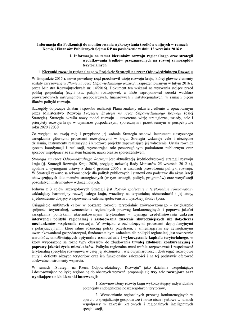 Informacja dla Podkomisji do monitorowania wykorzystania środków unijnych w ramach Komisji Finansów Publicznych Sejmu RP na posiedzenie w dniu 13 września 2016 r. I. Informacja na temat kierunków rozwoju regionalnego oraz strategii wydatkowania środków przeznaczonych na rozwój samorządów terytorialnych 1. Kierunki rozwoju regionalnego w Projekcie Strategii na rzecz Odpowiedzialnego Rozwoju W listopadzie 2015 r. nowo powołany rząd przedstawił wizję rozwoju kraju, której główne elementy zostały zarysowane w Planie na rzecz Odpowiedzialnego Rozwoju, zaprezentowanym w lutym 2016 r. przez Ministra Rozwoju(uchwała nr. 14/2016). Dokument ten wskazał na wyzwania stojące przed polską gospodarką (czyli tzw. pułapki rozwojowe), a także zaproponował szeroki wachlarz prowzrostowych instrumentów gospodarczych, finansowych i instytucjonalnych, w ramach pięciu filarów polityki rozwoju. Szczegóły dotyczące działań i sposobu realizacji Planu znalazły odzwierciedlenie w opracowanym przez Ministerstwo Rozwoju Projekcie Strategii na rzecz Odpowiedzialnego Rozwoju (dalej Strategia). Strategia określa nowy model rozwoju – suwerenną wizję strategiczną, zasady, cele i priorytety rozwoju kraju w wymiarze gospodarczym, społecznym i przestrzennym w perspektywie roku 2020 i 2030. Ze względu na swoją rolę i przypisane jej zadania Strategia stanowi instrument elastycznego zarządzania głównymi procesami rozwojowymi w kraju. Strategia wskazuje cele i niezbędne działania, instrumenty realizacyjne i kluczowe projekty zapewniające jej wdrożenie. Ustala również system koordynacji i realizacji, wyznaczając role poszczególnym podmiotom publicznym oraz sposoby współpracy ze światem biznesu, nauki oraz ze społeczeństwem. Strategia na rzecz Odpowiedzialnego Rozwoju jest aktualizacją średniookresowej strategii rozwoju kraju (tj. Strategii Rozwoju Kraju 2020, przyjętej uchwałą Rady Ministrów 25 września 2012 r.), zgodnie z wymogami ustawy z dnia 6 grudnia 2006 r. o zasadach prowadzenia polityki rozwoju. W Strategii zawarte są rekomendacje dla polityk publicznych i stanowi ona podstawę dla aktualizacji obowiązujących dokumentów strategicznych (w tym strategii, polityk, programów) oraz weryfikacji pozostałych instrumentów wdrożeniowych. Jednym z 3 celów szczegółowych Strategii jest Rozwój społecznie i terytorialnie równoważony zakładający harmonijny rozwój całego kraju, wrażliwy na terytorialną różnorodność i jej atuty, a jednocześnie dbający o zapewnienie całemu społeczeństwu wysokiej jakości życia. Osiągnięcie ambitnych celów w obszarze rozwoju terytorialnie zrównoważonego – zwiększenie spójności terytorialnej, wzmocnienie regionalnych przewag konkurencyjnych i poprawa jakości zarządzania politykami ukierunkowanymi terytorialnie – wymaga zredefiniowania zakresu interwencji polityki regionalnej i zastosowania znacznie skuteczniejszych niż dotychczas mechanizmów wspierania rozwoju. W związku z zachodzącymi procesami depopulacyjnymi i polaryzacyjnymi, które silnie różnicują polską przestrzeń, i zmieniającymi się zewnętrznymi uwarunkowaniami gospodarczymi, fundamentalnym zadaniem dla polityki regionalnej jest stworzenie warunków, umożliwiających optymalne wzmocnienie i wykorzystanie kapitału terytorialnego, w który wyposażone są różne typy obszarów do zbudowania trwałej zdolności konkurencyjnej i poprawy jakości życia mieszkańców. Polityka regionalna musi trafnie rozpoznawać i respektować terytorialną specyfikę rozwojową w całej jej złożoności i wielowymiarowości, dostrzegać rozwojowe atuty i deficyty różnych terytoriów oraz ich funkcjonalne zależności i na tej podstawie oferować adekwatne instrumenty wsparcia. W ramach „Strategii na Rzecz Odpowiedzialnego Rozwoju” jako działania uzupełniające i dostosowujące politykę regionalną do obecnych wyzwań, proponuje się trzy cele rozwojowe oraz wynikające z nich kierunki interwencji: 1. Zrównoważony rozwój kraju wykorzystujący indywidualne potencjały endogeniczne poszczególnych terytoriów, 2. Wzmacnianie regionalnych przewag konkurencyjnych w oparciu o specjalizacje gospodarcze i nowe nisze rynkowe w ramach współpracy w zakresie krajowych i regionalnych inteligentnych specjalizacji, 3. Podniesienie skuteczności i jakości wdrażania polityk ukierunkowanych terytorialnie na wszystkich szczeblach zarządzania. Skuteczne osiąganie celów rozwojowych wymaga dwutorowego działania: stworzenia i wdrożenia nowych mechanizmów i instrumentów o charakterze stricte terytorialnym oraz dostosowania (terytorializacji) tych już istniejących, zwłaszcza sektorowych. Dla zapewnienia optymalnej skuteczności i selektywności działań, integrujących wiązki interwencji sektorowych, wspieranych z różnych źródeł publicznych i angażujących środki prywatne, instrumenty będą łączone w pakiety dedykowane terytoriom będącym adresatami polityki regionalnej. Oczekiwanym rezultatem podjęcia działań jest zwiększenie produktywności (wydajności) pracy i zmniejszenie jej zróżnicowań regionalnych dzięki zwiększeniu inwestycji w różnych sektorach. Natomiast dzięki inwestycjom w Polsce Wschodniej makroregion ten będzie rozwijał się szybciej, przez co wzrośnie jego udział w tworzeniu PKB. Rozwój przedsiębiorczości i tworzenie miejsc pracy, szczególnie na obszarach najbiedniejszych i borykających się z problemami strukturalnymi doprowadzi do zmniejszenia zróżnicowań w poziomie dochodów ich mieszkańców i samorządów terytorialnych. Wzmacnianie współpracy pomiędzy samorządami w miejskich obszarach funkcjonalnych przyczyni się do poprawy jakości zarządzania tymi obszarami, w tym zapobiegania żywiołowej suburbanizacji. 2. Wykorzystanie funduszy europejskich w latach 2007-2013 w podziale na regiony REALIZACJA PROGRAMÓW REGIONALNYCH W latach 2007-2013 samorządy województw samodzielnie zarz