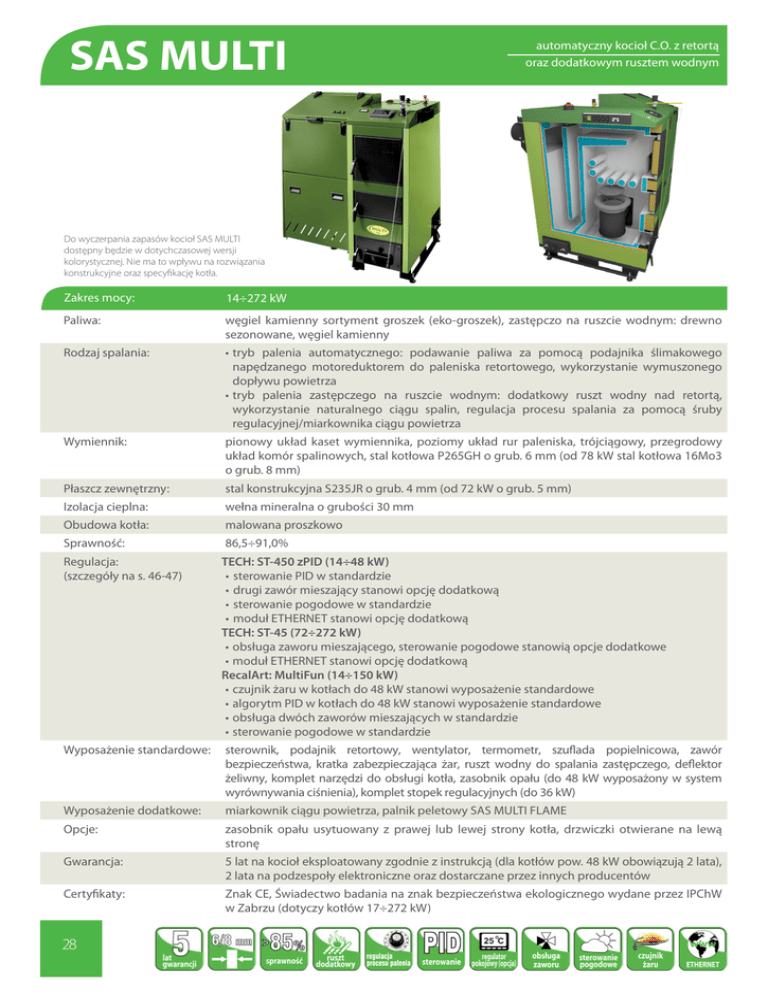 SAS MULTI automatyczny kocioł C.O. z retortą oraz dodatkowym rusztem wodnym Do wyczerpania zapasów kocioł SAS MULTI dostępny będzie w dotychczasowej wersji kolorystycznej. Nie ma to wpływu na rozwiązania konstrukcyjne oraz specyfikację kotła. Zakres mocy: 14÷272 kW Paliwa: węgiel kamienny sortyment groszek (eko-groszek), zastępczo na ruszcie wodnym: drewno sezonowane, węgiel kamienny Rodzaj spalania: •tryb palenia automatycznego: podawanie paliwa za pomocą podajnika ślimakowego napędzanego motoreduktorem do paleniska retortowego, wykorzystanie wymuszonego dopływu powietrza •tryb palenia zastępczego na ruszcie wodnym: dodatkowy ruszt wodny nad retortą, wykorzystanie naturalnego ciągu spalin, regulacja procesu spalania za pomocą śruby regulacyjnej/miarkownika ciągu powietrza Wymiennik: pionowy układ kaset wymiennika, poziomy układ rur paleniska, trójciągowy, przegrodowy układ komór spalinowych, stal kotłowa P265GH o grub. 6 mm (od 78 kW stal kotłowa 16Mo3 o grub. 8 mm) Płaszcz zewnętrzny: stal konstrukcyjna S235JR o grub. 4 mm (od 72 kW o grub. 5 mm) Izolacja cieplna: wełna mineralna o grubości 30 mm Obudowa kotła: malowana proszkowo Sprawność: 86,5÷91,0% Regulacja: (szczegóły na s. 46-47) TECH: ST-450 zPID (14÷48 kW) • sterowanie PID w standardzie • drugi zawór mieszający stanowi opcję dodatkową • sterowanie pogodowe w standardzie • moduł ETHERNET stanowi opcję dodatkową TECH: ST-45 (72÷272 kW) •obsługa zaworu mieszającego, sterowanie pogodowe stanowią opcje dodatkowe •moduł ETHERNET stanowi opcję dodatkową RecalArt: MultiFun (14÷150 kW) •czujnik żaru w kotłach do 48 kW stanowi wyposażenie standardowe •algorytm PID w kotłach do 48 kW stanowi wyposażenie standardowe •obsługa dwóch zaworów mieszających w standardzie •sterowanie pogodowe w standardzie Wyposażenie standardowe: sterownik, podajnik retortowy, wentylator, termometr, szuflada popielnicowa, zawór bezpieczeństwa, kratka zabezpieczająca żar, ruszt wodny do spalania zastępczego, deflektor żeliwny, komplet narzędzi do obsługi kotła, zasobnik opału (do 48 kW wyposażony w system wyrównywania ciśnienia), komplet stopek regulacyjnych (do 36 kW) Wyposażenie dodatkowe: miarkownik ciągu powietrza, palnik peletowy SAS MULTI FLAME Opcje: zasobnik opału usytuowany z prawej lub lewej strony kotła, drzwiczki otwierane na lewą stronę Gwarancja: 5 lat na kocioł eksploatowany zgodnie z instrukcją (dla kotłów pow. 48 kW obowiązują 2 lata), 2 lata na podzespoły elektroniczne oraz dostarczane przez innych producentów Certyfikaty: Znak CE, Świadectwo badania na znak bezpieczeństwa ekologicznego wydane przez IPChW w Zabrzu (dotyczy kotłów 17÷272 kW) 28