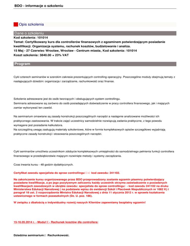 BDO - informacje o szkoleniu Opis szkolenia Dane o szkoleniu Kod szkolenia: 101014 Temat: Certyfikowany kurs dla controllerów finansowych z egzaminem potwierdzającym posiadanie kwalifikacji. Organizacja systemu, rachunek kosztów, budżetowanie i analiza. 15 Maj - 27 Czerwiec Wrocław, Wrocław - Centrum miasta, Kod szkolenia: 101014 Koszt szkolenia: 3840.00 + 23% VAT Program Cykl czterech seminariów w szerokim zakresie prezentujących controlling operacyjny. Poszczególne moduły obejmują tematy z następujących dziedzin: organizacja i zarządzanie, rachunkowość oraz finanse. Szkolenie adresowane jest do osób tworzących i obsługujących system controllingu. Seminaria adresowane są zarówno do osób posiadających doświadczenie w pracy controllera finansowego, jak i mających zamiar wykonywać ten zawód. Na seminarium omawiane są zasady konstrukcji poszczególnych narzędzi a następnie analizowane możliwości ich praktycznego zastosowania. W trakcie zajęć uczestnicy samodzielnie rozwiązują zadania praktyczne, z tego powodu wymagane jest posiadanie kalkulatora. Na szczególną uwagę zasługują materiały szkoleniowe, które w formie kompleksowych opisów szczegółowo wyjaśniają praktyczne zasady konstrukcji i stosowania poszczególnych narzędzi. Cykl seminariów umożliwia uczestnikom zdobycie kompleksowych umiejętności do samodzielnego pełnienia funkcji controllera finansowego w przedsiębiorstwie mającym rozwinięte metody i systemy zarządzania. Czas trwania kursu - 48 godzin dydaktycznych. Certyfikat zawodu specjalista do spraw controllingu - kod zawodu: 241102. Na zakończenie kursu organizowanego przez BDO przeprowadzony zostanie egzamin pisemny potwierdzający posiadane kwalifikacje, a po jego pozytywnym zaliczeniu każdy uczestnik otrzyma zaświadczenie o posiadanych kwalifikacjach zawodowych w obrębie zawodu: specjalista do spraw controllingu - kod zawodu 241102 na druku Ministerstwa Edukacji Narodowej ( na podstawie wpisu do ewidencji Szkół i Placówek Niepublicznych nr 1082 K) i paragraf 18 ust. 2 rozporządzenia Ministra Edukacji Narodowej z dnia 11 stycznia 2012 r. w sprawie kształcenia ustawicznego w formach pozaszkolnych (Dz. U. poz. 186). W związku z dbałością o indywidualny rozwój naszych Klientów zapewniamy bezpłatny egzamin! 15-16.05.2014 r. - Moduł I - Rachunek kosztów dla controllera: Dziedzina seminarium: Rachunkowość. BDO - informacje o szkoleniu Cel seminarium: Prezentacja zasad modyfikacji systemu rachunkowości finansowej w kierunku jego przystosowania do wymogów controllingu. Opis seminarium: Wdrożenie systemów controllingu i budżetowania wymusza zmiany w rachunkowości finansowej. Seminarium prezentuje kompleksowo najnowsze rozwiązania w tym zakresie od księgowania dokumentów pierwotnych poprzez system rozliczeń kosztów aż do tworzenia kalkulacyjnego rachunku zysków i strat. Uczestnicy: Pracownicy działów controllingu, analiz finansowych oraz księgowości. Program seminarium: 1. System rachunkowości finansowej a budżetowanie - charakterystyka systemu rachunkowości finansowej proces i funkcje budżetu analiza realizacji funkcji budżetowania przez system rachunkowości finansowej identyfikacja różnic obu systemów 2. Typ działalności dodatkowym wymiarem analizy danych o kosztach wynikający z potrzeb budżetowania - wady analizy kosztów wyłącznie według mpk i rodzaju (konta zespołu 4 i 5) identyfikacja typów działalności zgodnie z: zakresem odpowiedzialności realizowanymi procesami strategiami dziedzinowymi modyfikacja planu nu kont do potrzeb budżetowania 3. Identyfikacja centrów kosztów według reguł rachunkowości finansowej i budżetowania według wymogów - rachunkowości finansowej w celu rozliczenia kosztów w ramach procesów kalkulacji. - budżetowania z uwzględnieniem zakresów odpowiedzialności za koszty i realizacji zadań związanych z optymalizacją procesów 4. Działalność pomocnicza - techniczne metody rozliczeń kosztów według wymogów budżetowania i ich dobór do specyfiki rozliczanych kosztów - przykładowe wzorcowe scenariusze rozliczeń kosztów działalności pomocniczej zgodnej z zasadami rachunkowości finansowej i budżetowania: - nieruchomości, informatyka, flota samochodowa, itp. - wieloparametrowe metody rozliczeń kosztów działalności pomocniczej 5. Działalność podstawowa, zasady identyfikacji centów kosztów i metod ich rozliczeń BDO - informacje o szkoleniu - osobowe centra kosztów - sprzętowe centra kosztów - administracyjne centra kosztów 6. Koszty wydziałowe: - zasady identyfikacji według wymogów rachunkowości finansowej i budżetowania koszty wydziałowe zmienne i stałe koszty wydziałowe stopnia I - gniazd produkcyjnych koszty wydziałowe stałe stopnia II - ogólnowydziałowe 7. Koszty niewykorzystanego potencjału: - obszary identyfikacji kosztów niewystanego potencjału według reguł rachunkowości finansowej i zarządczej. - metody techniczne identyfikacji kosztów niewykorzystanego potencjału - klasyfikacja kosztów niewykorzystanego potencjału na zwiększające standard działalności, związane z utrzymaniem gotowości oraz rzeczywiście wynikające z niewykorzystanego potencjału, - zasady identyfikacji kosztów niewykorzystanego potencjału na kontach księgowych według zasad rachunkowości finansowej i zarządczej - prezentacja kosztów niewykorzystanego potencjału w rachunku zysków i strat według zasad rachunkowości zarządczej. - wskaźniki określające stopień wykorzystania potencjału 29-30.05.2014 - Moduł III - Budżetowanie: Dziedzina seminarium: Finanse Cel seminarium: Prezentacja reguł budżetowania oraz metod tworzenia budżetu jednostek organizacyjnych. Opis seminarium: Seminarium przedstawia zasady tworzenia i zarządzania budżetem. Omawiane są na nim metody planowania oraz reguły tworzenia budżetów pojedynczych centrów odpowiedzialności. Zaprezentowane techniki odpowiadają wymogom