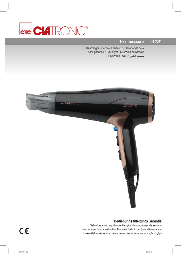 HAARTROCKNER HT 3661 Haardroger • Séchoir à cheveux • Secador de pelo $VFLXJDFDSHOOL+DLUGU\HU6XV]DUNDGRZáRVyZ +DMV]iUtWyɎɟɧ Bedienungsanleitung / Garantie Gebruiksaanwijzing • Mode d’emploi • Instrucciones de servicio ,VWUX]LRQLSHUO¶XVR,QVWUXFWLRQ0DQXDO,QVWUXNFMDREVáXJL*ZDUDQFMD +DV]QiODWLXWDVtWiVɊɭɤɨɜɨɞɫɬɜɨɩɨɷɤɫɩɥɭɚɬɚɰɢɢ HT3661_IM 07.07.16 ,QVWUXNFMDREVâXJL ']LĊNXMHP\]DZ\EyUQDV]HJRSURGXNWX0DP\QDG]LHMĊĪH NRU]\VWDQLH]XU]ąG]HQLDVSUDZL3DĔVWZXUDGRĞü 6\PEROHXī\WHZWHMLQVWUXNFMLREVâXJL :DĪQHLQIRUPDFMHGRW\F]ąFHEH]SLHF]HĔVWZDXĪ\WNRZQLNDVą VSHFMDOQLHZ\UyĪQLRQH.RQLHF]QLHVWRVXMVLĊGRW\FKZVND]y ZHNDE\XQLNQąüZ\SDGNyZLXV]NRG]HQLDXU]ąG]HQLD 2675=(Ī(1,( 2VWU]HJDSU]HG]DJURĪHQLDPLGOD]GURZLDLZVND]XMHQD SRWHQFMDOQHU\]\NDREUDĪHĔ UWAGA: :VND]XMHQDSRWHQFMDOQH]DJURĪHQLDGODXU]ąG]HQLDOXE LQQ\FKSU]HGPLRWyZ WSKAZÓWKA: :\UyĪQLDSRUDG\LLQIRUPDFMHZDĪQHGODXĪ\WNRZQLND Ogólne uwagi 3U]HGXUXFKRPLHQLHPXU]ąG]HQLDSURV]ĊEDUG]RGRNáDGQLH SU]HF]\WDüLQVWUXNFMĊREVáXJL3URV]Ċ]DFKRZDüMąZUD]] NDUWąJZDUDQF\MQąSDUDJRQHPLZPLDUĊPRĪOLZRĞFLUyZQLHĪ NDUWRQHP]RSDNRZDQLHPZHZQĊWU]Q\P3U]HND]XMąFXU]ą G]HQLHLQQHMRVRELHRGGDMMHMWDNĪHLQVWUXNFMĊREVáXJL • 3URV]ĊZ\NRU]\VW\ZDüXU]ąG]HQLHMHG\QLHGODSU\ZDWQHJR FHOXMDNL]RVWDáSU]HZLG]LDQ\GODXU]ąG]HQLD8U]ąG]HQLH WRQLH]RVWDáRSU]HZLG]LDQHGRXĪ\WNXZUDPDFKG]LDáDOQR ĞFLJRVSRGDUF]HM • 3URV]ĊQLHNRU]\VWDü]XU]ąG]HQLDQD]HZQąWU]3URV]Ċ WU]\PDüXU]ąG]HQLH]GDOHNDRGFLHSáDEH]SRĞUHGQLHJR SURPLHQLRZDQLDVáRQHF]QHJRZLOJRFLZĪDGQ\PZ\SDG NXQLH]DQXU]DüZVXEVWDQFMDFKSá\QQ\FKRUD]RVWU\FK NUDZĊG]L3URV]ĊQLHREVáXJLZDüXU]ąG]HQLDZLOJRWQ\PL GáRĔPL-HĪHOLXU]ąG]HQLHMHVWZLOJRWQHOXEPRNUHSURV]Ċ QDW\FKPLDVWZ\FLąJQąüZW\F]NĊQDOHĪ\FLąJQąü]DZW\F] NĊQLH]DSU]HZyG • -HĪHOLQLHNRU]\VWDFLH3DĔVWZR]XU]ąG]HQLDMHĪHOLFKFHFLH 3DĔVWZR]DPRQWRZDüMDNLHĞDNFHVRULDZFHOXZ\F]\V] F]HQLDOXEZSU]\SDGNXMDNLFKNROZLHN]DNáyFHĔSURV]Ċ ]DZV]HZ\áąF]\üXU]ąG]HQLHLZ\MąüZW\F]NĊ]JQLD]GND • 3UDFXMąFHJRXU]ąG]HQLDnieQDOHĪ\SR]RVWDZLDüEH] QDG]RUX3U]HGRSXV]F]HQLHPSRPLHV]F]HQLDXU]ąG]HQLH QDOHĪ\]DZV]HZ\áąF]DüLZ\FLąJDüZW\F]NĊVLHFLRZą] gniazda. • 1DOHĪ\UHJXODUQLHVSUDZG]DüF]\XU]ąG]HQLHLNDEHO VLHFLRZ\QLHVąXV]NRG]RQH:UD]LHXV]NRG]HQLDQDOHĪ\ SU]HVWDüNRU]\VWDü]XU]ąG]HQLD • 3URV]ĊVWRVRZDüW\ONRRU\JLQDOQHDNFHVRULD • 'ODEH]SLHF]HĔVWZDG]LHFLSURV]ĊQLH]RVWDZLDüVZR ERGQLHGRVWĊSQ\FKF]ĊĞFLRSDNRZDQLDWRUE\SODVWLNRZH kartony, styropian itp.). 2675=(Ī(1,( 1LHSR]ZDODMG]LHFLRPEDZLüVLĊIROLą1LHEH]SLHF]Hĕ stwo uduszenia! 6SHFMDOQHZVND]yZNL]ZLĆ]DQH]EH]SLHF]QĆ REVâXJĆWHJRXU]ĆG]HQLD Symbole na produkcie 1DSURGXNFLHXPLHV]F]RQHVąV\PEROHRVWU]HJDZF]HLLQIRUPDF\MQH Przeczytaj instrukcje! 2675=(Ī(1,(202Ī/,:2Ğ&,325$Ī(1,$ ELEKTRYCZNEGO! 8U]ąG]HQLDQLHZROQRXĪ\ZDüZSREOLĪXZDQLHQXP\ZDOHN OXELQQ\FKSRMHPQLNyZ]ZRGą 26 HT3661_IM 07.07.16 2675=(Ī(1,( • -HĞOLNRU]\VWDP\]XU]ąG]HQLDZáD]LHQFHQDOHĪ\RGáąF]\üMHRG VLHFLSRXĪ\FLXMDNRĪHZRGDSRZRGXMHQLHEH]SLHF]HĔVWZR0DWR ]DVWRVRZDQLHUyZQLHĪJG\XU]ąG]HQLHMHVWZ\áąF]RQH • -DNRGRGDWNRZH]DEH]SLHF]HQLH]DOHFDVLĊ]DLQVWDORZDQLHZREZRG]LHHOHNWU\F]Q\PáD]LHQNLXU]ąG]HQLDRFKURQQHJRSUąGRZHJR ),5&']SUąGHPSRPLDURZ\PQLHZLĊNV]\PQLĪP$3URV]Ċ ]DVLĊJQąüSRUDG\DXWRU\]RZDQHJRLQVWDODWRUDXU]ąG]HĔHOHNWU\F]nych. • '\V]DVWDMHVLĊJRUąFDSRGF]DVSUDF\XU]ąG]HQLDRyzyko opaU]Hĕ • 8ZDĪDMDE\¿OWUVVąF\QLHE\á]DWNDQ\VWU]ĊSNDPLOXEZáRVDPL 1LHEH]SLHF]HĕVWZRSRīDUX • 1LHSUyERZDüQDSUDZLDüXU]ąG]HQLDVDPRG]LHOQLH6NRQWDNWRZDü VLĊ]SUDFRZQLNLHPDXWRU\]RZDQHJRVHUZLVX-HĞOLSU]HZyG]DVLODQLDMHVWXV]NRG]RQ\QDOHĪ\JRZ\PLHQLüXSURGXFHQWDSU]HGVWDZLFLHODVHUZLVXOXESRGREQLHZ\NZDOL¿NRZDQHMRVRE\DE\XQLNQąü ]DJURĪHQLD • =XU]ąG]HQLDPRJąNRU]\VWDüdzieciRGURNXĪ\FLDRUD]RVRE\] RJUDQLF]RQ\PL]GROQRĞFLDPL¿]\F]Q\PLVHQVRU\F]Q\PLOXESV\FKLF]Q\PLDOEREUDNLHPGRĞZLDGF]HQLDSRGZDUXQNLHPĪHVąRQH QDG]RURZDQHOXERWU]\PDá\LQVWUXNFMHMDNNRU]\VWDübezpiecznie z XU]ĆG]HQLDLUR]XPLHMą]ZLą]DQH]W\PU\]\NR • DzieciomQLHZROQREDZLüVLĊXU]ąG]HQLHP • &]\V]F]HQLHOXENRQVHUZDFMDGRNRQDQDSU]H]Xī\WNRZQLND nie PRJąE\üSU]HSURZDG]DQHSU]H]dzieciFK\EDĪHSRGVWRVRZQ\P nadzorem. • 8U]ąG]HQLDQLHQDOHĪ\]DQXU]DüZZRG]LHSRGF]DVF]\V]F]HQLD 3U]HVWU]HJDüLQVWUXNFML]DáąF]RQHMZUR]G]LDOHÄ&]\V]F]HQLH´ 27 HT3661_IM 07.07.16 :VND]yZNLGRW\F]ĆFHXī\WNRZDQLD • :SU]\SDGNXSRWU]HE\VXV]HQLDW\ONRRNUHĞORQ\FKF]ĊĞFL IU\]XU\QDOHĪ\]DáRĪ\üG\V]ĊGRVW\OL]DFML7RVSRZRGXMH VNRQFHQWURZDQ\SU]HSá\ZVWUXPLHQLDSRZLHWU]D • $E\]GMąüG\V]ĊQDMSLHUZQDOHĪ\VFKáRG]LüXU]ąG]HQLH 0RĪQDWHQSURFHVSU]\VSLHV]\üSU]H]QDFLĞQLĊFLHSU]\cisku SU]H]RNòPLQXW\ZWUDNFLHSUDF\XU]ąG]HQLD 1DVWĊSQLHPRĪQD]GMąüG\V]Ċ 3RGâĆF]HQLHHOHNWU\F]QH • =DQLPSRáąF]\FLH3DĔVWZRZW\F]NĊ]JQLD]GNLHPSURV]Ċ VSUDZG]LüF]\QDSLĊFLHVLHFLMHVW]JRGQH]QDSLĊFLHP XU]ąG]HQLD2GSRZLHGQLHLQIRUPDFMH]QDMGą3DĔVWZRQD WDEOLF]FHLGHQW\¿NDF\MQHMXU]ąG]HQLD • 3RGáąF]\üXU]ąG]HQLHGRSUDZLGáRZR]DLQVWDORZDQHJR uziemionego gniazdka. 8ī\WNRZDQLH 1. :áąF]\üXU]ąG]HQLH]DSRPRFąGROQHJRSU]HáąF]QLNDQD uchwycie. 2. :\ELHU]QDXFKZ\FLHVWRSLHĔGPXFKDZ\GROQ\ SU]HáąF]QLN Pozycja 0 Z\áąF]RQH Pozycja áDJRGQ\VWUXPLHĔ Pozycja VLOQ\VWUXPLHĔ 3. 8VWDZLDQLHĪąGDQHJRVWRSQLDQDJU]HZQLF\JyUQ\ SU]HáąF]QLN Pozycja : niska temperatura Pozycja ĞUHGQLDWHPSHUDWXUDGRáDJRGQHJR VXV]HQLDLXNáDGDQLD Pozycja : wysoka temperatura do szybkiego suszenia. COOL SHOT (zimne powietrze) 7\PSU]\FLVNLHPPRĪQDSU]HUZDüQDJU]HZDQLH 3U]\WU]\PDMZFLĞQLĊW\SU]\FLVNZWHMSR]\FMLRGSRZLHGQLR GRSRĪąGDQHMGáXJRĞFLLQWHUZDáX3RSXV]F]HQLXSU]\FLVN SRZUDFDDXWRPDW\F]QLHGRSRáRĪHQLDZ\MĞFLRZHJR Funkcja jonizacji – 5HGXNFMDHOHNWU\]RZDQLDVLċZâRVyZ 8U]ąG]HQLHZ\SRVDĪRQHMHVWUyZQLHĪZMRQL]DWRUNWyU\ SU]\ZáąF]DQLXHPLWXMHMRQ\XMHPQHZUD]]SRGPXFKHP SRZLHWU]D7HQSURFHVXáDWZLDEH]SLHF]QHGHOLNDWQHVXV]HQLH ZáRVyZLUyZQLHĪ]DSHZQLDOHSV]ąVWUXNWXUĊZáRVD]ZLĊNV]D REMĊWRĞüZáRVyZ]DSHZQLDMHGZDELVWRĞüNRĔFyZHNLUHGXNXMH]MDZLVNRHOHNWU\]RZDQLDVLĊZáRVyZ 7HQSURFHVMHVWZV]F]HJyOQRĞFLGHOLNDWQ\QDQDSUĊĪRQ\FK ZáRVDFK :\âĆF]DQLH 8VWDZLüSU]HáąF]QLNZSR]\FMLÄ0´SRXĪ\