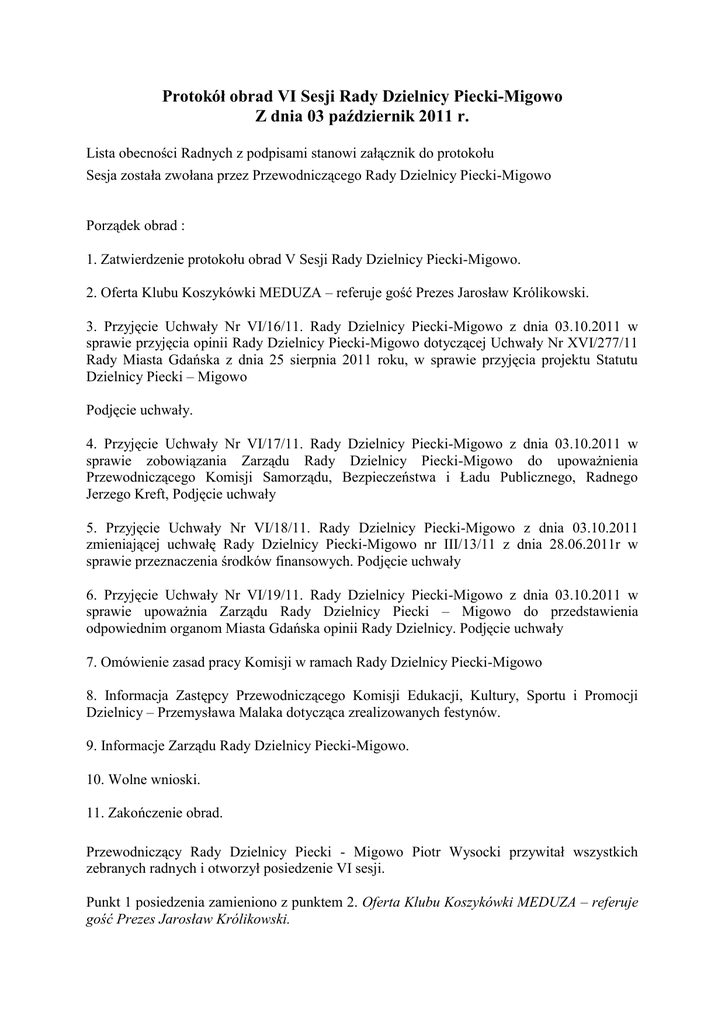 Protokół obrad VI Sesji Rady Dzielnicy Piecki-Migowo Z dnia 03 październik 2011 r. Lista obecności Radnych z podpisami stanowi załącznik do protokołu Sesja została zwołana przez Przewodniczącego Rady Dzielnicy Piecki-Migowo Porządek obrad : 1. Zatwierdzenie protokołu obrad V Sesji Rady Dzielnicy Piecki-Migowo. 2. Oferta Klubu Koszykówki MEDUZA – referuje gość Prezes Jarosław Królikowski. 3. Przyjęcie Uchwały Nr VI/16/11. Rady Dzielnicy Piecki-Migowo z dnia 03.10.2011 w sprawie przyjęcia opinii Rady Dzielnicy Piecki-Migowo dotyczącej Uchwały Nr XVI/277/11 Rady Miasta Gdańska z dnia 25 sierpnia 2011 roku, w sprawie przyjęcia projektu Statutu Dzielnicy Piecki – Migowo Podjęcie uchwały. 4. Przyjęcie Uchwały Nr VI/17/11. Rady Dzielnicy Piecki-Migowo z dnia 03.10.2011 w sprawie zobowiązania Zarządu Rady Dzielnicy Piecki-Migowo do upoważnienia Przewodniczącego Komisji Samorządu, Bezpieczeństwa i Ładu Publicznego, Radnego Jerzego Kreft, Podjęcie uchwały 5. Przyjęcie Uchwały Nr VI/18/11. Rady Dzielnicy Piecki-Migowo z dnia 03.10.2011 zmieniającej uchwałę Rady Dzielnicy Piecki-Migowo nr III/13/11 z dnia 28.06.2011r w sprawie przeznaczenia środków finansowych. Podjęcie uchwały 6. Przyjęcie Uchwały Nr VI/19/11. Rady Dzielnicy Piecki-Migowo z dnia 03.10.2011 w sprawie upoważnia Zarządu Rady Dzielnicy Piecki – Migowo do przedstawienia odpowiednim organom Miasta Gdańska opinii Rady Dzielnicy. Podjęcie uchwały 7. Omówienie zasad pracy Komisji w ramach Rady Dzielnicy Piecki-Migowo 8. Informacja Zastępcy Przewodniczącego Komisji Edukacji, Kultury, Sportu i Promocji Dzielnicy – Przemysława Malaka dotycząca zrealizowanych festynów. 9. Informacje Zarządu Rady Dzielnicy Piecki-Migowo. 10. Wolne wnioski. 11. Zakończenie obrad. Przewodniczący Rady Dzielnicy Piecki - Migowo Piotr Wysocki przywitał wszystkich zebranych radnych i otworzył posiedzenie VI sesji. Punkt 1 posiedzenia zamieniono z punktem 2. Oferta Klubu Koszykówki MEDUZA – referuje gość Prezes Jarosław Królikowski. Jarosław Królikowski przedstawiał nam zalety uprawiania sportu wśród młodzieży, mówił o braku wsparcia finansowego na klub Meduza. Rada Dzielnicy Piecki-Migowo jednogłośnie wyraziła chęć pomocy. Zadeklarowano, iż będziemy rozmawiać z wyższymi organami władzy o dofinansowaniu oraz będziemy w stałym kontakcie z prezesem Królikowskim. Zatwierdzenie protokołu obrad V Sesji Rady Dzielnicy Piecki-Migowo. Zatwierdzono protokół obrad V sesji bez zastrzeżeń. 10 osób – głosowało za 1 osoba – głosowała przeciw Przyjęcie Uchwały Nr VI/16/11. Rady Dzielnicy Piecki-Migowo z dnia 03.10.2011 w sprawie przyjęcia opinii Rady Dzielnicy Piecki-Migowo dotyczącej Uchwały Nr XVI/277/11 Rady Miasta Gdańska z dnia 25 sierpnia 2011 roku, w sprawie przyjęcia projektu Statutu Dzielnicy Piecki – Migowo Toczyła się dyskusja nad treścią uchwały. Podjęto wniosek, aby zagłosować nad treścią uchwały. 10 osób – głosowało za 1 osoba – głosowała przeciw 1 osoba – wstrzymała się od głosu Następnie Rada Dzielnicy Piecki-Migowo głosowała nad przyjęciem uchwały Nr VI/16/11 11 osób – głosowało za 1 osoba – głosowała przeciw Przyjęcie Uchwały Nr VI/17/11. Rady Dzielnicy Piecki-Migowo z dnia 03.10.2011 w sprawie zobowiązania Zarządu Rady Dzielnicy Piecki-Migowo do upoważnienia Przewodniczącego Komisji Samorządu, Bezpieczeństwa i Ładu Publicznego, Radnego Jerzego Kreft, Podjęcie uchwały Krótka dyskusja nad treścią uchwały. Uchwała podjęta jednogłośnie – 12 osób głosowało za. Przyjęcie Uchwały Nr VI/18/11. Rady Dzielnicy Piecki-Migowo z dnia 03.10.2011 zmieniającej uchwałę Rady Dzielnicy Piecki-Migowo nr III/13/11 z dnia 28.06.2011r w sprawie przeznaczenia środków finansowych. Podjęcie uchwały Treść : „Obsługa Internetowa Rady Dzielnicy Piecki-Migowo (strona www i adresy e-mail dla Radnych), Kwota – 4.000,00 zł” Zamieniono na : Działalność informacyjna Rady Dzielnicy Piecki-Migowo (obsługa internetowa w tym strona www, druk ulotek i plakatów, artykuły sponsorowane i ogłoszenia w mediach, itp.). Przewodniczący Zarządu Dzielnicy Florian Wojciechowski złożył wniosek w sprawie podziału środków finansowych z rezerwy Zarządu Dzielnicy Piecki-Migowo. Zarząd wnioskuje aby przeznaczyć te środki na zakup artykułów higienicznych i pomocy dydaktyczne do przedszkola nr 75 w dzielnicy Piecki – Migowo przy ulicy Wileńskiej. Przewodniczący przedstawił również wniosek o podział środków finansowych na wykonanie i administrowanie www. Dzielnicy w wysokości 2.583,00 zł, pozostałą kwotę przeznaczyć na działalność informacyjną, plakaty itp. kwota : 1,417.00 zł Rada Dzielnicy Piecki-Migowo głosowała nad przyjęciem uchwały Nr VI/18/11. 11 osób - głosowało za 1 głosowała - przeciw Przyjęcie Uchwały Nr VI/19/11. Rady Dzielnicy Piecki-Migowo z dnia 03.10.2011 w sprawie upoważnia Zarządu Rady Dzielnicy Piecki – Migowo do przedstawienia odpowiednim organom Miasta Gdańska opinii Rady Dzielnicy. Podjęcie uchwały Dyskusja na temat informowania o działalności w poszczególnych komisjach oraz o publikowanie opinii komisji. Zapadła propozycja (wniosek formalny), aby najpierw przedłożyć opinię wszystkim członkom rady dzielnicy Piecki-Migowo, a następnie głosować nad przyjęciem uchwały. Wniosek poddano pod głosowanie. 2 osoby – głosowały za 3 osoby – wstrzymujące się od głosu 8 osób – głosowało przeciw Następnie Rada Dzielnicy Piecki-Migowo głosowała nad przyjęciem uchwały Nr VI/19/11 10 osób – głosowało za 1 osoba – głosowała przeciw 2 osoby – wstrzymujące się od głosu Omówienie zasad pracy Komisji w ramach Rady Dzielnicy Piecki-Migowo Postanowiono stworzyć wewnętrzne regulaminy, które będą wskazywały jak powinny działać komisje (terminy dostarczania protokołów, publikowanie). Postanowiono także stworz