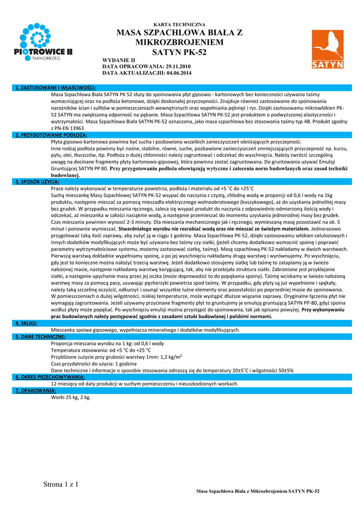 KARTA TECHNICZNA MASA SZPACHLOWA BIAŁA Z MIKROZBROJENIEM SATYN PK-52 WYDANIE II DATA OPRACOWANIA: 29.11.2010 DATA AKTUALIZACJII: 04.06.2014 1. ZASTOSOWANE I WŁAŚCIWOŚCI: Masa Szpachlowa Biała SATYN PK 52 służy do spoinowania płyt gipsowo - kartonowych bez konieczności używania taśmy wzmacniającej oraz na podłoża betonowe, dzięki doskonałej przyczepności. Znajduje również zastosowanie do spoinowania narożników ścian i sufitów w pomieszczeniach wewnętrznych oraz wypełniania pęknięć i rys. Dzięki zastosowaniu mikrowłókien PK52 SATYN ma zwiększoną odporność na pękanie. Masa Szpachlowa SATYN PK-52 jest produktem o podwyższonej elastyczności i wytrzymałości. Masa Szpachlowa Biała SATYN PK-52 oznaczona, jako masa szpachlowa bez stosowania taśmy typ 4B. Produkt zgodny z PN-EN 13963 2. PRZYGOTOWANIE PODŁOŻA: Płyta gipsowo-kartonowa powinna być sucha i pozbawiona wszelkich zanieczyszczeń obniżających przyczepność. Inne rodzaj podłoża powinny być nośne, stabilne, równe, suche, pozbawione zanieczyszczeń zmniejszających przyczepność np. kurzu, pyłu, olei, tłuszczów, itp. Podłoża o dużej chłonności należy zagruntować i odczekać do wyschnięcia. Należy zwrócić szczególną uwagę na docinane fragmenty płyty kartonowo-gipsowej, która powinna zostać zagruntowana. Do gruntowania używać Emulsji Gruntującej SATYN PP 80. Przy przygotowaniu podłoża obowiązują wytyczne i zalecenia norm budowlanych oraz zasad techniki budowlanej. 3. SPOSÓB UŻYCIA: Prace należy wykonywać w temperaturze powietrza, podłoża i materiału od +5 ˚C do +25˚C Suchą mieszankę Masy Szpachlowej SATYN PK-52 wsypać do naczynia z czystą, chłodną wodą w proporcji od 0,6 l wody na 1kg produktu, następnie mieszać za pomocą mieszadła elektrycznego wolnoobrotowego (koszykowego), aż do uzyskania jednolitej masy bez grudek. W przypadku mieszania ręcznego, zaleca się wsypać produkt do naczynia z odpowiednio odmierzoną ilością wody i odczekać, aż mieszanka w całości nasiąknie wodą, a następnie przemieszać do momentu uzyskania jednorodnej masy bez grudek. Czas mieszania powinien wynosić 2-3 minuty. Dla mieszania mechanicznego jak i ręcznego, wymieszaną masę pozostawić na ok. 5 minut i ponownie wymieszać. Stwardniałego wyrobu nie rozrabiać wodą oraz nie mieszać ze świeżym materiałem. Jednorazowo przygotować taką ilość zaprawy, aby zużyć ją w ciągu 1 godziny. Masa Szpachlowa PK-52, dzięki zastosowaniu włókien celulozowych i innych dodatków modyfikujących może być używana bez taśmy czy siatki, (jeżeli chcemy dodatkowo wzmocnić spoinę i poprawić parametry wytrzymałościowe systemu, możemy zastosować siatkę, taśmę). Masę szpachlową PK-52 nakładamy w dwóch warstwach. Pierwszą warstwą dokładnie wypełniamy spoinę, a po jej wyschnięciu nakładamy drugą warstwę i wyrównujemy. Po wyschnięciu, gdy jest to konieczne można nałożyć trzecią warstwę. Jeżeli dodatkowo stosujemy siatkę lub taśmę to zatapiamy ją w świeżo nałożonej masie, następnie nakładamy warstwę korygującą, tak, aby nie przebijała struktura siatki. Zabronione jest przyklejanie siatki, a następnie upychanie masy przez jej oczka (może doprowadzić to do popękania spoiny). Taśmę wciskamy w świeżo nałożoną warstwę masy za pomocą pacy, usuwając pęcherzyki powietrza spod taśmy. W przypadku, gdy płyty są już wypełnione i spękały, należy taką szczelinę oczyścić, odkurzyć i usunąć wszystkie luźne elementy oraz pozostałości po poprzedniej masie do spoinowania. W pomieszczeniach o dużej wilgotności, niskiej temperaturze, może wystąpić dłuższe wiązanie zaprawy. Oryginalne łączenia płyt nie wymagają zagruntowania. Jeżeli używamy przycinane fragmenty płyt to gruntujemy je emulsją gruntującą SATYN PP-80, gdyż spoina wzdłuż płyty może popękać. Po wyschnięciu emulsji można przystąpić do spoinowania, tak jak opisano powyżej. Przy wykonywaniu prac budowlanych należy postępować zgodnie z zasadami sztuki budowlanej i polskimi normami. 4. SKŁAD: Mieszanka spoiwa gipsowego, wypełniacza mineralnego i dodatków modyfikujących. 5. DANE TECHNICZNE: Proporcja mieszania wyrobu na 1 kg: od 0,6 l wody Temperatura stosowania: od +5 °C do +25 °C Przybliżone zużycie przy grubości warstwy 1mm: 1,2 kg/m² Czas przydatności do użycia: 1 godzina Dane techniczne i informacje o sposobie stosowania odnoszą się do temperatury 20±5˚C i wilgotności 50±5% 6. OKRES PRZECHOWYWANIA: 12 miesięcy od daty produkcji w suchym pomieszczeniu i nieuszkodzonych workach. 7. OPAKOWANIA: Worki 25 kg, 2 kg. Strona 1 z 1 Masa Szpachlowa Biała z Mikrozbrojeniem SATYN PK-52