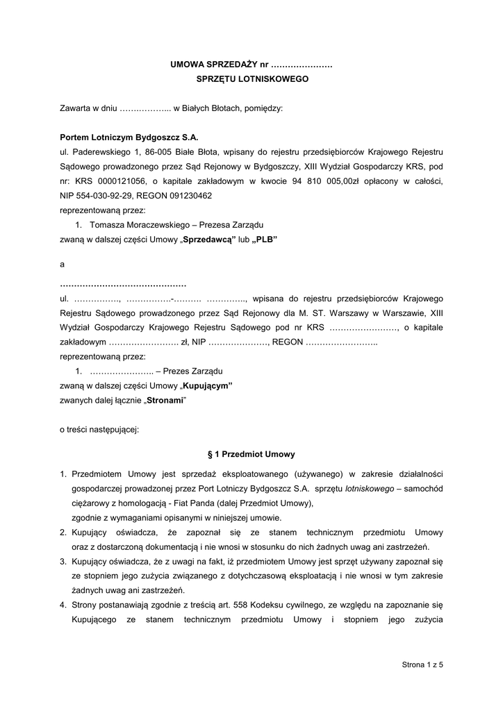 UMOWA SPRZEDAŻY nr …………………. SPRZĘTU LOTNISKOWEGO Zawarta w dniu …….………... w Białych Błotach, pomiędzy: Portem Lotniczym Bydgoszcz S.A. ul. Paderewskiego 1, 86-005 Białe Błota, wpisany do rejestru przedsiębiorców Krajowego Rejestru Sądowego prowadzonego przez Sąd Rejonowy w Bydgoszczy, XIII Wydział Gospodarczy KRS, pod nr: KRS 0000121056, o kapitale zakładowym w kwocie 94 810 005,00zł opłacony w całości, NIP 554-030-92-29, REGON 091230462 reprezentowaną przez: 1. Tomasza Moraczewskiego – Prezesa Zarządu zwaną w dalszej części Umowy „Sprzedawcą” lub „PLB” a ……………………………………… ul. ……………., …………….-………. ………….., wpisana do rejestru przedsiębiorców Krajowego Rejestru Sądowego prowadzonego przez Sąd Rejonowy dla M. ST. Warszawy w Warszawie, XIII Wydział Gospodarczy Krajowego Rejestru Sądowego pod nr KRS ……………………, o kapitale zakładowym ……………………. zł, NIP …………………, REGON …………………….. reprezentowaną przez: 1. ………………….. – Prezes Zarządu zwaną w dalszej części Umowy „Kupującym” zwanych dalej łącznie „Stronami” o treści następującej: § 1 Przedmiot Umowy 1. Przedmiotem Umowy jest sprzedaż eksploatowanego (używanego) w zakresie działalności gospodarczej prowadzonej przez Port Lotniczy Bydgoszcz S.A. sprzętu lotniskowego – samochód ciężarowy z homologacją - Fiat Panda (dalej Przedmiot Umowy), zgodnie z wymaganiami opisanymi w niniejszej umowie. 2. Kupujący oświadcza, zapoznał że się ze stanem technicznym przedmiotu Umowy oraz z dostarczoną dokumentacją i nie wnosi w stosunku do nich żadnych uwag ani zastrzeżeń. 3. Kupujący oświadcza, że z uwagi na fakt, iż przedmiotem Umowy jest sprzęt używany zapoznał się ze stopniem jego zużycia związanego z dotychczasową eksploatacją i nie wnosi w tym zakresie żadnych uwag ani zastrzeżeń. 4. Strony postanawiają zgodnie z treścią art. 558 Kodeksu cywilnego, ze względu na zapoznanie się Kupującego ze stanem technicznym przedmiotu Umowy i stopniem jego zużycia Strona 1 z 5 w związku z jego wcześniejszą eksploatacją przez PLB, wyłączyć odpowiedzialność Sprzedawcy z tytułu rękojmi za wady przedmiotu Umowy. 5. PLB oświadcza, iż przedmiot Umowy nie jest obciążany żadnymi prawami osób trzecich. §2 Na podstawie Umowy PLB zobowiązuje się przenieść na Kupującego własność sprzętu lotniskowego określonego w §1 Umowy, a Kupujący zobowiązuje się odebrać przedmiot Umowy i zapłacić PLB cenę za wydany sprzęt zgodnie z postanowieniami niniejszej Umowy. § 3 Miejsce i Termin wydania przedmiotu Umowy 1. Miejscem wydania i odbioru przedmiotu zamówienia jest Port Lotniczy Bydgoszcz S.A. przy ul. Paderewskiego 1, 86-005 Białe Błota. 2. Wszelkie koszty i ryzyko związane z transportem, odbiorem, zabezpieczeniem i załadunkiem przedmiotu Umowy ponosi Kupujący 3. Kupujący zobowiązany jest odebrać Przedmiot Umowy w terminie 10 dni od daty podpisania niniejszej Umowy. 4. Warunkiem wydania przedmiotu Umowy jest dokonanie zapłaty przez Kupującego ceny za przedmiot Umowy wskazanej w § 5 ust.1 oraz potwierdzenie jej dokonania stosownym dokumentem (potwierdzenie przelewu). 5. Za dzień wydania przedmiotu Umowy Strony uważają się dzień, w którym przedmiot Umowy został odebrany przez Zamawiającego zgodnie z zasadami określonymi w Umowie. § 4 Sprawdzanie i odbiór przedmiotu zamówienia 1. PLB umożliwi, przedstawicielom Kupującemu sprawdzenie przedmiotu zamówienia przed dokonaniem odbioru. 2. Sprawdzenie przedmiotu Umowy będzie polegało na upewnieniu się, że jest on wolny od wad fizycznych, a w szczególności, że odpowiada on opisowi przedmiotu Umowy. 3. Sprawdzenie przedmiotu Umowy dla potrzeb oceny stanu wykonania Umowy będzie polegało na: bezpośredniej kontroli przez osoby upoważnione przez Kupującego pod względem warunków określonych w umowie. 4. Ze sprawdzenia i odbioru przedmiotu Umowy zostanie sporządzony protokół podpisany przez Strony. 5. Odbiór przedmiotu Umowy odbywać się będzie w miejscu prowadzenia działalności przez PLB. 6. Kupujący nie może odmówić podpisania protokołu odbioru w sytuacji, gdy przedmiot Umowy spełnia warunki wskazane w umowie. W sytuacji nieuzasadnionej odmowy podpisania protokołu odbioru Sprzedawca będzie uprawniony do dokonania jednostronnego odbioru przedmiotu Umowy. Strona 2 z 5 § 5 Zapłata ceny 1. Kupujący zobowiązuje się zapłacić Sprzedawcy za przedmiot Umowy cenę netto w kwocie ……………. zł (słownie: …………………… złote) plus należny podatek od towarów i usług Cena brutto za przedmiot Umowy wynosi ……………….. zł. 2. Wszelkie płatności należne Sprzedawcy zostaną dokonane na podstawie faktury wystawionej przez Sprzedającego najpóźniej trzeciego (3) dnia od obustronnego podpisania umowy. 3. Faktura, o której mowa w ust. 2 powyżej będzie płatna w terminie 7 dni od daty jej wystawienia na konto wskazane na fakturze. 4. Za opóźnienie w zapłacie wystawionej faktury w ramach niniejszej Umowy PLB uprawniony jest naliczyć Kupującemu odsetki ustawowe. 5. Sprzedawca zastrzega, iż własność przedmiotu Umowy przejdzie na Kupującego dopiero w momencie uregulowania całości ceny za przedmiot Umowy. § 6 Kary umowne i odstąpienie od Umowy 1. Z tytułu opóźnienia w odebraniu przedmiotu Umowy Sprzedawca ma prawo do obciążenia karą umowną Kupującego w wysokości 0,1% ceny brutto określonej w § 5 Umowy za każdy dzień opóźnienia. 2. W razie niewykonania lub nienależytego wykonania przez Kupującego w terminie obowiązków określonych w Umowie, w szczególności odnoszących się do zapłaty ceny za przedmiot Umowy lub też naruszenia przez niego w inny sposób postanowień niniejszej Umowy, PLB może odstąpić od Umowy w terminie 21 dni od powzięcia wiadomości o 
