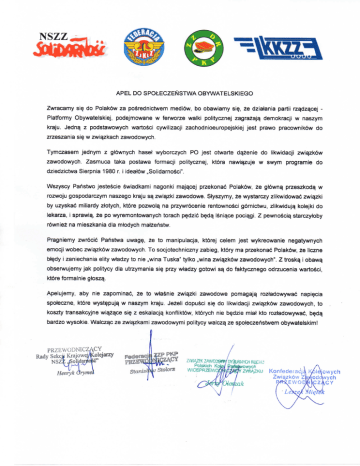 NSZZ^ APEL DO SPOtECZEfslSTWAOBYWATELSKIEGO Zwracamy si^ do Polak6w za poSrednictwem medibw, bo obawiamy si^, 2e dzialania partii rz^dz^cej Platformy Obywatelskiej, podejmowane w ferworze waiki politycznej zagra2ajq demokracji w naszym kraju. Jedn^ z podstawowych wartoSci cywilizacji zachodnioeuropejskiej jest prawo pracownik6w do zrzeszania si^ w zwi^zkach zawodowych. Tymczasem jednym z gl6wnych hasel wyborczych PO jest otwarte d^2enie do likwidacji zwi^zk6w zawodowych. Zasmuca taka postawa formacji politycznej. kt6ra nawl^zuje w swym programie do dziedzictwa Sierpnia 1980 r. i ideat6w „Solidarno6ci". Wszyscy Pahstwo jeste6cie 6wiadkami nagonki majqcej przekonad Poiakbw, 2e gl6wn^ przeszkodq w rozwoju gospodarczym naszego kraju s^ zwiqzki zawodowe. Styszymy, 2e wystarczy zlikwidowad zwi^zki by uzyskad miliardy ziotych, kt6re pozwol^ na przywr6cenie rentownoSci gbrnictwu, zlikwiduj^ kolejki do lekarza, i sprawiq, ze po wyremontowanych torach p^dzid b^d^ ISni^ce poclqgi. Z pewnoSciq starczyloby r6wnie2 na mieszkania dia miodych mal2ehstw. Pragniemy zwr6ci6 Pahstwa uwag^. 2e to manipulacja, kt6rej celem jest wykreowanie negatywnych emocji wobec zwiqzk6w zawodowych. To socjotechniczny zabieg, kt6ry ma przekonad Polak6w, 2e liczne bl^dy i zaniechania elity wladzy to nie „wina Tuska" tyiko „wina zwl^zk6w zawodowych". Z trosk^ i obaw^ obserwujemy jak politycy dIa utrzymania s i ^ przy wladzy gotowi s^ do faktycznego odrzucenia wartoSci, kt6re formalnie glosz^. Apelujemy, aby nie zapominad, 2e to wte6nie zwi^zkl zawodowe pomagaj^ rozladowywad napi^cia spoteczne, kt6re wyst^pujg w naszym kraju. Jeieli dopuSci si§ do likwidacji zwi^zk6w zawodowych, to koszty transakcyjne wi^2^ce si^ z eskalacj^ konfliktdw, kt6rych nie b^dzie mia^ kto rozladowywad, b^dq bardzo wysokie. Walczqc ze zwi^zkami zawodowymi politycy waiczq ze spoleczehstwem obywatelskiml