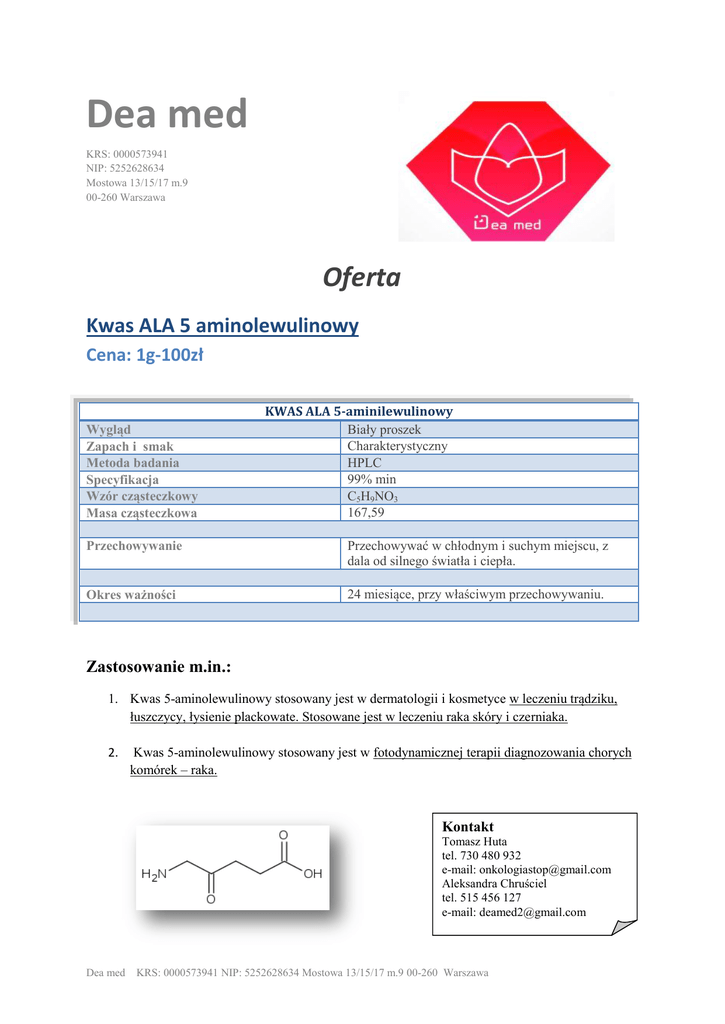 Dea med KRS: 0000573941 NIP: 5252628634 Mostowa 13/15/17 m.9 00-260 Warszawa Oferta Kwas ALA 5 aminolewulinowy Cena: 1g-100zł Wygląd Zapach i smak Metoda badania Specyfikacja Wzór cząsteczkowy Masa cząsteczkowa KWAS ALA 5-aminilewulinowy Biały proszek Charakterystyczny HPLC 99% min C5H9NO3 167,59 Przechowywanie Przechowywać w chłodnym i suchym miejscu, z dala od silnego światła i ciepła. Okres ważności 24 miesiące, przy właściwym przechowywaniu. Zastosowanie m.in.: 1. Kwas 5-aminolewulinowy stosowany jest w dermatologii i kosmetyce w leczeniu trądziku, łuszczycy, łysienie plackowate. Stosowane jest w leczeniu raka skóry i czerniaka. 2. Kwas 5-aminolewulinowy stosowany jest w fotodynamicznej terapii diagnozowania chorych komórek – raka. Kontakt Tomasz Huta tel. 730 480 932 e-mail: [email protected] Aleksandra Chruściel tel. 515 456 127 e-mail: [email protected] Dea med KRS: 0000573941 NIP: 5252628634 Mostowa 13/15/17 m.9 00-260 Warszawa