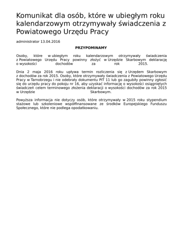 Komunikat dla osób, które w ubiegłym roku kalendarzowym otrzymywały świadczenia z Powiatowego Urzędu Pracy administrator 13.04.2016 PRZYPOMINAMY Osoby, które w ubiegłym roku kalendarzowym otrzymywały świadczenia z Powiatowego Urzędu Pracy powinny złożyć w Urzędzie Skarbowym deklarację o wysokości dochodów za rok 2015. Dnia 2 maja 2016 roku upływa termin rozliczenia się z Urzędem Skarbowym z dochodów za rok 2015. Osoby, które otrzymywały świadczenia z Powiatowego Urzędu Pracy w Tarnobrzegu i nie odebrały dokumentu PIT 11 lub go zagubiły powinny zgłosić się do urzędu pracy do pokoju nr 16, aby uzyskać informację o wysokości osiągniętych świadczeń celem terminowego złożenia deklaracji o wysokości dochodów za rok 2015 w Urzędzie Skarbowym. Powyższa informacja nie dotyczy osób, które otrzymywały w 2015 roku stypendium stażowe lub szkoleniowe współfinansowane ze środków Europejskiego Funduszu Społecznego, które nie podlega opodatkowaniu.