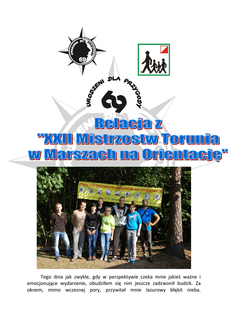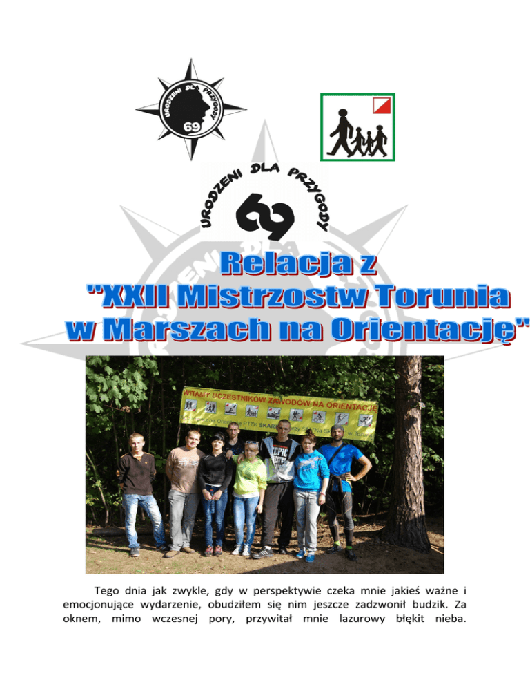 Tego dnia jak zwykle, gdy w perspektywie czeka mnie jakieś ważne i emocjonujące wydarzenie, obudziłem się nim jeszcze zadzwonił budzik. Za oknem, mimo wczesnej pory, przywitał mnie lazurowy błękit nieba. Otworzyłem je na oścież by zaczerpnąć świeżego powietrza. Tak, pomyślałem, pachnie przygoda. W drodze do kuchni spojrzałem na termometr, który już teraz wskazywał niespełna 20 stopni. Zapowiadał się piękny słoneczny dzień. Lepszego pożegnania lata nie mogliśmy sobie wymarzyć. Bez zbędnego pośpiechu zjadłem pożywne śniadanie, spakowałem wszystkie przygotowane poprzedniego dnia rzeczy, aparat przewiesiłem przez ramię i z kluczami w ręce, zamykając za sobą cichutko drzwi by nie obudzić śpiących jeszcze domowników, uśmiechając się wyruszyłem na spotkanie kolejnej przygody. Posłuchajcie… Dzień ten był wyjątkowy nie tylko ze względu na piękno oblanej lukrem ostatnich letnich promieni słońca przyrody, na łonie której miały rozegrać się XXII Mistrzostwa Torunia w Marszach na Orientację. Było to swoistego rodzaju święto wszystkich osób zrzeszonych w 69 Szkolnym Kole KrajoznawczoTurystycznym im. Tony’ego Halika. Nasz mały, prywatny jubileusz w postaci okrągłej, bo 20 imprezy, w której wspólnie mieliśmy przyjemność wziąć udział. Aż łza kręci się w kąciku oka na samo wspomnienie, bo mam nieodparte wrażenie, iż nie dalej jak wczoraj zapukałem do drzwi Oddziału Miejskiego PTTK im. Mariana Sydowa w Toruniu. To wspomnienie, tak żywe w mojej pamięci stanowi najlepsze świadectwo jak doniosła była to dla mnie chwila. Był rok 2009. Założenie Koła stanowiło dla mnie nie tylko największe zawodowe wyzwanie przed jakim stanąłem, ale również spełnienie marzeń oraz początek wspaniałej podróży, która nieprzerwanie trwa do dziś. Nie sposób wymienić wszystkich zawiązanych przez ten czas przyjaźni ani osób, dziś już absolwentów naszej szkoły, którzy wraz ze mną stawiając na szlakach swoje pierwsze, nieśmiałe kroki zapisywali początkowe karty tej właśnie historii. Jeśli czytacie te słowa, pragnę powiedzieć Wam jedno – DZIĘKUJĘ! Dziękuję Wam wszystkim i każdemu z osobna. Wiele się od Was i wraz z Wami przez ten czas nauczyłem. Wspólnie święciliśmy nasze pierwsze sukcesy i doświadczaliśmy goryczy porażki, z której zawsze jednak płynęła ponadczasowa lekcja – Nie poddawaj się. Nigdy! Za nic! Miej odwagę marzyć i odkrywać świat. Gryź go, aż do połamania zębów. Bo ten świat należy do zuchwałych. Do urodzonych dla przygody! Nigdy nie byłem wielbicielem komunikacji miejskiej. Wolę poruszać się pieszo i Wam drodzy czytelnicy również tę formę aktywności zalecam, bo to zawsze zdrowo i parę groszy w kieszeni więcej☺ Ale czasem trzeba się przełamać, jeśli komuś zależy by stawić się punktualnie w wyznaczonym miejscu, a nam na tym zależało. Celem naszej podróży była Górna Polana, położona nieopodal Szkoły Leśnej na Barbarce. To właśnie tam otrzymaliśmy wszelkie niezbędne instrukcje oraz podano nam nasz czas startowy. Ustawiliśmy się w kolejce i grzecznie czekaliśmy na swoją kolej. Z kartą startową w ręce powtarzaliśmy podstawowe zasady bezpieczeństwa i zasady ochrony przyrody. Musicie wiedzieć, że taka wyprawa to nie kaszka z mleczkiem, ale moskity, chaszcze i gałęzie chłostające twarze (określenie dostać z liścia nabiera wtedy zupełnie nowego znaczenia ☺). Tylko dla najtwardszych! Przypominaliśmy sobie również sposoby „czytania” mapy i poruszania się w terenie. Wszystko niespiesznie, ale napięci jak struny gitary, jak kot, który przyczajony przed mysią dziurą czeka na swą zdobycz. Znacie to uczucie? Przedstartowa gorączka. Nieuleczalna gorączka. Nie ma najmniejszego sensu z nią walczyć. Nie można jej się jednak dać ponieść, bo amatora spali jeszcze przed startem. A więc z zewnątrz luz, ale w środku już tlił się ogień rywalizacji. Czekaliśmy i czekaaaliśmy (ziew!) i c z e k a a a l i ś m y. Aż wreszcie zegar odmierzający czas wskazał naszą minutę, oznajmiając to donośnie wszem i wobec trzema głośnymi, przepisowymi piknięciami. Zaczęło się! Teraz nie można pozwolić sobie na błędy. Każdy start w imprezie na Orientację to sprawdzian. Typowa klasówka, albo lepiej semestralny test umiejętności. Niby zasób materiału jest wszystkim znany, ale nie wiadomo jak zostaną sformułowane i czego będą dotyczyć poszczególne pytania. Wchodzimy na start, odbieramy mapy, czytamy instrukcje. Nanosimy lokalizacje punktów, które musimy odszukać i potwierdzić swoją na nich obecność. Jest ich 6 na dystansie kilku kilometrów. Jeśli teraz zadrży ręka zabłądzimy. Nerwy napięte jak postronki sięgają zenitu. Ok! Sprawdzone. Bierzemy mapę, dokonujemy szybkich oględzin rzeźby terenu, ustalamy azymut – rutynowe czynności. Gotowe! Wymarsz. Po drodze do pierwszego punktu oglądamy mapę – piękne zabytkowe, archiwalne cacko. Kolekcjonerski rarytas! Ale na głębszy podziw dla organizatorów za ich trud włożony w przygotowanie imprezy będzie potem. Póki co zegar tyka – mamy ustalony limit czasu, w którym musimy się zmieścić, nim zaczną nam być naliczane punkty karne za zwłokę. Wynosi on 60 min. Średnio więc 10 minut na punkt. Powinno wystarczyć. Co ja gadam, MUSI! Dochodzimy do punktu. Bierzemy kartę z instrukcją i z łatwością odnajdujemy lampion, a do niego doczepioną na lince świecową kredkę, którą wpisujemy w karcie startowej dwuliterowy kod. I znów: mapa, azymut, marsz. Finezyjnie, jak po przysłowiowym sznurku trafiamy do punktu oznaczonego cyfrą dwa. Przy trzecim punkcie pojawiają się pierwsze trudności z precyzyjną lokalizacją punktu. Coś jest nie tak! Idzie nam za łatwo. Czyżbyśmy byli aż tak dobrzy, a może gdzieś po drodze popełniliśmy błąd. Zaczynają nam się, mówiąc kolokwialnie, palić styki. Zgodnie s