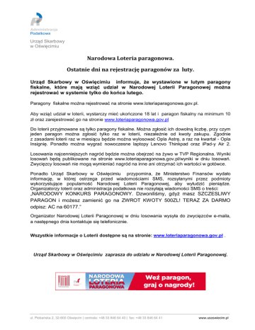 Urząd Skarbowy w Oświęcimiu Narodowa Loteria paragonowa. Ostatnie dni na rejestrację paragonów za luty. Urząd Skarbowy w Oświęcimiu informuje, że wystawione w lutym paragony fiskalne, które mają wziąć udział w Narodowej Loterii Paragonowej można rejestrować w systemie tylko do końca lutego. Paragony fiskalne można rejestrować na stronie www.loteriaparagonowa.gov.pl. Aby wziąć udział w loterii, wystarczy mieć ukończone 18 lat i paragon fiskalny na minimum 10 zł oraz zarejestrować go na stronie www.loteriaparagonowa.gov.pl Do loterii przyjmowane są tylko paragony fiskalne. Można zgłosić ich dowolną liczbę, przy czym jeden paragon można zgłosić tylko raz w loterii, niezależnie od kwoty zakupu. Zgodnie z zasadami loterii raz w miesiącu będzie można wylosować Opla Astrę, a raz na kwartał - Opla Insignię. Ponadto można wygrać nowoczesne laptopy Lenovo Thinkpad oraz iPad-y Air 2. Losowania najcenniejszych nagród będzie można obejrzeć na żywo w TVP Regionalna. Wyniki losowań będą publikowane na stronie www.loteriaparagonowa.gov.pl/wyniki w dniu losowań. Zwycięzcy losowań nie mogą wymieniać nagród na inne ani otrzymać ich wartości w gotówce. Ponadto Urząd Skarbowy w Oświęcimiu przypomina, że Ministerstwo Finansów wydało informację, w której ostrzega przed wiadomościami SMS, rozsyłanymi przez podmioty wykorzystujące popularność Narodowej Loterii Paragonowej, aby wyłudzić pieniądze. Organizatorzy loterii oraz administracja podatkowa nie rozsyłają wiadomości SMS o treści: „NARODOWY KONKURS PARAGONOWY. Dzwoniliśmy, gdyż masz SZCZESLIWY PARAGON i możesz zamienić go na ZWROT KWOTY 500ZL! TERAZ ZA DARMO odpisz: AC na 60177.” Organizator Narodowej Loterii Paragonowej w dniu losowania wysyła do zwycięzców e-maila, a następnego dnia kontaktuje się telefonicznie. Wszystkie informacje o Loterii dostępne są na stronie: www.loteriaparagonowa.gov.pl . Urząd Skarbowy w Oświęcimiu zaprasza do udziału w Narodowej Loterii Paragonowej. ul. Plebańska 2, 32-600 Oświęcim | centrala: +48 33 846 64 40 | fax: +48 33 846 64 41 www.usoswiecim.pl