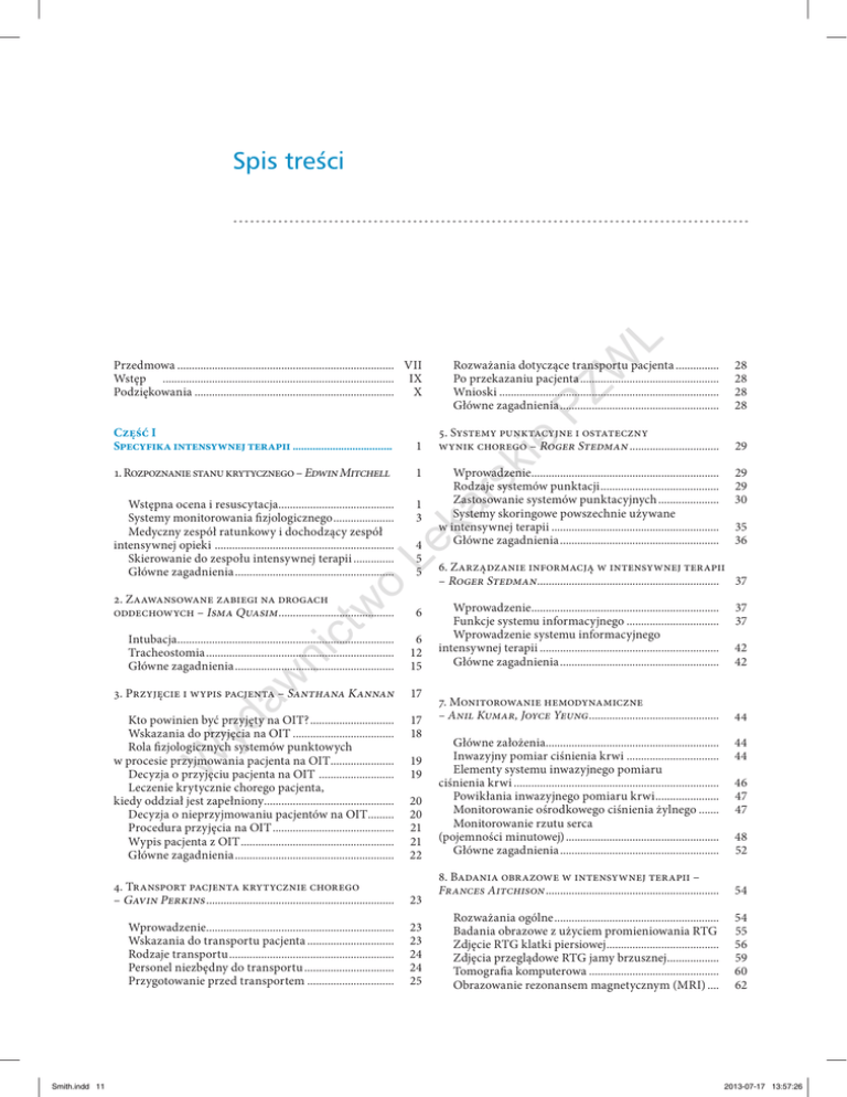 PZ W L Spis treści Rozważania dotyczące transportu pacjenta................28 Po przekazaniu pacjenta.................................................28 Wnioski.............................................................................28 Główne zagadnienia........................................................28 Część I Specyfika intensywnej terapii.................................... 1 5. Systemy punktacyjne i ostateczny wynik chorego – Roger Stedman................................ 1. Rozpoznanie stanu krytycznego – Edwin Mitchell . 1 ki 29 rs Wprowadzenie..................................................................29 Rodzaje systemów punktacji..........................................29 Zastosowanie systemów punktacyjnych......................30 Systemy skoringowe powszechnie używane w intensywnej terapii...........................................................35 Główne zagadnienia........................................................36 w o Le ka Wstępna ocena i resuscytacja.........................................1 Systemy monitorowania fizjologicznego......................3 Medyczny zespół ratunkowy i dochodzący zespół intensywnej opieki ...............................................................4 Skierowanie do zespołu intensywnej terapii...............5 Główne zagadnienia........................................................5 e Przedmowa............................................................................VII Wstęp .................................................................................IX Podziękowania......................................................................X 6 ct 2. Zaawansowane zabiegi na drogach oddechowych – Isma Quasim......................................... aw ni Intubacja............................................................................6 Tracheostomia..................................................................12 Główne zagadnienia........................................................15 3. Przyjęcie i wypis pacjenta – Santhana Kannan. 17 W yd Kto powinien być przyjęty na OIT?..............................17 Wskazania do przyjęcia na OIT....................................18 Rola fizjologicznych systemów punktowych w procesie przyjmowania pacjenta na OIT.......................19 Decyzja o przyjęciu pacjenta na OIT ...........................19 Leczenie krytycznie chorego pacjenta, kiedy oddział jest zapełniony..............................................20 Decyzja o nieprzyjmowaniu pacjentów na OIT..........20 Procedura przyjęcia na OIT...........................................21 Wypis pacjenta z OIT......................................................21 Główne zagadnienia........................................................22 4. Transport pacjenta krytycznie chorego – Gavin Perkins.................................................................. 23 Wprowadzenie..................................................................23 Wskazania do transportu pacjenta...............................23 Rodzaje transportu..........................................................24 Personel niezbędny do transportu................................24 Przygotowanie przed transportem...............................25 Smith.indd 11 6. Zarządzanie informacją w intensywnej terapii – Roger Stedman................................................................ 37 Wprowadzenie..................................................................37 Funkcje systemu informacyjnego.................................37 Wprowadzenie systemu informacyjnego intensywnej terapii...............................................................42 Główne zagadnienia........................................................42 7. Monitorowanie hemodynamiczne – Anil Kumar, Joyce Yeung..............................................44 Główne założenia.............................................................44 Inwazyjny pomiar ciśnienia krwi.................................44 Elementy systemu inwazyjnego pomiaru ciśnienia krwi........................................................................46 Powikłania inwazyjnego pomiaru krwi.......................47 Monitorowanie ośrodkowego ciśnienia żylnego........47 Monitorowanie rzutu serca (pojemności minutowej)......................................................48 Główne zagadnienia........................................................52 8. Badania obrazowe w intensywnej terapii – Frances Aitchison............................................................. 54 Rozważania ogólne..........................................................54 Badania obrazowe z użyciem promieniowania RTG.55 Zdjęcie RTG klatki piersiowej........................................56 Zdjęcia przeglądowe RTG jamy brzusznej...................59 Tomografia komputerowa..............................................60 Obrazowanie rezonansem magnetycznym (MRI).....62 2013-07-17 13:57:26 XII Spis treści 14. Dawstwo narządów – Angeline Simons, Joyce Yeung.................................... 101 Medycyna nuklearna.......................................................63 Sonografia ultradźwiękowa (USG)...............................63 Główne zagadnienia........................................................64 9. Leki wazoaktywne – Mamta Patel......................... 11. Kontrola bólu – Edwin Mitchell......................... 80 Znaczenie łagodzenia bólu ............................................80 Źródła bólu.......................................................................80 Rodzaje i intensywność bólu..........................................80 Sposoby uśmierzania bólu..............................................81 Główne zagadnienia........................................................85 w o 12. Sedacja – Joyce Yeung................................................. 86 W yd aw ni ct Wprowadzenie.........................