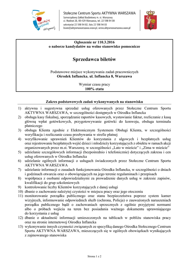 Ogłoszenie nr 110.3.2016 o naborze kandydatów na wolne stanowisko pomocnicze Sprzedawca biletów Podstawowe miejsce wykonywania zadań pracowniczych Ośrodek Inflancka, ul. Inflancka 8, Warszawa Wymiar czasu pracy 100% etatu Zakres podstawowych zadań wykonywanych na stanowisku 1) aktywna i sugestywna sprzedaż usług oferowanych przez Stołeczne Centrum Sportu AKTYWNA WARSZAWA, w szczególności dostępnych w Ośrodku Inflancka 2) obsługa kasy fiskalnej, sporządzanie raportów kasowych, wystawianie faktur, rozliczanie z kasą główną wpłat gotówkowych, przygotowywanie gotówki do konwoju, obsługa terminalu płatniczego 3) obsługa Klienta zgodnie z Elektronicznym Systemem Obsługi Klienta, w szczególności weryfikacja i rozliczanie czasu przebywania w strefie płatnej 4) weryfikowanie uprawnień Klientów do korzystania z ulgowych i bezpłatnych usług oraz rejestrowanie bezpłatnych wejść dzieci i młodzieży korzystających z obiektu w ramach akcji organizowanych przez m.st. Warszawę, w szczególności „Lato w mieście” i „Zima w mieście” 5) udzielanie szczegółowych informacji (bezpośrednio i telefonicznie) dotyczących zakresu i cen usług oferowanych w Ośrodku Inflancka 6) udzielanie ogólnych informacji o usługach świadczonych przez Stołeczne Centrum Sportu AKTYWNA WARSZAWA 7) udzielanie informacji o zasadach funkcjonowania Ośrodka Inflancka, w szczególności o dniach i godzinach otwarcia oraz o obowiązujących na jego terenie regulaminach i przepisach 8) współpraca z osobami odpowiedzialnymi za prowadzenie danych usług w zakresie zapisów, kwalifikacji do grup szkoleniowych 9) kontrolowanie liczby Klientów korzystających z danej usługi 10) dbanie o zachowanie należytej czystości w miejscu pracy oraz jego otoczeniu 11) monitorowanie porządku publicznego oraz stanu bezpieczeństwa poprzez system kamer wizyjnych, informowanie odpowiednich służb (ochrona, Policja) o zauważonych naruszeniach porządku publicznego bądź o zachowaniach sprzecznych z ogólnie przyjętymi normami albo o próbach wejścia na teren bez posiadania ważnego dokumentu uprawniającego do korzystania z usług 12) dbanie o aktualność informacji umieszczonych na tablicach w pobliżu stanowiska pracy oraz na stronie internetowej Ośrodka Inflancka 13) wykonywanie innych czynności związanych ze specyfiką danego Ośrodka Stołecznego Centrum Sportu AKTYWNA WARSZAWA, mieszczących się w ogólnych obowiązkach wynikających z zajmowanego stanowiska Strona 1 z 2 Informacja o warunkach pracy na stanowisku Praca zmianowa w równoważnym systemie czasu pracy. Praca w pomieszczeniu. Bezpośrednia i telefoniczna obsługa Klientów, obsługa kasy fiskalnej, terminalu płatniczego i podstawowych urządzeń biurowych, odpowiedzialność za środki pieniężne. Wymagania niezbędne 1) pełna zdolność do czynności prawnych oraz korzystanie z pełni praw publicznych 2) niekaralność za umyślne przestępstwo ścigane z oskarżenia publicznego lub umyślne przestępstwo skarbowe 3) wykształcenie średnie 4) umiejętności obsługi kasy fiskalnej oraz terminalu płatniczego 5) doświadczenie zawodowe na stanowiskach związanych z bezpośrednią obsługą Klientów Wymagania dodatkowe 1) znajomość języka angielskiego w stopniu komunikatywnym 2) biegła obsługa programów biurowych (edytory tekstów, arkusze kalkulacyjne, programy do tworzenia prezentacji multimedialnych) Wymagane dokumenty 1) 2) 3) 4) curriculum vitae list motywacyjny oświadczenie o pełnej zdolności do czynności prawnych i o korzystaniu z pełni praw publicznych oświadczenie o niekaralności za umyślne przestępstwo ścigane z oskarżenia publicznego lub umyślne przestępstwo skarbowe 5) oświadczenie o wyrażeniu zgody na przetwarzanie danych osobowych dla potrzeb prowadzonego naboru Informacja o sposobie, miejscu i terminie dostarczenia dokumentów Wymagane dokumenty należy przesłać na adres [email protected] podając w tytule wiadomości „Ogłoszenie nr 110.3.2016” w terminie do 04.04.2016 r. albo dostarczyć w zamkniętych kopertach z dopiskiem na kopercie „Ogłoszenie nr 110.3.2016” do Działu Kadr i Płac Stołecznego Centrum Sportu AKTYWNA WARSZAWA przy ul. Rozbrat 26 (pok. 112) bądź przesłać na adres Działu Kadr i Płac Stołecznego Centrum Sportu AKTYWNA WARSZAWA (ul. Rozbrat 26, 00-429 Warszawa) w terminie do 04.04.2016 r. do godz. 16:00. Oferty dostarczone po terminie wskazanym w ogłoszeniu nie będą rozpatrywane. Decyduje data wpływu do Stołecznego Centrum Sportu AKTYWNA WARSZAWA. Informacja o wskaźniku zatrudnienia osób niepełnosprawnych W miesiącu poprzedzającym datę upublicznienia ogłoszenia o naborze wskaźnik zatrudnienia osób niepełnosprawnych w Stołecznym Centrum Sportu AKTYWNA WARSZAWA, w rozumieniu przepisów o rehabilitacji zawodowej i społecznej oraz zatrudnianiu osób niepełnosprawnych, jest niższy niż 6%. Strona 2 z 2