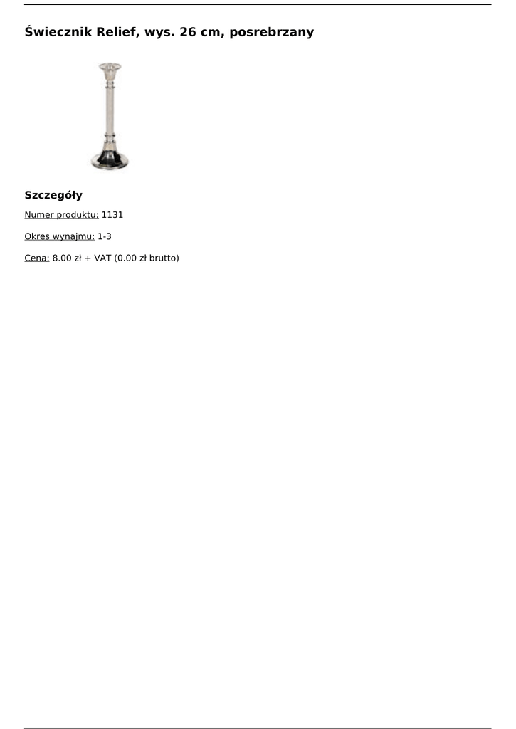 Świecznik Relief, wys. 26 cm, posrebrzany Szczegóły Numer produktu: 1131 Okres wynajmu: 1-3 Cena: 8.00 zł + VAT (0.00 zł brutto) Powered by TCPDF (www.tcpdf.org)