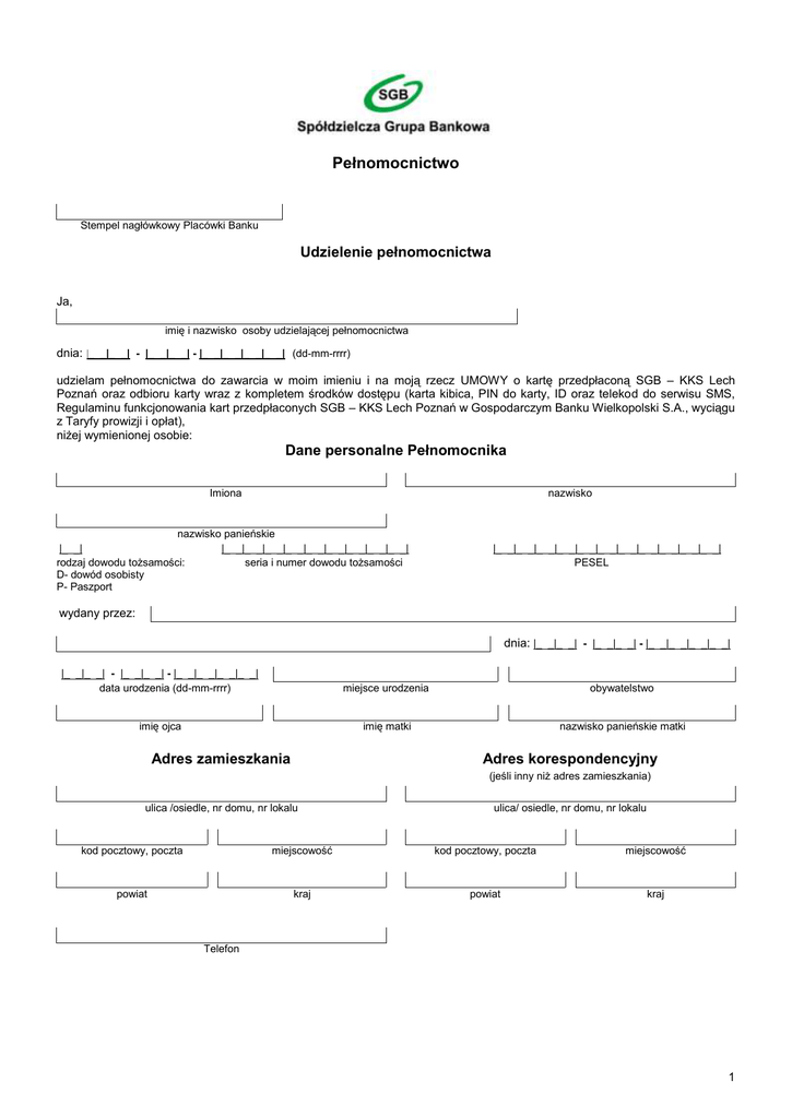 Pełnomocnictwo Stempel nagłówkowy Placówki Banku Udzielenie pełnomocnictwa Ja, imię i nazwisko osoby udzielającej pełnomocnictwa dnia: |_ _|_ _| - |_ _|_ _| - |_ _|_ _|_ _|_ _| (dd-mm-rrrr) udzielam pełnomocnictwa do zawarcia w moim imieniu i na moją rzecz UMOWY o kartę przedpłaconą SGB – KKS Lech Poznań oraz odbioru karty wraz z kompletem środków dostępu (karta kibica, PIN do karty, ID oraz telekod do serwisu SMS, Regulaminu funkcjonowania kart przedpłaconych SGB – KKS Lech Poznań w Gospodarczym Banku Wielkopolski S.A., wyciągu z Taryfy prowizji i opłat), niżej wymienionej osobie: Dane personalne Pełnomocnika Imiona nazwisko nazwisko panieńskie |_ _| |_ _|_ _|_ _|_ _|_ _|_ _|_ _|_ _|_ _| rodzaj dowodu tożsamości: seria i numer dowodu tożsamości D- dowód osobisty P- Paszport |_ _|_ _|_ _|_ _|_ _|_ _|_ _|_ _|_ _|_ _|_ _| PESEL wydany przez: dnia: |_ _|_ _| - |_ _|_ _| - |_ _|_ _|_ _|_ _| |_ _|_ _| - |_ _|_ _| - |_ _|_ _|_ _|_ _| data urodzenia (dd-mm-rrrr) miejsce urodzenia obywatelstwo imię ojca imię matki nazwisko panieńskie matki Adres zamieszkania Adres korespondencyjny (jeśli inny niż adres zamieszkania) ulica /osiedle, nr domu, nr lokalu ulica/ osiedle, nr domu, nr lokalu kod pocztowy, poczta miejscowość kod pocztowy, poczta miejscowość powiat kraj powiat kraj Telefon 1 Dane personalne Posiadacza karty – osoby udzielającej pełnomocnictwo imię nazwisko PESEL nazwisko panieńskie matki data urodzenia adres e-mail * typ dokumentu tożsamości: DO – dowód osobisty; PA – paszport; IN – pozostałe dokumenty nr telefonu komórkowego seria i numer dokumentu tożsamości rezydent obywatelstwo zamieszkałym: ul./al./os./pl. nazwa ulicy/al./os./pl. Miasto nr domu kod pocztowy nr lokalu poczta kraj adres korespondencyjny (jeśli inny niż zamieszkania): ul./al./os./pl. nazwa ulicy/al./os./pl. Miasto nr domu kod pocztowy nr lokalu poczta kraj Administratorem podanych przez Pana/Panią danych osobowych jest Gospodarczy Bank Wielkopolski S.A. z siedzibą w Poznaniu ul. Szarych Szeregów 23a, 60 – 462 Poznań (GBW S.A.). GBW S.A. informuje, iż przetwarza dane osobowe w celu podjęcia niezbędnych działań związanych z zawarciem i wykonaniem umowy o kartę przedpłaconą SGB – KKS Lech Poznań. Dane te są przeznaczone dla GBW S.A. oraz mogą być przekazane podmiotom wymienionym w art. 105 ustawy z dnia 29 sierpnia 1997r. Prawo bankowe (Dz.U. z 2002 r. Nr 72 poz. 665 z późn. zm.) oraz KKS Lech Poznań S.A. Pełnomocnikowi i Posiadaczowi przysługuje prawo do dostępu do treści oraz poprawiania swoich danych, w szczególności ich uaktualnienia, sprostowania, poprawienia. Podpis osoby udzielającej pełnomocnictwa Niniejszym wyrażam / *nie wyrażam zgodę/y na przetwarzanie przez Bank moich danych osobowych dla celów marketingowych, promocyjnych i statystycznych zgodnie z ustawą z dnia 29 sierpnia 1997 r. o ochronie danych osobowych (Dz. U. z 2002 r. Nr 101, poz. 926 z późn. zm.). Zgoda ta obejmuje również przetwarzanie moich danych osobowych w przyszłości, jeżeli nie zmieni się cel przetwarzania. Miejscowość, data Podpis Pełnomocnika Stwierdza się zgodność danych osobowych z okazanym dokumentem stwierdzającym tożsamość oraz potwierdza się autentyczność złożonego wzoru podpisu. Miejscowość, data Stempel funkcyjny i podpis pracownika Placówki Banku (wypełnia Bank) Pełnomocnictwa udzielono dnia: |_ _|_ _| - |_ _|_ _| - |_ _|_ _|_ _|_ _| (dd/mm/rrrr) Data, stempel funkcyjny i podpis pracownika Placówki Banku Załącznik: kserokopia dokumentu tożsamości Posiadacza karty * - proszę wstawić znak X w wybrane pole 2