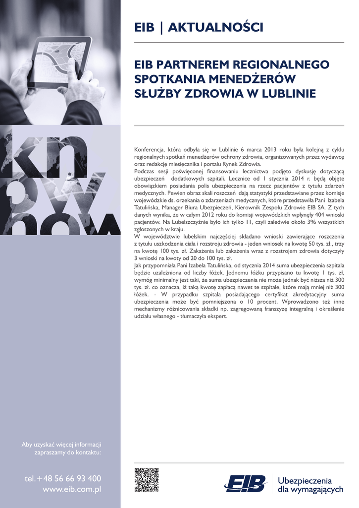 EIB | AKTUALNOŚCI EIB PARTNEREM REGIONALNEGO SPOTKANIA MENEDŻERÓW SŁUŻBY ZDROWIA W LUBLINIE Konferencja, która odbyła się w Lublinie 6 marca 2013 roku była kolejną z cyklu regionalnych spotkań menedżerów ochrony zdrowia, organizowanych przez wydawcę oraz redakcję miesięcznika i portalu Rynek Zdrowia. Podczas sesji poświęconej finansowaniu lecznictwa podjęto dyskusję dotyczącą ubezpieczeń dodatkowych szpitali. Lecznice od 1 stycznia 2014 r. będą objęte obowiązkiem posiadania polis ubezpieczenia na rzecz pacjentów z tytułu zdarzeń medycznych. Pewien obraz skali roszczeń dają statystyki przedstawiane przez komisje wojewódzkie ds. orzekania o zdarzeniach medycznych, które przedstawiła Pani Izabela Tatulińska, Manager Biura Ubezpieczeń, Kierownik Zespołu Zdrowie EIB SA. Z tych danych wynika, że w całym 2012 roku do komisji wojewódzkich wpłynęły 404 wnioski pacjentów. Na Lubelszczyźnie było ich tylko 11, czyli zaledwie około 3% wszystkich zgłoszonych w kraju. W województwie lubelskim najczęściej składano wnioski zawierające roszczenia z tytułu uszkodzenia ciała i rozstroju zdrowia - jeden wniosek na kwotę 50 tys. zł., trzy na kwotę 100 tys. zł. Zakażenia lub zakażenia wraz z rozstrojem zdrowia dotyczyły 3 wnioski na kwoty od 20 do 100 tys. zł. Jak przypomniała Pani Izabela Tatulińska, od stycznia 2014 suma ubezpieczenia szpitala będzie uzależniona od liczby łóżek. Jednemu łóżku przypisano tu kwotę 1 tys. zł, wymóg minimalny jest taki, że suma ubezpieczenia nie może jednak być niższa niż 300 tys. zł. co oznacza, iż taką kwotę zapłacą nawet te szpitale, które mają mniej niż 300 łóżek. - W przypadku szpitala posiadającego certyfikat akredytacyjny suma ubezpieczenia może być pomniejszona o 10 procent. Wprowadzono też inne mechanizmy różnicowania składki np. zagregowaną franszyzę integralną i określenie udziału własnego - tłumaczyła ekspert. Aby uzyskać więcej informacji zapraszamy do kontaktu: tel.+48 56 66 93 400 www.eib.com.pl