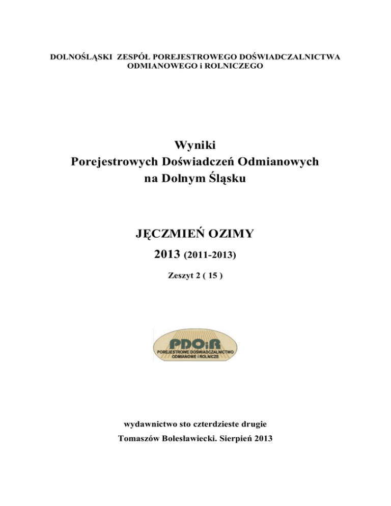 DOLNOŚLĄSKI ZESPÓŁ POREJESTROWEGO DOŚWIADCZALNICTWA ODMIANOWEGO i ROLNICZEGO Wyniki Porejestrowych Doświadczeń Odmianowych na Dolnym Śląsku JĘCZMIEŃ OZIMY 2013 (2011-2013) Zeszyt 2 ( 15 ) wydawnictwo sto czterdzieste drugie Tomaszów Bolesławiecki. Sierpień 2013 Dolnośląski Zespół Porejestrowego Doświadczalnictwa Odmianowego i Rolniczego przewodniczący: mgr inż. Anna Kamińska z-ca: prof. dr hab. Jan Kaczmarek z-ca: prof. dr hab. Henryk Bujak sekretarz: mgr inż. Ewa Śmiałek Stacja Koordynująca PDOiR na Dolnym Śląsku: Stacja Doświadczalna Oceny Odmian w Zybiszowie 55-080 Kąty Wrocławskie dyrektor: mgr inż. Anna Kamińska e-mail [email protected] www.zybiszow.coboru.pl tel. 71-316-96-31 Opracował: mgr inż. Ludwik Kotowicz Publikacja chroniona prawem wydawcy; każda reprodukcja całości lub jej części wymaga zgody wydawcy Wydawca: ZDOO Tomaszów Bolesławiecki I. Wstęp W opracowaniu wykorzystano wyniki 10 doświadczeń wykonanych na Dolnym Śląsku w latach 2011 – 2013, w tym 4 przeprowadzonych w roku 2013. W sezonie 2012/2013 badano 10 najwartościowszych odmian spośród 27 znajdujących się w krajowym rejestrze. Doświadczenia prowadzono na dwóch poziomach agrotechnicznych: a1 – przeciętnym, a2 – wysokim (zwiększone o 40 kg nawożenie azotowe, zwalczanie chorób grzybowych, stosowanie antywylegacza i dolistne dokarmianie mikronawozami) W opracowaniu, poza ogólnymi charakterystykami wszystkich odmian badanych w doświadczeniach PDOiR w roku 2013 podano również charakterystykę odmian najnowszych, wpisanych do krajowego rejestru wiosną bieżącego roku. II. Analiza wyników doświadczeń Zima 2012/2013 charakteryzowała się częstą okrywą śnieżną i długotrwałością. Wiosenne ruszenie wegetacji nastąpiło dopiero pomiędzy 11 a 15 kwietnia 2013r. Uzyskane plony jęczmienia ozimego kształtowały się na najniższym od wielu lat poziomie i były niższe o 18,7 % niż w roku 2011. Najwyżej plonowały odmiany Souleyka, Antonella, Henriette i KWS Meridian natomiast najniżej Nickela, Metaxa i Scarpia. Najwyższe plony zebrano w Kondratowicach a najniższe w Jeleniej Górze. Wyższe niż w poprzednich latach było porażenie jęczmienia ozimego przez wszystkie oceniane w doświadczeniach choroby. Szczególnie nasiliło się występowanie rdzy jęczmienia i plamistości siatkowej. III. Charakterystyka odmian. (Poniższa charakterystyka odmian została sporządzona w oparciu o wieloletnie wyniki doświadczeń przeprowadzonych na terenie całego kraju) NICKELA. Odmiana dwurzędowa, typu browarnego o średniej wartości technologicznej. Mrozoodporność dość mała. Odporność na mączniaka – duża, na czarną plamistość – dość duża, na plamistość siatkową, rdzę jęczmienia i rynchosporiozę – średnia, na rdzę źdźbłową – dość mała. Rośliny bardzo niskie, o dużej odporności na wyleganie. Termin kłoszenia średni, dojrzewania dość późny. Masa 1000 ziaren – duża do bardzo dużej, wyrównanie średnie, gęstość ziarna w stanie zsypnym bardzo duża. Zawartość białka w ziarnie mała. Plenność dobra. Przyrost plonu przy uprawie na wysokim poziomie agrotechniki przeciętny. Tolerancja na zakwaszenie gleby średnia. SCARPIA. Odmiana typu pastewnego o przeciętnej mrozoodporności. Odporność na rynchosporiozę – dość duża, na plamistość siatkową, rdzę jęczmienia i czarną plamistość – średnia, a na mączniaka – mała do bardzo małej. Rośliny o przeciętnej wysokości i odporności na wyleganie. Termin kłoszenia dość wczesny, dojrzewania średni. Masa 1000 ziaren, wyrównanie ziarna i gęstość ziarna w stanie zsypnym – średnie. Zawartość białka w ziarnie przeciętna. Plenność dobra do bardzo dobrej. LAVERDA. Odmiana wielorzędowa, typu pastewnego. Mrozoodporność średnia. Odporność na mączniaka – duża, na rdzę jęczmienia, rynchosporiozę i czarną plamistość – dość duża, na plamistość siatkową – średnia. Rośliny dość niskie, o przeciętnej odporności na wyleganie. Termin kłoszenia wczesny, dojrzewania średni. Masa 1000 ziaren duża, wyrównanie ziarna dość dobre, gęstość ziarna w stanie zsypnym – przeciętna. Zawartość białka w ziarnie – dość duża. Tolerancja na zakwaszenie gleby – średnia. Plenność dobra do bardzo dobrej. Przedstawiciel hodowcy: Saaten Union Polska, ul. Straszewska 70, 62 – 100 Wągrowiec. METAXA Odmiana dwurzędowa, typu pastewnego. Plenność średnia. Przyrost plonu przy uprawie na wysokim poziomie agrotechniki przeciętny. Mrozoodporność prawie średnia. Odporność na mączniaka i czarną plamistość – dość duża, na plamistość siatkową, rdzę jęczmienia i rynchosporiozę – średnia. Rośliny niskie do bardzo niskich, o przeciętnej odporności na wyleganie. Termin kłoszenia wczesny, dojrzewania średni. Masa 1000 ziaren duża, wyrównanie ziarna średnie, gęstość ziarna w stanie zsypnym dość duża. Zawartość białka w ziarnie dość duża. Tolerancja na zakwaszenie gleby średnia. SOULEYKA Odmiana wielorzędowa, typu pastewnego. Plenność bardzo dobra. Przyrost plonu przy uprawie na wysokim poziomie agrotechniki przeciętny. Mrozoodporność średnia. Odporność na mączniaka, plamistość siatkową, rdzę jęczmienia i czarną plamistość – duża, na rynchosporiozę – średnia. Rośliny o przeciętnej wysokości i dość dużej odporności na wyleganie. Termin kłoszenia i dojrzewania średni. Masa 1000 ziaren duża, wyrównanie ziarna średnie, gęstość ziarna w stanie zsypnym dość mała. Zawartość białka w ziarnie średnia. Tolerancja na zakwaszenie gleby średnia. ANTONELLA – odmiana wielorzędowa, typu pastewnego. Plenność bardzo dobra. Mrozoodporność średnia. Odporność na mączniaka i czarną plamistość – duża do bardzo dużej, na plamistość siatkową i rynchosporiozę – duża, na rdzę jęczmienia – dość duża. Rośliny o przeciętnej 