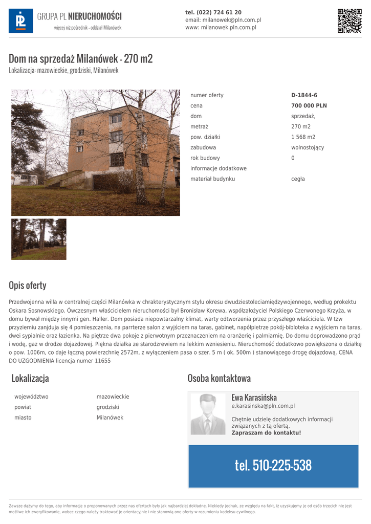 tel. (022) 724 61 20 email: [email protected] www: milanowek.pln.com.pl Dom na sprzedaż Milanówek - 270 m2 Lokalizacja: mazowieckie, grodziski, Milanówek numer oferty D-1844-6 cena 700 000 PLN dom sprzedaż, metraż 270 m2 pow. działki 1 568 m2 zabudowa wolnostojący rok budowy 0 informacje dodatkowe materiał budynku cegła Opis oferty Przedwojenna willa w centralnej części Milanówka w chrakterystycznym stylu okresu dwudziestoleciamiędzywojennego, według prokektu Oskara Sosnowskiego. Ówczesnym właścicielem nieruchomości był Bronisław Korewa, współzałożyciel Polskiego Czerwonego Krzyża, w domu bywał między innymi gen. Haller. Dom posiada niepowtarzalny klimat, warty odtworzenia przez przyszłego właściciela. W tzw przyziemiu zanjduja się 4 pomieszczenia, na parrterze salon z wyjściem na taras, gabinet, napółpietrze pokój-bibloteka z wyjściem na taras, dwei sypialnie oraz łazienka. Na piętrze dwa pokoje z pierwotnym przeznaczeniem na oranżerię i palmiarnię. Do domu doprowadzono prąd i wodę, gaz w drodze dojazdowej. Piękna działka ze starodzrewiem na lekkim wzniesieniu. Nieruchomość dodatkowo powiększona o działkę o pow. 1006m, co daje łączną powierzchnię 2572m, z wyłączeniem pasa o szer. 5 m ( ok. 500m ) stanowiącego drogę dojazdową. CENA DO UZGODNIENIA licencja numer 11655 Lokalizacja Osoba kontaktowa Ewa Karasińska województwo mazowieckie powiat grodziski [email protected] miasto Milanówek Chętnie udzielę dodatkowych informacji związanych z tą ofertą. Zapraszam do kontaktu! tel. 510-225-538 Zawsze dążymy do tego, aby informacje o proponowanych przez nas ofertach były jak najbardziej dokładne. Niekiedy jednak, ze względu na fakt, iż uzyskujemy je od osób trzecich nie jest możliwe ich zweryfikowanie, wobec czego należy traktować je orientacyjnie i nie stanowią one oferty w rozumieniu kodeksu cywilnego.