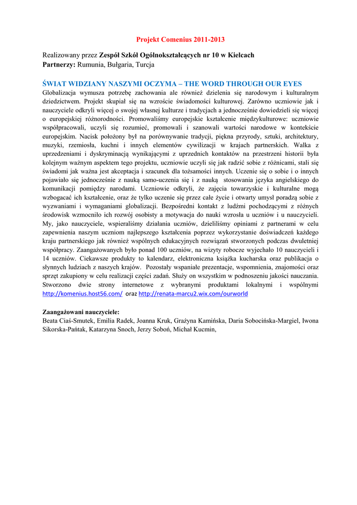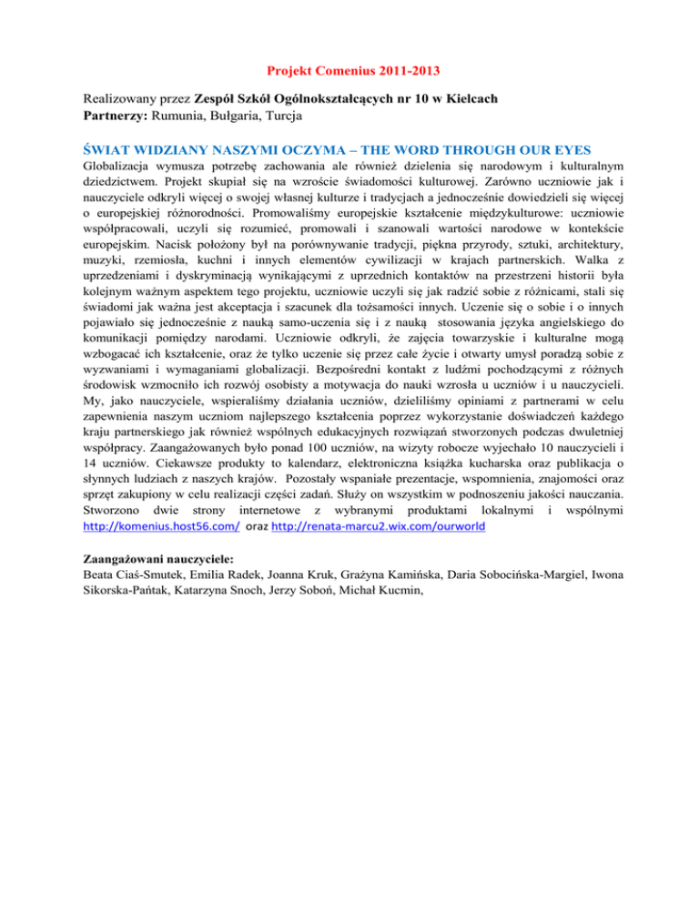 Projekt Comenius 2011-2013 Realizowany przez Zespół Szkół Ogólnokształcących nr 10 w Kielcach Partnerzy: Rumunia, Bułgaria, Turcja ŚWIAT WIDZIANY NASZYMI OCZYMA – THE WORD THROUGH OUR EYES Globalizacja wymusza potrzebę zachowania ale również dzielenia się narodowym i kulturalnym dziedzictwem. Projekt skupiał się na wzroście świadomości kulturowej. Zarówno uczniowie jak i nauczyciele odkryli więcej o swojej własnej kulturze i tradycjach a jednocześnie dowiedzieli się więcej o europejskiej różnorodności. Promowaliśmy europejskie kształcenie międzykulturowe: uczniowie współpracowali, uczyli się rozumieć, promowali i szanowali wartości narodowe w kontekście europejskim. Nacisk położony był na porównywanie tradycji, piękna przyrody, sztuki, architektury, muzyki, rzemiosła, kuchni i innych elementów cywilizacji w krajach partnerskich. Walka z uprzedzeniami i dyskryminacją wynikającymi z uprzednich kontaktów na przestrzeni historii była kolejnym ważnym aspektem tego projektu, uczniowie uczyli się jak radzić sobie z różnicami, stali się świadomi jak ważna jest akceptacja i szacunek dla tożsamości innych. Uczenie się o sobie i o innych pojawiało się jednocześnie z nauką samo-uczenia się i z nauką stosowania języka angielskiego do komunikacji pomiędzy narodami. Uczniowie odkryli, że zajęcia towarzyskie i kulturalne mogą wzbogacać ich kształcenie, oraz że tylko uczenie się przez całe życie i otwarty umysł poradzą sobie z wyzwaniami i wymaganiami globalizacji. Bezpośredni kontakt z ludźmi pochodzącymi z różnych środowisk wzmocniło ich rozwój osobisty a motywacja do nauki wzrosła u uczniów i u nauczycieli. My, jako nauczyciele, wspieraliśmy działania uczniów, dzieliliśmy opiniami z partnerami w celu zapewnienia naszym uczniom najlepszego kształcenia poprzez wykorzystanie doświadczeń każdego kraju partnerskiego jak również wspólnych edukacyjnych rozwiązań stworzonych podczas dwuletniej współpracy. Zaangażowanych było ponad 100 uczniów, na wizyty robocze wyjechało 10 nauczycieli i 14 uczniów. Ciekawsze produkty to kalendarz, elektroniczna książka kucharska oraz publikacja o słynnych ludziach z naszych krajów. Pozostały wspaniałe prezentacje, wspomnienia, znajomości oraz sprzęt zakupiony w celu realizacji części zadań. Służy on wszystkim w podnoszeniu jakości nauczania. Stworzono dwie strony internetowe z wybranymi produktami lokalnymi i wspólnymi http://komenius.host56.com/ oraz http://renata-marcu2.wix.com/ourworld Zaangażowani nauczyciele: Beata Ciaś-Smutek, Emilia Radek, Joanna Kruk, Grażyna Kamińska, Daria Sobocińska-Margiel, Iwona Sikorska-Pańtak, Katarzyna Snoch, Jerzy Soboń, Michał Kucmin, Tradycje wielkanocne, Iasi, Rumunia, IV 2013 „Bajki dziedzictwem europejskim”, Kielce, Polska, V 2012 „Promowanie praw człowieka”, Ankara, Turcja, II 2013