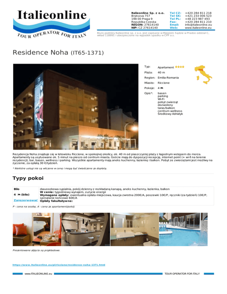 Italieonline Sp. z o.o. Bryksova 757 198 00 Praga 9 Republika Czeska REGON: 27614140 NIP: CZ 27614140 Tel CZ: Tel SK: Tel PL: Fax: Email: Web: +420 284 811 218 +421 233 006 523 +48 223 987 493 +420 284 811 210 [email protected] www.italieonline.eu Biuro podróży Italieonline sp. z o.o. jest zapisane w Miejskim Sądzie w Pradze oddział C, wkład 118991 i ubezpieczone na wypadek upadku w ČPP a.s. Residence Noha (IT65-1371) Typ: Apartament Plaża: 40 m Region: Emilia-Romania Miasto: Riccione Pokoje: 4 Opis*: basen parking Wi-Fi pobyt zwierząt dozwolony taras/balkon centrum wellness Środkowy Adriatyk Rezydencja Noha znajduje się w letowisku Riccione, w spokojnej okolicy, ok. 40 m od piaszczystej plaży z łagodnym wstępem do morza. Apartamenty są usytuowane ok. 5 minut na pieszo od centrum miasta. Goście mają do dyspozycji recepcję, internet point (+ wi-fi na terenie rezydencji), bar, basen, wellness i parking. Wszystkie apartamenty mają aneks kuchenny, łazienkę i balkon. Pobyt ze zwierzętami jest możliwy na życzenie, za opłatą 30 €/tydzień. * Niektóre usługi nie są wliczone w cenę i mogą być świadczone za dopłatą. Typy pokoi Bilo dwuosobowa sypialnia, pokój dzienny z rozkładaną kanapą, aneks kuchenny, łazienka, balkon W cenie: tygodniowy wynajem, zużycie energii 4 (bilo) Wymagane opłaty: ewentualna opłata miejscowa, kaucja zwrotna 200€/A, poszewki 10€/P, ręczniki (za tydzień) 10€/P, sprzątanie końcowe 60€/A Zarezerwować Opłaty fakultatywne: P - cena na osobę, A - cena za apartament/pokój Prezentowane zdjęcia są przykładowe. https://www.italieonline.eu/pl/riccione/residence-noha-1371.html www.ITALIEONLINE.eu TOUR OPERATOR FOR ITALY