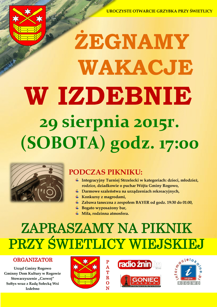 UROCZYSTE OTWARCIE GRZYBKA PRZY ŚWIETLICY ŻEGNAMY WAKACJE W IZDEBNIE 29 sierpnia 2015r. (SOBOTA) godz. 17:00 PODCZAS PIKNIKU: Integracyjny Turniej Strzelecki w kategoriach: dzieci, młodzież, rodzice, dziadkowie o puchar Wójta Gminy Rogowo, Darmowe szaleństwa na urządzeniach rekreacyjnych, Konkursy z magrodami, Zabawa taneczna z zespołem BAYER od godz. 19:30 do 01:00, Bogato wyposażony bar, Miła, rodzinna atmosfera. ZAPRASZAMY NA PIKNIK PRZY ŚWIETLICY WIEJSKIEJ ORGANIZATOR Urząd Gminy Rogowo Gminny Dom Kultury w Rogowie Stowarzyszenie „Czewoj” Sołtys wraz z Radą Sołecką Wsi Izdebno P A T R O N A T
