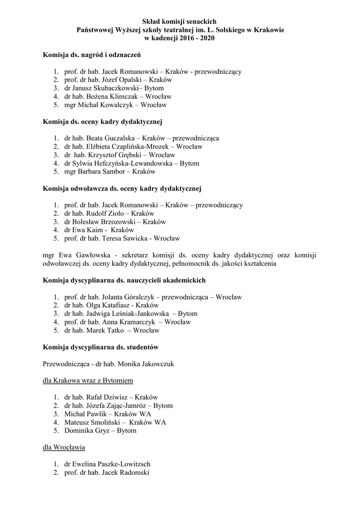 Skład komisji senackich Państwowej Wyższej szkoły teatralnej im. L. Solskiego w Krakowie w kadencji 2016 - 2020 Komisja ds. nagród i odznaczeń 1. 2. 3. 4. 5. prof. dr hab. Jacek Romanowski – Kraków - przewodniczący prof. dr hab. Józef Opalski – Kraków dr Janusz Skubaczkowski– Bytom dr hab. Bożena Klimczak – Wrocław mgr Michał Kowalczyk – Wrocław Komisja ds. oceny kadry dydaktycznej 1. 2. 3. 4. 5. dr hab. Beata Guczalska – Kraków – przewodnicząca dr hab. Elżbieta Czaplińska-Mrozek – Wrocław dr hab. Krzysztof Grębski – Wrocław dr Sylwia Hefczyńska-Lewandowska – Bytom mgr Barbara Sambor – Kraków Komisja odwoławcza ds. oceny kadry dydaktycznej 1. 2. 3. 4. 5. prof. dr hab. Jacek Romanowski – Kraków – przewodniczący dr hab. Rudolf Zioło – Kraków dr Bolesław Brzozowski – Kraków dr Ewa Kaim - Kraków prof. dr hab. Teresa Sawicka - Wrocław mgr Ewa Gawłowska - sekretarz komisji ds. oceny kadry dydaktycznej oraz komisji odwoławczej ds. oceny kadry dydaktycznej, pełnomocnik ds. jakości kształcenia Komisja dyscyplinarna ds. nauczycieli akademickich 1. 2. 3. 4. 5. prof. dr hab. Jolanta Góralczyk – przewodnicząca – Wrocław dr hab. Olga Katafiasz - Kraków dr hab. Jadwiga Leśniak-Jankowska – Bytom prof. dr hab. Anna Kramarczyk – Wrocław dr hab. Marek Tatko – Wrocław Komisja dyscyplinarna ds. studentów Przewodnicząca - dr hab. Monika Jakowczuk dla Krakowa wraz z Bytomiem 1. 2. 3. 4. 5. dr hab. Rafał Dziwisz – Kraków dr hab. Józefa Zając-Jamróz – Bytom Michał Pawlik – Kraków WA Mateusz Smoliński – Kraków WA Dominika Gryz – Bytom dla Wrocławia 1. dr Ewelina Paszke-Lowitzsch 2. prof. dr hab. Jacek Radomski 3. mgr Aleksandra Pejcz-Jakimiuk 4. Jan Grządziela WA 5. Karolina Marcisz WL Odwoławcza komisja dyscyplinarna ds. studentów Przewodnicząca – dr hab. Łucja Czarnecka dla Krakowa wraz z Bytomiem 1. 2. 3. 4. 5. dr hab. Beata Guczalska – Kraków dr hab. Wojciech Leonowicz – Kraków Robert Ciszewski – Kraków WA Andrzej Błażewicz – Kraków WRD Omar Karabulut – Bytom dla Wrocławia 1. mgr Wojciech Brawer 2. Agnieszka Ejsmont WL Rada biblioteczna 1. 2. 3. 4. 5. 6. 7. dr hab. Beata Guczalska – Kraków – przewodnicząca dr hab. Jerzy Bielunas – Wrocław dr hab. Tomasz Man – Wrocław dr Błażej Peszek – Bytom Ewa Mikuła – Kraków Adrianna Izydorczyk – Wrocław Julia Lewandowska – Bytom Komisja finansowa 1. 2. 3. 4. 5. 6. 7. dr hab. Adam Nawojczyk – Kraków - przewodniczący dr Iwona Kempa – Kraków dr Janusz Skubaczkowski – Bytom dr hab. Aneta Głuch-Klucznik – Wrocław prof. dr hab. Krzysztof Kuliński – Wrocław mgr Magdalena Krawczyk – Kraków mgr Joanna Szewczyk - Kraków Komisja socjalna 1. 2. 3. 4. 5. 6. 7. 8. 9. prof. dr hab. Ewa Kutryś – Kraków – przewodnicząca mgr Iwona Kołodziejczyk – Kraków dr Zbigniew Grygielski – Kraków mgr Jolanta Kubasiewicz – Kraków Małgorzata Kucharczyk – przedstawiciel związków zawodowych mgr Agnieszka Osman-Tura – Bytom mgr Cecylia Oleszczak – Wrocław dr hab. Jolanta Zalewska – Wrocław dr hab. Agata Kucińska – Wrocław