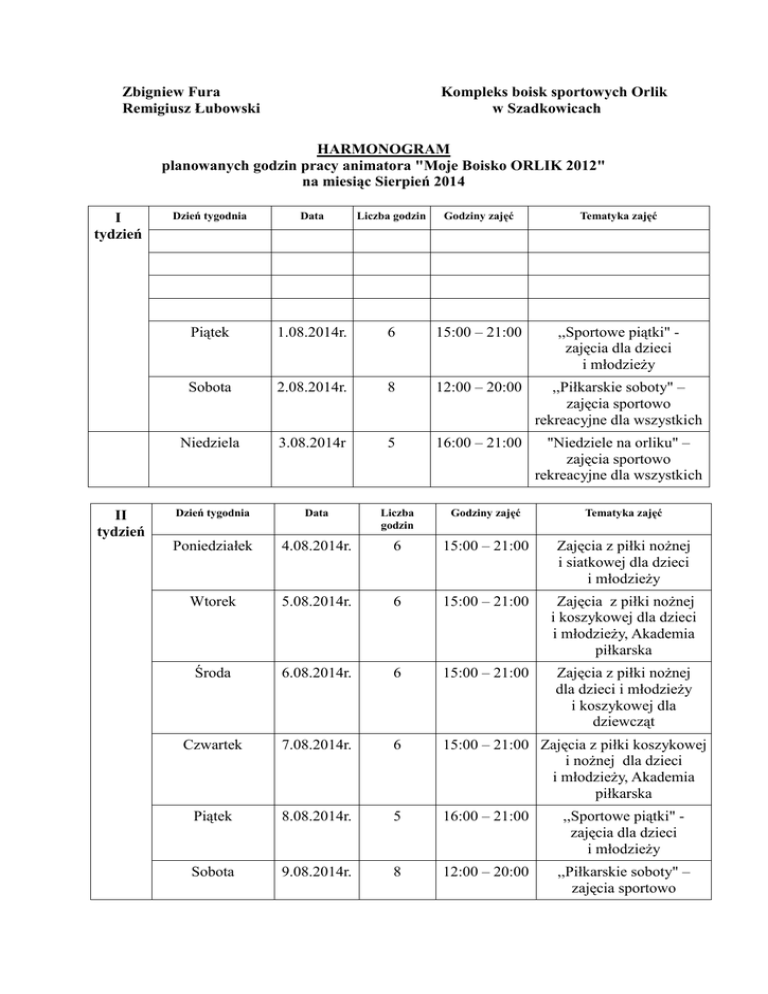 Zbigniew Fura Remigiusz Łubowski Kompleks boisk sportowych Orlik w Szadkowicach HARMONOGRAM planowanych godzin pracy animatora "Moje Boisko ORLIK 2012" na miesiąc Sierpień 2014 I tydzień II tydzień Dzień tygodnia Data Liczba godzin Godziny zajęć Tematyka zajęć Piątek 1.08.2014r. 6 15:00 – 21:00 ,,Sportowe piątki" zajęcia dla dzieci i młodzieży Sobota 2.08.2014r. 8 12:00 – 20:00 ,,Piłkarskie soboty" – zajęcia sportowo rekreacyjne dla wszystkich Niedziela 3.08.2014r 5 16:00 – 21:00 "Niedziele na orliku" – zajęcia sportowo rekreacyjne dla wszystkich Dzień tygodnia Data Liczba godzin Godziny zajęć Tematyka zajęć Poniedziałek 4.08.2014r. 6 15:00 – 21:00 Zajęcia z piłki nożnej i siatkowej dla dzieci i młodzieży Wtorek 5.08.2014r. 6 15:00 – 21:00 Zajęcia z piłki nożnej i koszykowej dla dzieci i młodzieży, Akademia piłkarska Środa 6.08.2014r. 6 15:00 – 21:00 Zajęcia z piłki nożnej dla dzieci i młodzieży i koszykowej dla dziewcząt Czwartek 7.08.2014r. 6 15:00 – 21:00 Zajęcia z piłki koszykowej i nożnej dla dzieci i młodzieży, Akademia piłkarska Piątek 8.08.2014r. 5 16:00 – 21:00 ,,Sportowe piątki" zajęcia dla dzieci i młodzieży Sobota 9.08.2014r. 8 12:00 – 20:00 ,,Piłkarskie soboty" – zajęcia sportowo rekreacyjne dla wszystkich III tydzień IV tydzień Niedziela 10.08.2014r. 5 16:00 – 21:00 Dzień tygodnia Data Liczba godzin Godziny zajęć "Niedziele na orliku" – zajęcia sportowo rekreacyjne dla wszystkich Tematyka zajęć Poniedziałek 11.08.2014r. 6 15:00 – 21:00 Zajęcia z piłki nożnej i siatkowej dla dzieci i młodzieży Wtorek 12.08.2014r. 6 15:00 – 21:00 Zajęcia z piłki nożnej i koszykowej dla dzieci i młodzieży i dziewcząt, Akademia piłkarska Środa 13.08.2014r. 5 16:00 – 21:00 Zajęcia z piłki nożnej dla dzieci i młodzieży i koszykowej dla dziewcząt Czwartek 14.08.2014r. 5 16:00 – 21:00 Zajęcia z piłki nożnej i siatkowej dla dzieci i młodzieży oraz kobiet, Akademia piłkarska Sobota 16.08.2014r. 6 18:00 – 24:00 ,,Nocne granie“ - turniej nocny w piłkę nożną o Puchar Wójta Gminy Sławno Dzień tygodnia Data Liczba godzin Godziny zajęć Tematyka zajęć Poniedziałek 18.08.2014. 5 16:00 – 21:00 Zajęcia z piłki nożnej i siatkowej dla dzieci i młodzieży Wtorek 19.08.2014. 5 16:00 – 21:00 Zajęcia z piłki nożnej i koszykowej dla dzieci i młodzieży, Akademia piłkarska Środa 20.08.2014. 5 16:00 – 21:00 Zajęcia z piłki nożnej i siatkowej dla dzieci i młodzieży Czwartek 21.08.2014r . 5 16:00 – 21:00 Zajęcia z piłki nożnej i siatkowej dla dzieci i młodzieży oraz kobiet, Akademia piłkarska V tydzień Piątek 22.08.2014r . 5 16:00 – 21:00 ,,Sportowe piątki" rywalizacja sportowa dzieci i młodzieży Sobota 23.08.2014r . 8 12:00 – 20:00 ,,Pilkarskie soboty" zajęcia sportowe dla wszystkich Niedziela 24.08.2014r . 5 16:00 – 21:00 "Niedziele na orliku" – zajęcia sportowo rekreacyjne dla wszystkich Godziny zajęć Tematyka zajęć Dzień tygodnia Data Liczba godzin Poniedziałek 25.08.2014r 5 16:00 – 21:00 Zajęcia z piłki koszykowej i nożnej dla dzieci i młodzieży Wtorek 26.08.2014r. 5 16:00 – 21:00 Zajęcia z piłki nożnej i koszykowej dla dzieci i młodzieży, Akademia piłkarska Środa 27.08.2014r. 5 16:00 – 21:00 Zajęcia z piłki nożnej i siatkowej dla dzieci i młodzieży oraz kobiet Czwartek 28.08.2014r. 6 15:00 – 21:00 Zajęcia z piłki koszykowej i nożnej dla dzieci i młodzieży, Akademia piłkarska Piątek 29.08.2014r. 6 15:00 – 21:00 ,,Sportowe piątki" rywalizacja sportowa dzieci i młodzieży Sobota 30.08.2014r. 6 18:00 – 24:00 ,,Pożegnanie wakacji na Orliku“ - piknik rodzinny, gry i zabawy dla dzieci młodzieży i dorosłych