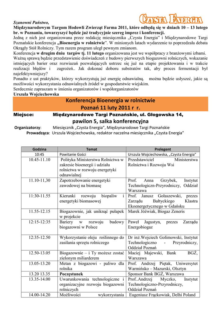 Szanowni Państwo, Międzynarodowym Targom Hodowli Zwierząt Farma 2011, które odbędą się w dniach 10 – 13 lutego br. w Poznaniu, towarzyszyć będzie juŜ tradycyjnie szereg imprez i konferencji. Jedną z nich jest organizowana przez redakcję miesięcznika „Czysta Energia” i Międzynarodowe Targi Poznańskie konferencja „Bioenergia w rolnictwie”. W minionych latach wydarzenie to poprzedzała debata Okrągły Stół Rolniczy. Tym razem program uległ pewnym zmianom. Konferencja w drugim dniu targów tj. 11 lutego organizowana jest we współpracy z branŜowymi izbami. WaŜną sprawą będzie przedstawienie doświadczeń z budowy pierwszych biogazowni rolniczych, wskazanie istniejących barier oraz rozwiazań pozwalających ustrzec się juŜ na etapie projektowania i w trakcie realizacji błędów i zagroŜeń.. Jak dokonać doboru substratów tak, aby proces fermentacji był najefektywniejszy? Ponadto z ust praktyków, którzy wykorzystują juŜ energię odnawialną. moŜna będzie usłyszeć, jakie są moŜliwości wykorzystania odnawialnych źródeł w gospodarstwie wiejskim. Serdecznie zapraszam w imieniu organizatorów i współorganizatorów Urszula Wojciechowska Konferencja Bioenergia w rolnictwie Poznań 11 luty 2011 r r. Miejsce: Międzynarodowe Targi Poznańskie, ul. Głogowska 14, pawilon 5, salka konferencyjna Organizatorzy: Miesięcznik „Czysta Energia”, Międzynarodowe Targi Poznańskie Prowadząca: Urszula Wojciechowska, redaktor naczelna miesięcznika „Czysta Energia” Godzina 10:45 10.45-11.10 11.10-11,30 11:30-11.55 11.55-12.15 12:15-12:35 12:35-12.50 12.50-13.05 13.05-13.20 13.20 13.35 13.35-14.00 14.00-14.20 Temat Prelegent Urszula Wojciechowska, „Czysta Energia” Polityka Ministerstwa Rolnictwa w zakresie bioenergii i udziału rolnictwa w rozwoju energetyki odnawialnej Zapotrzebowanie energetyki zawodowej na biomasę Przedstawiciel Ministerstwa Rolnictwa i Rozwoju Wsi Powitanie Gości Prof. Anna Grzybek, Instytut Technologiczn-Przyrodniczy, Oddział Warszawa Kierunki rozwoju biopaliw i Prof. Janusz Gołaszewski, prezes energetyki biomasowej Zarządu Bałtyckiego Klastra Ekoenergetycznego w Gdańsku Biogazownie, jak uniknąć pułapek Marek Jóźwiak, Biogaz Zeneris w projekcie Bariery w rozwoju budowy Paweł Jagustyn, prezes Zarządu biogazowni w Polsce Energobiogaz Wykorzystanie oleju roślinnego do Dr inŜ.Wojciech Golimowski, Instytut zasilania sprzętu rolniczego Technologiczno Przyrodniczy, Oddział Poznań Biogazownie – i Ty moŜesz zostać Maciej Majewski, Bank BGś, zielonym miliarderem Warszawa Metan z biogazowi - paliwo dla Prof. Andrzej Piętak, Uniwersytet rolnika Warmińsko – Mazurski, Olsztyn Sponsor Bank BGś, Warszawa Poczęstunek Uwarunkowania technologiczne i Prof..Andrzej Myczko, Instytut organizacyjne rozwoju biogazowni Technologiczno-Przyrodniczy, rolniczych Oddział Poznań MoŜliwości wykorzystania Eugeniusz Frąckowiak, Delhi Poland 14.20-14.40 odnawialnych źródeł energii w gospodarstwie wiejskim i agroturystyce Tani, odnawialny i ekologiczny Roman Długi, Asket, Poznań opał moŜe być w kaŜdej gminie 14.40-14.50 Bioelektrownia zintegrowana 14.50-15.10 Opłacalność biogazowni rolniczej Lech Ciurzyński, wiceprezes Zarządu w warunkach polskich DGA Energia 15.10-15.40 15.40 – 16.00 Marek Pituła, Energetyka Odnawialna S.A., Warszawa Po prezentacji przejście do ekspozycji i oglądanie modelowej biogazowni w rzeczywistych wymiarach wraz z urządzeniami jej towarzyszącymi. Prezentacja wszystkich elementów instalacji, które pozwolą lepiej zrozumieć potencjalnym klientom, jak wygląda i działa biogazownia. * Dyskusja moderowana Podsumowanie Prof. Andrzej Myczko, Instytut Technologiczno-Przyrodniczy, Oddział Poznań Urszula Wojciechowska *DGA Energia Sp. z o.o. wraz ze swoim partnerem technologicznym BD AgroRenewables podczas Targów Farma zaprezentuje model biogazowi i udostępnią ją zwiedzającym, aby mogli poszerzyć swą wiedzę. *Organizatorzy zastrzegają sobie możliwość zmian w programie. Wstęp wolny. Zapraszamy! Więcej informacji na stronie www.czystaenergia.pl oraz pod nr tel. 61/655-81-51. [email protected]
