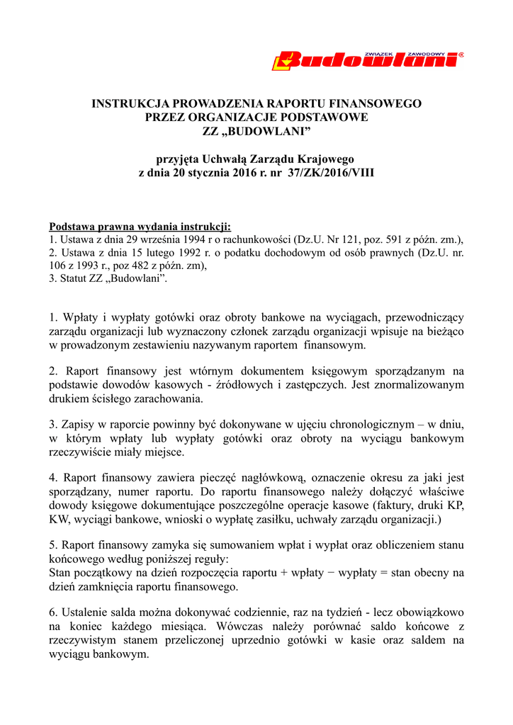 INSTRUKCJA PROWADZENIA RAPORTU FINANSOWEGO PRZEZ ORGANIZACJE PODSTAWOWE ZZ „BUDOWLANI” przyjęta Uchwałą Zarządu Krajowego z dnia 20 stycznia 2016 r. nr 37/ZK/2016/VIII Podstawa prawna wydania instrukcji: 1. Ustawa z dnia 29 września 1994 r o rachunkowości (Dz.U. Nr 121, poz. 591 z późn. zm.), 2. Ustawa z dnia 15 lutego 1992 r. o podatku dochodowym od osób prawnych (Dz.U. nr. 106 z 1993 r., poz 482 z późn. zm), 3. Statut ZZ „Budowlani”. 1. Wpłaty i wypłaty gotówki oraz obroty bankowe na wyciągach, przewodniczący zarządu organizacji lub wyznaczony członek zarządu organizacji wpisuje na bieżąco w prowadzonym zestawieniu nazywanym raportem finansowym. 2. Raport finansowy jest wtórnym dokumentem księgowym sporządzanym na podstawie dowodów kasowych - źródłowych i zastępczych. Jest znormalizowanym drukiem ścisłego zarachowania. 3. Zapisy w raporcie powinny być dokonywane w ujęciu chronologicznym – w dniu, w którym wpłaty lub wypłaty gotówki oraz obroty na wyciągu bankowym rzeczywiście miały miejsce. 4. Raport finansowy zawiera pieczęć nagłówkową, oznaczenie okresu za jaki jest sporządzany, numer raportu. Do raportu finansowego należy dołączyć właściwe dowody księgowe dokumentujące poszczególne operacje kasowe (faktury, druki KP, KW, wyciągi bankowe, wnioski o wypłatę zasiłku, uchwały zarządu organizacji.) 5. Raport finansowy zamyka się sumowaniem wpłat i wypłat oraz obliczeniem stanu końcowego według poniższej reguły: Stan początkowy na dzień rozpoczęcia raportu + wpłaty − wypłaty = stan obecny na dzień zamknięcia raportu finansowego. 6. Ustalenie salda można dokonywać codziennie, raz na tydzień - lecz obowiązkowo na koniec każdego miesiąca. Wówczas należy porównać saldo końcowe z rzeczywistym stanem przeliczonej uprzednio gotówki w kasie oraz saldem na wyciągu bankowym. 7. Oryginał zamkniętego w danym miesiącu raportu finansowego wraz z załącznikiem w postaci dołączonych dokumentów należy przechowywać w zarządzie organizacji podstawowej co najmniej przez 7 lat. 8. Kopię zamkniętego w danym miesiącu raportu finansowego (bez załączników) należy przekazać do właściwego Biura Zarządu Okręgu w terminie do 10 dnia następnego miesiąca. Biuro Zarządu Okręgu po zebraniu raportów finansowych przekazuje je niezwłocznie do Biura Zarządu Krajowego. 9. Zarząd organizacji podstawowej jest zobowiązany do bezzwłocznego okazania ww. dokumentów księgowych na polecenie: − komisji rewizyjnej funkcjonującej w organizacji podstawowej, − okręgowej komisji rewizyjnej, − Głównej Komisji Rewizyjnej, − upoważnionego pracownika Biura Zarządu Krajowego. 10. Niestosowanie się przez zarząd organizacji podstawowej do Instrukcji prowadzenia raportu finansowego może skutkować: − zawieszeniem w prawach zarządu organizacji podstawowej, − wykreśleniem organizacji podstawowej z Krajowego Rejestru Związku Zawodowego „Budowlani”. 11. Informacji nt. prowadzenia raportu finansowego przez organizacje podstawowe udziela Księgowość Związku Zawodowego „Budowlani”: Związek Zawodowy „Budowlani” ul. Mokotowska 4/6, 00-641 Warszawa, e-mail: [email protected], tel.: 22-825-60-63.