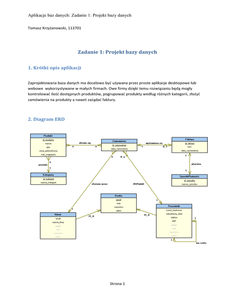 Aplikacje baz danych: Zadanie 1: Projekt bazy danych Tomasz Krzyżanowski, 113701 Zadanie 1: Projekt bazy danych 1. Krótki opis aplikacji Zaprojektowana baza danych ma docelowo być używana przez proste aplikacje desktopowe lub webowe wykorzystywane w małych firmach. Owe firmy dzięki temu rozwiązaniu będą mogły kontrolować ilość dostępnych produktów, pogrupować produkty według różnych kategorii, złożyć zamówienia na produkty a nawet zażądać faktury. 2. Diagram ERD Strona 1 Aplikacje baz danych: Zadanie 1: Projekt bazy danych 3. Opis elementów modelu Opis zbiorów encji Zbiór encji 1 : Produkt Opis Spis i magazyn dla oferowanych produktów. Atrybuty Nazwa Klucz główny Typ/ dziedzina id_produktu Tak Numeryczny Identyfikator produktu. nazwa Nie Varchar[40] Nazwa produktu. opis Nie Varchar[80] Krótki opis produktu. cena_jednos tkowa Nie stan_magaz ynu Nie Float Opis Cena za jedną sztukę. Numeryczny Ilość dostępnych sztuk produktu. Zbiór encji 2 : Kategoria Opis Spis kategorii produktów. Atrybuty Nazwa Klucz główny Typ/ dziedzina Opis id_kategorii Tak Numeryczny Identyfikator kategorii. Nazwa_kate gorii Nie Varchar[30] Nazwa kategorii produktu. Strona 2 Aplikacje baz danych: Zadanie 1: Projekt bazy danych Zbiór encji 3 : Zamowienia Opis Tabela złożonych zamówień na produkty. Atrybuty Nazwa Klucz główny id_zamowie nia Tak data_zamow ienia Nie Typ/ dziedzina Opis Numeryczny Identyfikator zamówienia. Data Data złożenia zamówienia. Zbiór encji 4 : Klient Opis Spis osób będących klientami firmy. Atrybuty Nazwa Klucz główny Typ/ dziedzina email Nie Varchar[50] Email kontaktowy klienta. nazwa_firmy Nie Varchar[50] Nazwa firmy pesel Tak imie Nie Varchar[20] Imię osoby. nazwisko Nie Varchar[40] Nazwisko osoby. adres Nie Varchar[50] Adres zamieszkania osoby. Char[11] Opis Numer pesel – identyfikator osoby. Strona 3 Aplikacje baz danych: Zadanie 1: Projekt bazy danych Zbiór encji 5 : Faktura Opis Spis wystawionych faktur. Atrybuty Nazwa Klucz główny Typ/ dziedzina Opis id_faktury Tak VAT Nie Float Stawka podatku VAT. data_wysta wienia Nie Data Data wystawienia faktury. Numeryczny Identyfikator wystawionej faktury. Zbiór encji 6 : SposóbPłatności Opis Spis możliwych sposobów płatności. Atrybuty Nazwa Klucz główny Typ/ dziedzina Opis id_sposobu Tak Numeryczny Identyfikator sposobu. nazwa_spos obu Nie Varchar[30] Nazwa sposobu zapłaty. Strona 4 Aplikacje baz danych: Zadanie 1: Projekt bazy danych Zbiór encji 7 : Osoba Opis Spis osób. Atrybuty Nazwa Klucz główny Typ/ dziedzina Opis pesel Tak Char[11] imie Nie Varchar[20] Imię osoby. nazwisko Nie Varchar[40] Nazwisko osoby. adres Nie Varchar[50] Adres zamieszkania osoby. Numer pesel – identyfikator osoby. Zbiór encji 8 : Pracownik Opis Spis osób będących zatrudnionymi w sklepie pracownikami. Atrybuty Nazwa Klucz główny Typ/ dziedzina Opis konto_bank owe Nie Char[26] zatrudniony _dnia Nie Data telefon Nie Char[9] Telefon kontaktowy do pracownika. NIP Nie Char[10] Numer identyfikacji podatkowej pracownika. pesel Tak Char[11] Numer pesel – identyfikator osoby. imie Nie Numer konta pracownika. Data zatrudnienia pracownika. Varchar[20] Imię osoby. Strona 5 Aplikacje baz danych: Zadanie 1: Projekt bazy danych nazwisko Nie Varchar[40] Nazwisko osoby. adres Nie Varchar[50] Adres zamieszkania osoby. Opis związków Nazwa związku Zbiory encji Zbiór encji 1 Zbiór encji 2 Liczność związku Opis posiada Produkt Kategoria n : 1 Produkty posiadają tylko jedną kategorię. składa się Produkt Zamowienia n : n Na zamówienia składają się różne produkty. złożone przez Zamowienia Klient n : 1 Każde zamówienie złożone przez dokładnie jednego klienta. Jeden klient może mieć wiele zamówień. Faktura 1 : 0..1 Jedna faktura opcjonalnie wystawiona na konkretne zamówienie. wystawiona Zamowienia na płacona Faktura SposóbPłatn ości 1 : 1 Jakim sposobem odbywa się płatność za fakturę. IS_A Klient Osoba 1 : 1 Klient jest podklasą osoby. obsługuje Zamowienia Pracownik 0..n : 1 Każde zamówienie realizuje/obsługuje jeden pracownik. Pracownik może obsługiwać wiele zamówień na raz, może także nie mieć żadnego. IS_A Pracownik Osoba 1 : 1 Pracownik jest podklasą osoby. ma szefa Pracownik Pracownik 1 : 1 Każdy pracownik, który ma określonego szefa jest jego podwładnym. Nie można mieć paru szefów na raz. Pracownik, który za szefa ma siebie - jest szefem. Strona 6 Aplikacje baz danych: Zadanie 1: Projekt bazy danych Schemat Relacyjnej Bazy Danych: PRODUKT (id_produktu, nazwa, opis, cena_jednostkowa, stan_magazynu, id_kategorii) (id_produktu) KEY (id_kategorii) REF KATEGORIA KATEGORIA (id_kategorii, nazwa_kategorii) (id_kategorii) KEY OSOBA (pesel, imie, nazwisko, adres) (pesel) KEY KLIENT (pesel, email, nazwa_firmy) (pesel) KEY (pesel) REF OSOBA PRACOWNIK (pesel, konto_bankowe, zatrudniony_dnia, telefon, NIP, id_szefa) (pesel) KEY (pesel) REF OSOBA (id_szefa) REF PRACOWNIK ZAMOWIENIA (id_zamowienia, data_zamowienia, pesel_klienta, pesel_pracownika) (id_zamowienia) KEY (pesel_klienta) REF KLIENT (pesel_pracownika) REF PRACOWNIK Strona 7 Aplikacje baz danych: Zadanie 1: Projekt bazy danych POZYCJA_ZAMOWIENIA (id_zamowienia, id_produktu, ilość) (id_zamowienia, id_produktu) KEY (id_zamowienia) REF ZAMOWIENIA (id_produktu) REF PRODUKT FAKTURA (id_faktury, VAT, data_wystawienia, id_zamowienia, id_sposobu) (id_faktury) KEY (id_zamowienia) REF ZAMOWIENIA (id_sposobu) REF SPOSOB_PLATNOSCI SPOSÓB_PLATNOSCI (id_sposobu, nazwa_sposobu) (id_sposobu) KEY Strona 8