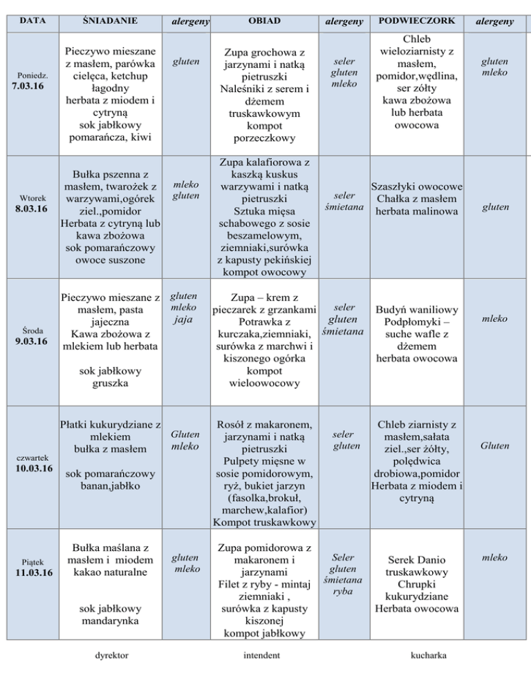 DATA Poniedz. 7.03.16 Wtorek 8.03.16 Środa 9.03.16 ŚNIADANIE Pieczywo mieszane z masłem, parówka cielęca, ketchup łagodny herbata z miodem i cytryną sok jabłkowy pomarańcza, kiwi Bułka pszenna z masłem, twarożek z warzywami,ogórek ziel.,pomidor Herbata z cytryną lub kawa zbożowa sok pomarańczowy owoce suszone alergeny gluten mleko gluten Pieczywo mieszane z gluten mleko masłem, pasta jaja jajeczna Kawa zbożowa z mlekiem lub herbata sok jabłkowy gruszka Płatki kukurydziane z Gluten mlekiem mleko bułka z masłem czwartek 10.03.16 Piątek 11.03.16 sok pomarańczowy banan,jabłko Bułka maślana z masłem i miodem kakao naturalne sok jabłkowy mandarynka dyrektor gluten mleko OBIAD Zupa grochowa z jarzynami i natką pietruszki Naleśniki z serem i dżemem truskawkowym kompot porzeczkowy Zupa kalafiorowa z kaszką kuskus warzywami i natką pietruszki Sztuka mięsa schabowego z sosie beszamelowym, ziemniaki,surówka z kapusty pekińskiej kompot owocowy alergeny seler gluten mleko seler śmietana Zupa – krem z seler pieczarek z grzankami gluten Potrawka z kurczaka,ziemniaki, śmietana surówka z marchwi i kiszonego ogórka kompot wieloowocowy Rosół z makaronem, jarzynami i natką pietruszki Pulpety mięsne w sosie pomidorowym, ryż, bukiet jarzyn (fasolka,brokuł, marchew,kalafior) Kompot truskawkowy Zupa pomidorowa z makaronem i jarzynami Filet z ryby - mintaj ziemniaki , surówka z kapusty kiszonej kompot jabłkowy intendent seler gluten Seler gluten śmietana ryba PODWIECZORK Chleb wieloziarnisty z masłem, pomidor,wędlina, ser zółty kawa zbożowa lub herbata owocowa Szaszłyki owocowe Chałka z masłem herbata malinowa Budyń waniliowy Podpłomyki – suche wafle z dżemem herbata owocowa Chleb ziarnisty z masłem,sałata ziel.,ser żółty, polędwica drobiowa,pomidor Herbata z miodem i cytryną Serek Danio truskawkowy Chrupki kukurydziane Herbata owocowa kucharka alergeny gluten mleko gluten mleko Gluten mleko