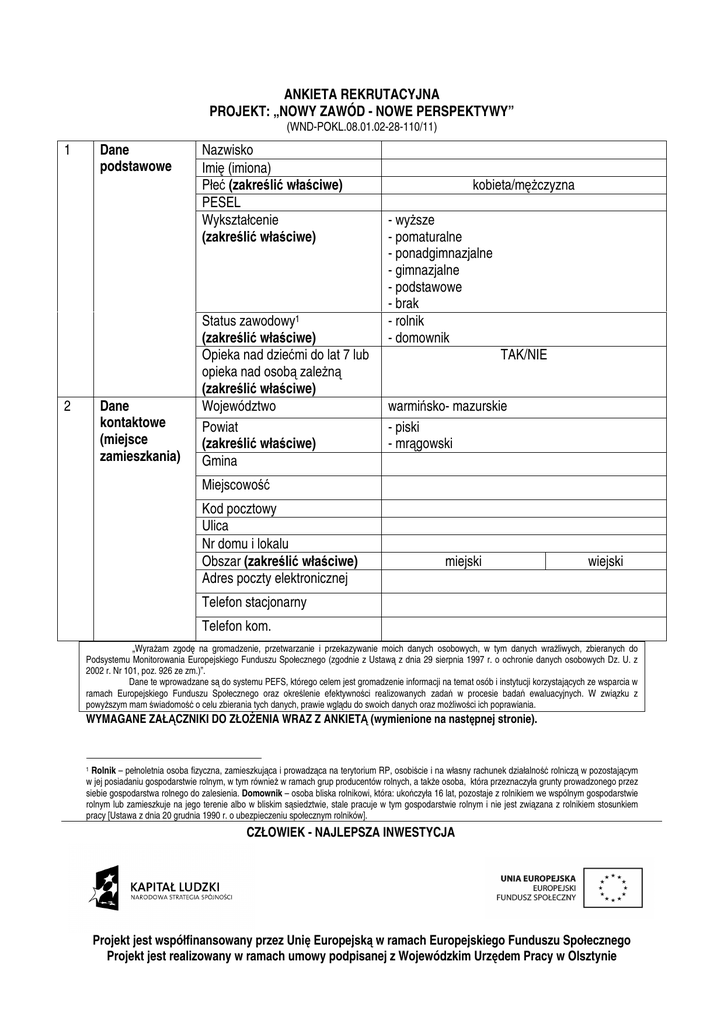 ANKIETA REKRUTACYJNA PROJEKT: „NOWY ZAWÓD - NOWE PERSPEKTYWY” (WND-POKL.08.01.02-28-110/11) Dane podstawowe 1 Dane kontaktowe (miejsce zamieszkania) 2 Nazwisko Imię (imiona) Płeć (zakreślić właściwe) PESEL Wykształcenie (zakreślić właściwe) Status zawodowy1 (zakreślić właściwe) Opieka nad dziećmi do lat 7 lub opieka nad osobą zależną (zakreślić właściwe) Województwo Powiat (zakreślić właściwe) Gmina kobieta/mężczyzna - wyższe - pomaturalne - ponadgimnazjalne - gimnazjalne - podstawowe - brak - rolnik - domownik TAK/NIE warmińsko- mazurskie - piski - mrągowski Miejscowość Kod pocztowy Ulica Nr domu i lokalu Obszar (zakreślić właściwe) Adres poczty elektronicznej miejski wiejski Telefon stacjonarny Telefon kom. „Wyrażam zgodę na gromadzenie, przetwarzanie i przekazywanie moich danych osobowych, w tym danych wrażliwych, zbieranych do Podsystemu Monitorowania Europejskiego Funduszu Społecznego (zgodnie z Ustawą z dnia 29 sierpnia 1997 r. o ochronie danych osobowych Dz. U. z 2002 r. Nr 101, poz. 926 ze zm.)”. Dane te wprowadzane są do systemu PEFS, którego celem jest gromadzenie informacji na temat osób i instytucji korzystających ze wsparcia w ramach Europejskiego Funduszu Społecznego oraz określenie efektywności realizowanych zadań w procesie badań ewaluacyjnych. W związku z powyższym mam świadomość o celu zbierania tych danych, prawie wglądu do swoich danych oraz możliwości ich poprawiania. WYMAGANE ZAŁĄCZNIKI DO ZŁOŻENIA WRAZ Z ANKIETĄ (wymienione na następnej stronie). Rolnik – pełnoletnia osoba fizyczna, zamieszkująca i prowadząca na terytorium RP, osobiście i na własny rachunek działalność rolniczą w pozostającym w jej posiadaniu gospodarstwie rolnym, w tym również w ramach grup producentów rolnych, a także osoba, która przeznaczyła grunty prowadzonego przez siebie gospodarstwa rolnego do zalesienia. Domownik – osoba bliska rolnikowi, która: ukończyła 16 lat, pozostaje z rolnikiem we wspólnym gospodarstwie rolnym lub zamieszkuje na jego terenie albo w bliskim sąsiedztwie, stale pracuje w tym gospodarstwie rolnym i nie jest związana z rolnikiem stosunkiem pracy [Ustawa z dnia 20 grudnia 1990 r. o ubezpieczeniu społecznym rolników]. 1 CZŁOWIEK - NAJLEPSZA INWESTYCJA Projekt jest współfinansowany przez Unię Europejską w ramach Europejskiego Funduszu Społecznego Projekt jest realizowany w ramach umowy podpisanej z Wojewódzkim Urzędem Pracy w Olsztynie ZAŁĄCZNIKI: 1. kopia aktualnej informacji o objęciu ubezpieczeniem społecznym wraz z potwierdzeniem zapłaty za dany kwartał lub decyzja o podleganiu ubezpieczeniu społecznemu rolników wydawana na wniosek w stosownym oddziale KRUS; 2. oświadczenie o zamiarze odejścia z rolnictwa; 3. oświadczenie o zamieszkaniu na terenie woj. warm.-maz. w powiecie piskim lub mrągowskim; 4. kopia dokumentu potwierdzającego wykształcenie. Niniejszym oświadczam, iż podane dane są zgodne z prawdą oraz zgodne z danymi zawartymi w moim ważnym dowodzie osobistym (w przypadku innego miejsca zamieszkania niż zameldowania zobowiązuję się przedłożyć stosowne oświadczenie). …………………………………………… DATA ORAZ CZYTELNY PODPIS UCZESTNIKA/KI PROJEKTU CZŁOWIEK - NAJLEPSZA INWESTYCJA Projekt jest współfinansowany przez Unię Europejską w ramach Europejskiego Funduszu Społecznego Projekt jest realizowany w ramach umowy podpisanej z Wojewódzkim Urzędem Pracy w Olsztynie