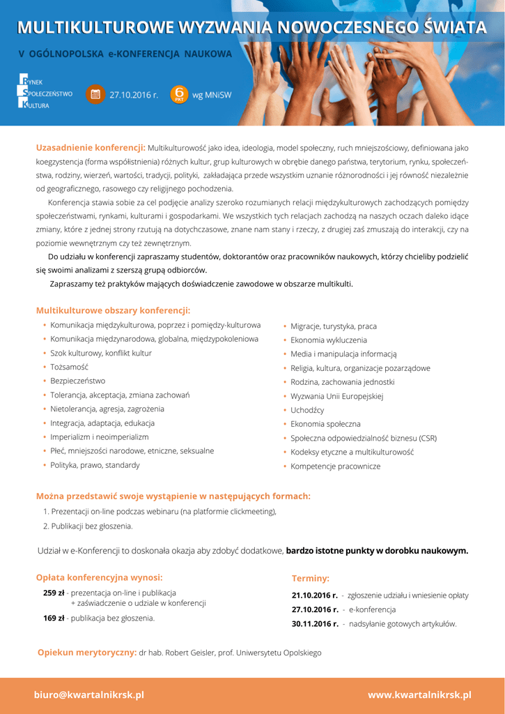 RYNEK V OGÓLNOPOLSKA e-KONFERENCJA NAUKOWA KULTURA „Multikulturowe wyzwania nowoczesnego świata” 27 października 2016 roku. Opiekun merytoryczny: dr hab. Robert Geisler, prof. Uniwersytetu Opolskiego Uzasadnienie konferencji: Multikulturowość jako idea, ideologia, model społeczny, ruch mniejszościowy, definiowana jako koegzystencja (forma współistnienia) różnych kultur, grup kulturowych w obrębie danego państwa, terytorium, rynku, społeczeństwa, rodziny, wierzeń, wartości, tradycji, polityki, zakładająca przede wszystkim uznanie różnorodności i jej równość niezależnie od geograficznego, rasowego czy religijnego pochodzenia. Konferencja stawia sobie za cel podjęcie analizy szeroko rozumianych relacji międzykulturowych zachodzących pomiędzy społeczeństwami, rynkami, kulturami i gospodarkami. We wszystkich tych relacjach zachodzą na naszych oczach daleko idące zmiany, które z jednej strony rzutują na dotychczasowe, znane nam stany i rzeczy, z drugiej zaś zmuszają do interakcji, czy na poziomie wewnętrznym czy też zewnętrznym. Do udziału w konferencji zapraszamy studentów, doktorantów oraz pracowników naukowych, którzy chcieliby podzielić się swoimi analizami z szerszą grupą odbiorców. Zapraszamy też praktyków mających doświadczenie zawodowe w obszarze multikulti. Multikulturowe obszary konferencji: • Komunikacja międzykulturowa, poprzez i pomiędzy-kulturowa • Migracje, turystyka, praca • Komunikacja międzynarodowa, globalna, międzypokoleniowa • Ekonomia wykluczenia • Szok kulturowy, konflikt kultur • Media i manipulacja informacją • Tożsamość • Religia, kultura, organizacje pozarządowe • Bezpieczeństwo • Rodzina, zachowania jednostki • Tolerancja, akceptacja, zmiana zachowań • Wyzwania Unii Europejskiej • Nietolerancja, agresja, zagrożenia • Uchodźcy • Integracja, adaptacja, edukacja • Ekonomia społeczna • Imperializm i neoimperializm • Społeczna odpowiedzialność biznesu (CSR) • Płeć, mniejszości narodowe, etniczne, seksualne • Kodeksy etyczne a multikulturowość • Polityka, prawo, standardy • Kompetencje pracownicze Można przedstawić swoje wystąpienie w następujących formach: 1. Prezentacji on-line podczas webinaru (na platformie clickmeeting), 2. Publikacji bez głoszenia. Udział w e-Konferencji to doskonała okazja aby zdobyć dodatkowe, bardzo istotne punkty w dorobku naukowym. Opłata konferencyjna wynosi: 259 zł - prezentacja on-line i publikacja + zaświadczenie o udziale w konferencji 169 zł - publikacja bez głoszenia. Terminy: 21.10.2016 r. - zgłoszenie udziału i wniesienie opłaty 27.10.2016 r. - e-konferencja 30.11.2016 r. - nadsyłanie gotowych artykułów. Opiekun merytoryczny: dr hab. Robert Geisler, prof. Uniwersytetu Opolskiego [email protected] www.kwartalnikrsk.pl