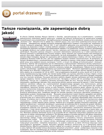 Tańsze rozwiązania, ale zapewniające dobrą jakość W ofercie Zakładu Budowy Maszyn Optimat z Ostródy, specjalizującego się w projektowaniu i produkcji jednostronnych okleiniarek wąskich płaszczyzn, znajdują się maszyny przeznaczone do wykańczania krawędzi krzywoliniowych oraz prostoliniowych. Szczególną pozycją w katalogu jest seria obrabiarek nazwana przez producenta „Economic Line”. Aktualnie linia ta składa się z czterech pozycji, przy czym firma systematycznie pracuje nad jej rozwojem. Jednogłowicowy agregat frezowania wstępnego Najnowszym modelem w tej grupie jest, wyposażony w funkcje frezowania wstępnego, Optimat 320. Z racji niewielkich gabarytów oraz parametrów pracy maszyna ta sprawdza się doskonale w małych i średniej wielkości zakładach z produkcją jednostkową lub krótkoseryjną. W celu zainstalowania okleiniarki wymagane jest dysponowanie zaledwie 3 m2 powierzchni. Korpus, na którym zainstalowane są agregaty obróbcze oraz system posuwu i docisku, wykonany jest tradycyjnie ze spawanych, stalowych profili zamkniętych. Wszystkie operacje związane z procesem okleinowania wykonywane są w trybie automatycznym. Pierwsza jednostka to jednogłowicowa frezarka wstępna, której zadaniem jest wyeliminowanie wad powstających podczas cięcia płyty. Należą do nich takie mankamenty, jak brak prostopadłości, ślad po odcinaku czy „spuchnięte” wskutek wilgoci krawędzie. Agregat ten wyposażony jest w głowicę diamentową o średnicy 125 mm, która pracuje z prędkością obrotową 9 600 obr./min. Jest ona napędzana zwykłym silnikiem asynchronicznym. W porównaniu ze stacjami dwugłowicowymi z wysokoobrotowymi silnikami, jednostka ta stanowi o wiele tańsze rozwiązanie. Natomiast jakość pracy, przy prędkości posuwu wynoszącej 7 m/min, w niczym nie odbiega od konkurencyjnych i droższych konstrukcji. Optimat 320 przystosowany jest do okleinowania z wykorzystaniem rolkowanych obrzeży wykonanych z tworzyw sztucznych. Ich grubość zawiera się w przedziale od 0,5 do 3 mm. Klej nanoszony jest za pomocą klasycznej rolki. Wcześniej, na szerokie płaszczyzny elementu naniesiony zostaje płyn antyadhezyjny. Odbywa się to za pomocą systemu natryskowego i zapobiega zabrudzeniu tych powierzchni klejem. Mechanizm zapamiętania grubości obrzeża Klej znajduje się w zbiorniku o pojemności 1,2 l. Maszyna wyposażona jest w system płynnej regulacji temperatury, która zawiera się w przedziale od 120 do 200ºC. Czas przygotowania obrabiarki do pracy wynosi od 15 do 20 min. Cechą charakterystyczną tego modelu jest również bardzo krótki czas wymiany zbiornika na drugi z klejem o innym kolorze. Wynosi on maksymalnie 5 min. Łatwy demontaż pojemnika ułatwia także czyszczenie agregatu klejowego oraz inne czynności serwisowe. Precyzyjne obcinanie nadmiaru długości obrzeża realizowane jest przez dwupiłkowy agregat napędzany również silnikiem asynchronicznym. Narzędzia o średnicy 80 mm posiadają ostrza z węglika spiekanego. Pracują one z prędkością obrotową wynoszącą 9600 obr./min. Precyzję obcięcia uzyskano dzięki zastosowaniu regulowanego zderzaka, który pozycjonuje element podczas wykonania tej operacji. Z kolei frezowanie nadmiaru szerokości odbywa się z wykorzystaniem dwugłowicowego agregatu przy równoczesnym, pełnym zaokrągleniu obrzeża o grubości 3 i 2 mm. W przypadku okleiny o grubości 1 mm wykonywane jest niepełne zaokrąglenie. Natomiast obrzeża cieńsze są tylko fazowane. Regulacja położenia głowic odbywa się ręcznie za pomocą mechanizmów śrubowych. Parametry nastawy widoczne są na mechanicznych wskaźnikach cyfrowych. Frez górny współpracuje z ramieniem dociskowym posuwu, dzięki czemu może on zmieniać swoje położenie wraz z grubością okleinowanej płyty. Dodatkowo agregat ten posiada specjalny mechanizm zderzakowy pozwalający na zapamiętanie grubości stosowanego obrzeża. Wysuwany pneumatycznie trzpień Ostatnim agregatem jest polerka. Są to dwa silniki z zamontowanymi na nich tarczami, które polerują krawędź przyklejonego obrzeża. Silniki te przemieszczają się w płaszczyźnie pionowej na dwóch suportach, a za regulację odpowiadają także mechanizmy śrubowe. W praktyce jest to niezwykle istotna jednostka, ponieważ część okleiny obrobiona mechanicznie ulega zmatowieniu i uzyskuje inny odcień koloru niż reszta obrzeża. Polerka pozwala na wyeliminowanie tego niepożądanego z punktu widzenia jakości zjawiska. Podobnie jak w przypadku agregatu frezowania wzdłużnego, górna polerka sprzężona jest z ramieniem dociskowym i pozycjonuje się automatycznie w stosunku do grubości elementu. Optimat 320 wyposażony został w posuw dolny bazujący na pasie zębatym z prowadzeniem klinowym. Precyzja prowadzenia materiału oraz żywotność transportera jest porównywalna z powszechnie stosowanym łańcuchem z nakładkami. Z kolei docisk górny realizowany jest przez rolki zamontowane na regulowanej w pionie belce. Jej pozycjonowanie odbywa się ręcznie poprzez układ śrubowy. Okleiniarka może obrabiać płyty o grubości od 16 do 42 mm. Minimalna szerokość elementów wynosi w jej przypadku 80 mm. Natomiast maksymalna uzależniona jest tylko i wyłącznie od rodzaju realizowanego zamówienia. Dla lepszego podparcia formatek płytowych stół główny wyposażony został w wysuwany wspornik. Minimalna długość oklejanych podzespołów wynosi 150 mm. W celu zapewnienia optymalnego odstępu między poszczególnymi elementami w prowadnicy maszyny zamontowano wysuwany pneumatycznie trzpień. Stan oczekiwania z mniejszym zapotrzebowaniem na energię Sterowanie funkcjami automatycznymi odbywa się z pozycji ekranu dotykowego umieszczonego w zewnętrznej kasecie. Oprócz tradycyjnych przycisków i wskaźnika temperatury, na pulpicie widoczne są także informacje dotyczące stanu poszczególnych agregatów i blokad. Wszystkie agregaty obróbcze umieszczone s