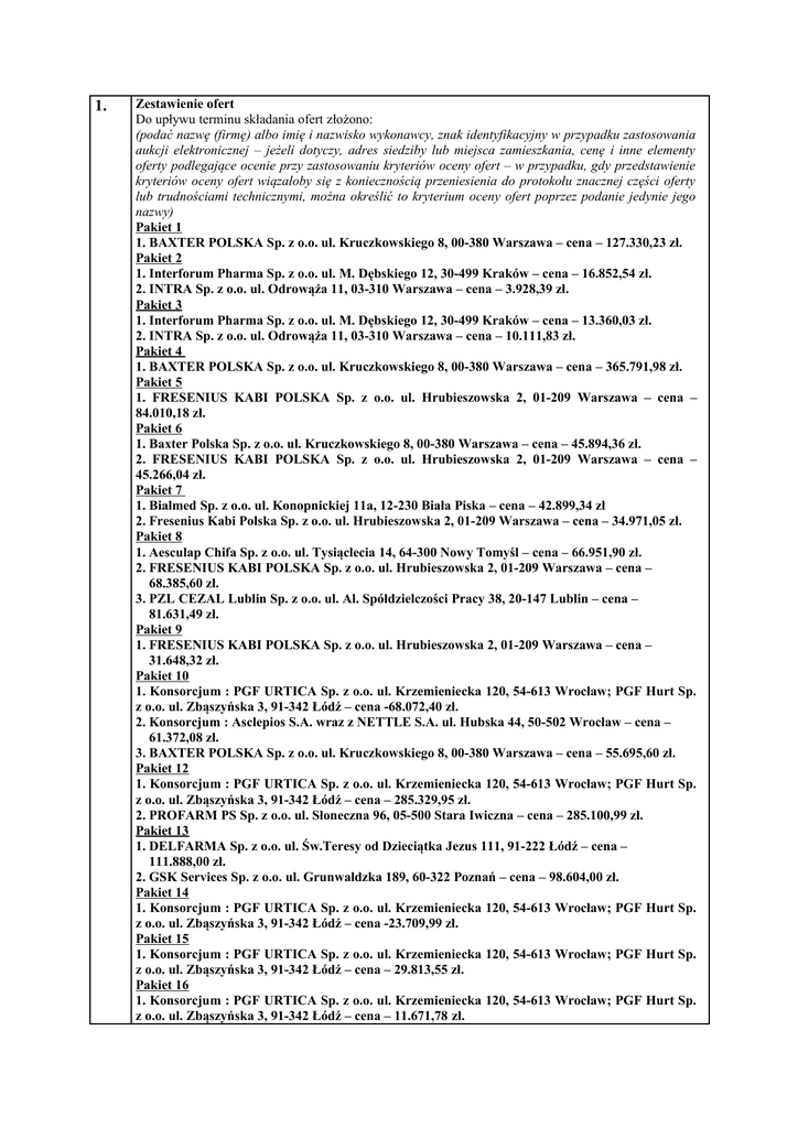 1. Zestawienie ofert Do upływu terminu składania ofert złożono: (podać nazwę (firmę) albo imię i nazwisko wykonawcy, znak identyfikacyjny w przypadku zastosowania aukcji elektronicznej – jeżeli dotyczy, adres siedziby lub miejsca zamieszkania, cenę i inne elementy oferty podlegające ocenie przy zastosowaniu kryteriów oceny ofert – w przypadku, gdy przedstawienie kryteriów oceny ofert wiązałoby się z koniecznością przeniesienia do protokołu znacznej części oferty lub trudnościami technicznymi, można określić to kryterium oceny ofert poprzez podanie jedynie jego nazwy) Pakiet 1 1. BAXTER POLSKA Sp. z o.o. ul. Kruczkowskiego 8, 00-380 Warszawa – cena – 127.330,23 zł. Pakiet 2 1. Interforum Pharma Sp. z o.o. ul. M. Dębskiego 12, 30-499 Kraków – cena – 16.852,54 zł. 2. INTRA Sp. z o.o. ul. Odrowąża 11, 03-310 Warszawa – cena – 3.928,39 zł. Pakiet 3 1. Interforum Pharma Sp. z o.o. ul. M. Dębskiego 12, 30-499 Kraków – cena – 13.360,03 zł. 2. INTRA Sp. z o.o. ul. Odrowąża 11, 03-310 Warszawa – cena – 10.111,83 zł. Pakiet 4 1. BAXTER POLSKA Sp. z o.o. ul. Kruczkowskiego 8, 00-380 Warszawa – cena – 365.791,98 zł. Pakiet 5 1. FRESENIUS KABI POLSKA Sp. z o.o. ul. Hrubieszowska 2, 01-209 Warszawa – cena – 84.010,18 zł. Pakiet 6 1. Baxter Polska Sp. z o.o. ul. Kruczkowskiego 8, 00-380 Warszawa – cena – 45.894,36 zł. 2. FRESENIUS KABI POLSKA Sp. z o.o. ul. Hrubieszowska 2, 01-209 Warszawa – cena – 45.266,04 zł. Pakiet 7 1. Bialmed Sp. z o.o. ul. Konopnickiej 11a, 12-230 Biała Piska – cena – 42.899,34 zł 2. Fresenius Kabi Polska Sp. z o.o. ul. Hrubieszowska 2, 01-209 Warszawa – cena – 34.971,05 zł. Pakiet 8 1. Aesculap Chifa Sp. z o.o. ul. Tysiąclecia 14, 64-300 Nowy Tomyśl – cena – 66.951,90 zł. 2. FRESENIUS KABI POLSKA Sp. z o.o. ul. Hrubieszowska 2, 01-209 Warszawa – cena – 68.385,60 zł. 3. PZL CEZAL Lublin Sp. z o.o. ul. Al. Spółdzielczości Pracy 38, 20-147 Lublin – cena – 81.631,49 zł. Pakiet 9 1. FRESENIUS KABI POLSKA Sp. z o.o. ul. Hrubieszowska 2, 01-209 Warszawa – cena – 31.648,32 zł. Pakiet 10 1. Konsorcjum : PGF URTICA Sp. z o.o. ul. Krzemieniecka 120, 54-613 Wrocław; PGF Hurt Sp. z o.o. ul. Zbąszyńska 3, 91-342 Łódź – cena -68.072,40 zł. 2. Konsorcjum : Asclepios S.A. wraz z NETTLE S.A. ul. Hubska 44, 50-502 Wrocław – cena – 61.372,08 zł. 3. BAXTER POLSKA Sp. z o.o. ul. Kruczkowskiego 8, 00-380 Warszawa – cena – 55.695,60 zł. Pakiet 12 1. Konsorcjum : PGF URTICA Sp. z o.o. ul. Krzemieniecka 120, 54-613 Wrocław; PGF Hurt Sp. z o.o. ul. Zbąszyńska 3, 91-342 Łódź – cena – 285.329,95 zł. 2. PROFARM PS Sp. z o.o. ul. Słoneczna 96, 05-500 Stara Iwiczna – cena – 285.100,99 zł. Pakiet 13 1. DELFARMA Sp. z o.o. ul. Św.Teresy od Dzieciątka Jezus 111, 91-222 Łódź – cena – 111.888,00 zł. 2. GSK Services Sp. z o.o. ul. Grunwaldzka 189, 60-322 Poznań – cena – 98.604,00 zł. Pakiet 14 1. Konsorcjum : PGF URTICA Sp. z o.o. ul. Krzemieniecka 120, 54-613 Wrocław; PGF Hurt Sp. z o.o. ul. Zbąszyńska 3, 91-342 Łódź – cena -23.709,99 zł. Pakiet 15 1. Konsorcjum : PGF URTICA Sp. z o.o. ul. Krzemieniecka 120, 54-613 Wrocław; PGF Hurt Sp. z o.o. ul. Zbąszyńska 3, 91-342 Łódź – cena – 29.813,55 zł. Pakiet 16 1. Konsorcjum : PGF URTICA Sp. z o.o. ul. Krzemieniecka 120, 54-613 Wrocław; PGF Hurt Sp. z o.o. ul. Zbąszyńska 3, 91-342 Łódź – cena – 11.671,78 zł. 2. FRESENIUS KABI POLSKA Sp. z o.o. ul. Hrubieszowska 2, 01-209 Warszawa – cena – 11.501,46 zł. Pakiet 17 1. Centrala Farmaceutyczna „Cefarm” S.A. ul. Jana Kazimierza 16, 01-248 Warszawa – cena – 64.882,94 zł. 2. Roche Polska Sp. z o.o. ul. Domaniewska 39B, 02-672 Warszawa – cena – 65.519,80 zł. 3. INTRA Sp. z o.o. ul. Odrowąża 11, 03-310 Warszawa – cena – 64.215,70 zł. 4. Konsorcjum: FARMACOL S.A., FARMACOL DS. Sp. z o.o. ul. Rzepakowa 2, 40-541 Katowice – cena – 64.284,65 zł. Pakiet 18 1. Konsorcjum : PGF URTICA Sp. z o.o. ul. Krzemieniecka 120, 54-613 Wrocław; PGF Hurt Sp. z o.o. ul. Zbąszyńska 3, 91-342 Łódź – cena – 125.618,82 zł. 2. Centrala Farmaceutyczna „Cefarm” S.A. ul. Jana Kazimierza 16, 01-248 Warszawa – cena – 125.183,30 zł. 3. BAXTER POLSKA Sp. z o.o. ul. Kruczkowskiego 8, 00-380 Warszawa – cena – 122.189,47 zł. 4. PROFARM PS Sp. z o.o. ul. Słoneczna 96, 05-500 Stara Iwiczna – cena – 125.244,21 zł. 5. Konsorcjum: FARMACOL S.A., FARMACOL DS. Sp. z o.o. ul. Rzepakowa 2, 40-541 Katowice - cena – 125.183,30 zł. Pakiet 19 1. BAXTER POLSKA Sp. z o.o. ul. Kruczkowskiego 8, 00-380 Warszawa – cena – 59.875,20 zł. Pakiet 20 1. Konsorcjum : Asclepios S.A. wraz z NETTLE S.A. ul. Hubska 44, 50-502 Wrocław – cena – 91.467,31 zł. 2. FRESENIUS KABI POLSKA Sp. z o.o. ul. Hrubieszowska 2, 01-209 Warszawa – cena – 90.971,10 zł. 3. PROFARM PS Sp. z o.o. ul. Słoneczna 96, 05-500 Stara Iwiczna – cena – 91.798,11 zł. 4. PZL CEZAL Lublin Sp. z o.o. ul. Al. Spółdzielczości Pracy 38, 20-147 Lublin – cena – 96.273,96 zł. Pakiet 21 1. Konsorcjum : PGF URTICA Sp. z o.o. ul. Krzemieniecka 120, 54-613 Wrocław; PGF Hurt Sp. z o.o. ul. Zbąszyńska 3, 91-342 Łódź – cena – 177.269,43 zł. Pakiet 22 1. INTRA Sp. z o.o. ul. Odrowąża 11, 03-310 Warszawa – cena – 3.580,20 zł. Pakiet 23 1. Konsorcjum : PGF URTICA Sp. z o.o. ul. Krzemieniecka 120, 54-613 Wrocław; PGF Hurt Sp. z o.o. ul. Zbąszyńska 3, 91-342 Łódź – cena – 667,93 zł. 2. Konsorcjum : Asclepios S.A. wraz z NETTLE S.A. ul. Hubska 44, 50-502 Wrocław – cena – 699,73 zł. 3. Bialmed Sp. z o.o. ul. Konopnickiej 11a, 12-230 Biała Piska – cena – 667,93 zł. 4. PROFARM PS Sp. z o.o. ul. Słoneczna 96, 05-500 Stara Iwiczna – cena – 654,53 zł. 5. PZL CEZAL Lublin Sp. z o.o. ul. Al. Spółdzielczości Pracy 38, 20-147 Lublin – cena – 763,30 zł. 6. Konsorcjum: FARMACOL S.A., FARMACOL DS. Sp. z o.o. ul. R