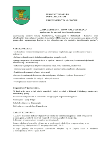 III GMINNY KONKURS POD PATRONATEM URZĘDU GMINY W KŁODAWIE ,,GMINA KŁODAWA - MOJA MAŁA OJCZYZNA”wychowanie do wartości, kształtowanie postaw. Zapraszamy uczniów Szkoły Podstawowej, Gimnazjum w Różankach i Kłodawie oraz absolwentów i mieszkańców gminy do udziału w III konkursie promującym naszą gminę. Motto przewodnie tegorocznego konkursu, to: „Wychowanie do wartości, kształtowanie postaw”. CELE KONKURSU: - doskonalenie wszechstronnego rozwoju człowieka ze względu na jego uczestniczenie w życiu rodzinnym - kulturowe kształtowanie świadomości i postaw prospołecznych - przygotowywanie człowieka do życia w zgodzie i harmonii z państwem, kształtowanie jednostki samodzielnej i autonomicznej - naturalne wydobywanie aktywności rozumu, serca, woli, charakteru, osobowości - inspirowanie uczniów i mieszkańców gminy do poszukiwań i działalności artystycznej - kształtowanie poczucia własnej tożsamości - integracja międzypokoleniowa społeczności gminy Kłodawa- „życiowe drogowskazy” - wzmacnianie szacunku dla tradycji i własnych korzeni - współpraca ze środowiskiem lokalnym UCZESTNICY KONKURSU: W konkursie może wziąć udział młodzież i dzieci ze szkół z Różanek i Kłodawy, absolwenci, mieszkańcy gminy. Uczniowie biorący udział w konkursie z następujących etapów edukacyjnych: Gimnazjum - klasy drugie Szkoła Podstawowa - klasy piąte Edukacja wczesnoszkolna - klasy drugie ZASADY KONKURSU: 1. Zakres materiału dotyczyć będzie wiadomości na temat naszej gminy, osób związanych z naszą gminą, historii, tradycji, ważnych wydarzeń, pięknych miejsc itp. 2. Konkurs przeprowadzony zostanie w dwóch etapach: I etap - szkolny– dla uczniów odbywa się w macierzystej szkole i jest przeprowadzany przez nauczycieli tej szkoły do dnia 27 lutego (poniedziałek) 2017r. II etap- gminny- dla wszystkich uczestników odbędzie się w Zespole Szkół w Kłodawie 3 marca (piątek) 2017r. o godz. 10:00. I ETAP: Dwie propozycje do wyboru - projekt multimedialny- klasy II gimnazjum 1. „Historie mieszkańców - gminne opowieści”- np. nagranie krótkiego filmu (10 min.) z ciekawym człowiekiem, mieszkańcem gminy w formie wywiadu ( np. liderką „Kłodawianek”, osobą starszą, która opowie o historii Kłodawy), p. wójt, sołtysami, mieszkańcami itd.) - opowiadanie twórcze 2. Napisz opowiadanie z perspektywy osoby (np. imigranta, gościa z innej kultury, turysty), który będzie mieszkał lub mieszka w gminie- opisz jak się klimatyzuje, czym się zachwyca, jak przyjmują go mieszkańcy, co można ulepszyć, udoskonalić- nie mniej niż 2 kartki A4. - klasy V- szkoły podstawowej - wiersz lub piosenka(możliwy układ taneczny) o miejscu zamieszkania - praca w grupach do 10 min. - lub praca indywidualna tj. „Historia wybranego zabytku” (opis + plakat- 2 kartki A3) - praca plastyczna- klasy II- edukacja wczesnoszkolna- „Najładniejsze miejsce w mojej okolicy”praca plastyczna w dowolnej technice z krótkim opisem na kartce A3. - dla absolwentów i mieszkańców gminy konkurs ma formułę otwartą, tzn. zakłada dowolność swoich prezentacji. Prace (opisane) należy złożyć w sekretariacie szkoły w Kłodawie lub przesłać pocztą elektroniczną do dnia 20 lutego 2017r. 3. Konkurs szkolny – I etap konkursu gminnego – odbędzie się w poszczególnych szkołach do dnia 27 lutego 2017r. 4. Po przeprowadzeniu I etapu szkoła wysyła zgłoszenie faksem do dnia 28 lutego 2017r. na adres Zespołu Szkół w Kłodawie. 5. Do II etapu należy wyłonić po trzy prace (opisane) z każdego etapu edukacyjnego i przysłać je do ZS w Kłodawie. II ETAP: 1. Finał konkursu odbędzie się w Zespole Szkół w Kłodawie dnia 3 marca 2017r. o godz. 10:00. 2. Finaliści I etapu będą prezentowali swoje prace przed komisją konkursową. Prosimy o zwrócenie uwagi na sposób przedstawiania prac przez uczniów tj. referowanie, opowiadanie. 3. Absolwenci i mieszkańcy gminy indywidualnie zdecydują o sposobie wyeksponowania i prezentacji swoich prac podczas finału konkursu. PRAWA AUTORSKIE: 1. Przekazanie prac do udziału w konkursie traktowane jest, jako równoczesne oświadczenie, że projekt nie narusza praw osób trzecich, w szczególności nie narusza ich majątkowych i osobistych praw autorskich. 2. Zwycięskie projekty stają się własnością organizatora- ZS w Kłodawie, który zastrzega sobie prawo do ich wykorzystania i publikacji. NAGRODY: Wszyscy uczestnicy konkursu będą wyróżnieni i nagrodzeni. Organizatorzy: Zespół Szkół w Kłodawie; koordynator- Edyta Ralcewicz - tel. 957311425 Wszystkich uczestników prosimy o potwierdzenie udziału w konkursie do dnia : 13 stycznia 2017r. na adres: [email protected] lub telefonicznie. Informacje o konkursie znajdują się na stronie internetowej szkoły w Kłodawie. Serdecznie zapraszamy i zachęcamy do udziału w konkursie!