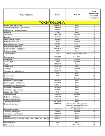 Nazwa badania Symbol Materiał Czas oczekiwania w dniach roboczych TOKSYKOLOGIA Acebutolol – jakościowo Alkaloidy tropanowe – jakościowo Amfetamina – test narkotyczny Arabinitol Amiodaron Baklofen Barbiturany w moczu Barbiturany we krwi Benzodiazepiny w moczu Benzodiazepiny we krwi Chlorprotiksen – jakościowo Chrom w moczu Chrom we krwi Cykosporyna Digoksyna Fenobarbital Fenol Fenotiazyna Fenytoina Fluoksetyna – jakościowo Fluor Glin w moczu Glin we krwi Haloperidol – jakościowo Hemineuryna – jakościowo Hydroksyzyna – jakościowo Ibuprofen – jakościowo Imipramina – jakościowo Kanabinoidy (THC) Karbamazepina Kodeina – jakościowo Kofeina – jakościowo Kwas trójchlorooctowy Kwas mykofenolowy Kwas walproinowy Lamitrin (Lamotrygina) Mianseryna – jakościowo Metadon Narkotyki w moczu zestaw (AMP, COC, THC, BZO, MOP) Nikiel w moczu Nikiel we krwi ACEBU-M Mocz ALKTR-M Mocz AMFET Mocz ARABIN Mocz AMIODAR Surowica BAKLOF Mocz BARB-M Mocz BARB Surowica BENZ-M Mocz BENZ Surowica CHLOR-M Mocz CR-M Mocz CR-S Krew EDTA, krew heparynowa CYKLOSP Krew EDTA DIGOKS Surowica PHNB Surowica FENOL-M Mocz FENOTIA Mocz FENYTO Surowica FLUOK-M Mocz F-M Mocz AL-M Mocz AL Surowica HALOP-M Mocz HEMIN-M Mocz HYDRK-M Mocz IBUPR-M Mocz IMIPR-M Mocz THC Mocz KARBAM Surowica KODEI-M Mocz KOFEI-M Mocz KWTRCHL Mocz KWMYKOF Surowica, krew EDTA, parametr niestabilny, wskazane pobranie w punkcie Stępińska WALPRO Surowica LAMITRI Surowica MIANS-M Mocz METHA Mocz NARKOT Mocz NI-M Mocz NI Krew EDTA 1 1 1 2 10 5 5 4 1 2 1 10 10 4 1 1 10 12 12 1 10 12 10 1 1 1 1 1 1 4 1 1 10 14 1 14 1 2 1 10 10 Ołów w moczu Ołów we krwi Paracetamol Propafenon Rapamycyna (Sirolimus) Rodanki – ilościowo Rozpuszczalniki organiczne – jakościowo Rtęć w moczu Rtęć we krwi Salicylany w moczu Salicylany we krwi Sertralina – jakościowo Sulfonamidy – jakościowo Sulpiryd – jakościowo Teofilina Tianeptyna – jakościowo Topiramat (Topamax) Tramadol – jakościowo Trójcykliczne antydepresanty (TCA) PB-M Mocz PB Krew EDTA PARACET Surowica PROPA Surowica, parametr niestabilny, wskazane pobranie w punkcie Stępińska RAPAMYC Krew EDTA RODANKI Krew heparynowa ROZPORG Krew heparynowa HG-M Mocz HG Krew EDTA SALIC-M Mocz SALIC Surowica SERTR-M Mocz SULFO-M Mocz SULPI-M Mocz THEO Surowica TIANE-M Mocz TOPAMA Surowica TRAMA-M Mocz TCA Surowica, mocz PAKIETY TOKSYKOLOGICZNE Biomarkery konsumpcji alkoholu Biomarkery konsumpcji alkoholu Biomarkery konsumpcji alkoholu Biomarkery konsumpcji alkoholu Skryning substancji psychoaktywnych (57 związków) Skryning substancji psychoaktywnych (60 związków) Skryning leków „Pigułki gwałtu – płynne ekstazy” Metabolity metadonu BUP/NBUP Opiaty i opioidy BKALK1 S, M BKALK2 W BKALK3 S, M, PJU BKALK4 S PSYCHO1 PJU PSYCHO2 S LEKISK1 M EKSTAZ2 S, M META-M S BUP-W S OPIATYP S, M, PJU TCATDM S Monitorowanie terapii lekami: antydepresanty Monitorowanie terapii lekami: antydepresanty ADETDM1 S ADETDM2 S Monitorowanie terapii lekami: leki przeciwpadaczkowe PADTDM1 S Monitorowanie terapii lekami: leki przeciwpadaczkowe PADTDM2 S Monitorowanie terapii lekami: leki przeciwpadaczkowe PADTDM3 S Monitorowanie terapii lekami: leki przeciwpadaczkowe PADTDM4 S Monitorowanie terapii lekami: trójcykliczne antydepresanty Monitorowanie terapii lekami: zonisamid Monitorowanie terapii lekami: psychostymulanty Monitorowanie terapii lekami: antypsychotyki (neuroleptyki) Monitorowanie terapii lekami: antypsychotyki (neuroleptyki) Monitorowanie terapii lekami: benzodiazepiny ZONITDM S PSSYTDM S NLETDM2 S NLETDM1 S BENZTDM S 10 10 1 4 5 1 1 10 10 5 5 1 1 1 12 1 10 1 3 Monitorowanie terapii lekami: leki antyarytmiczne Monitorowanie terapii lekami: immunosupresanty Monitorowanie terapii lekami: immunosupresanty AARYTDM S ISUTDM1 S ISUTDM2 K-EDTA