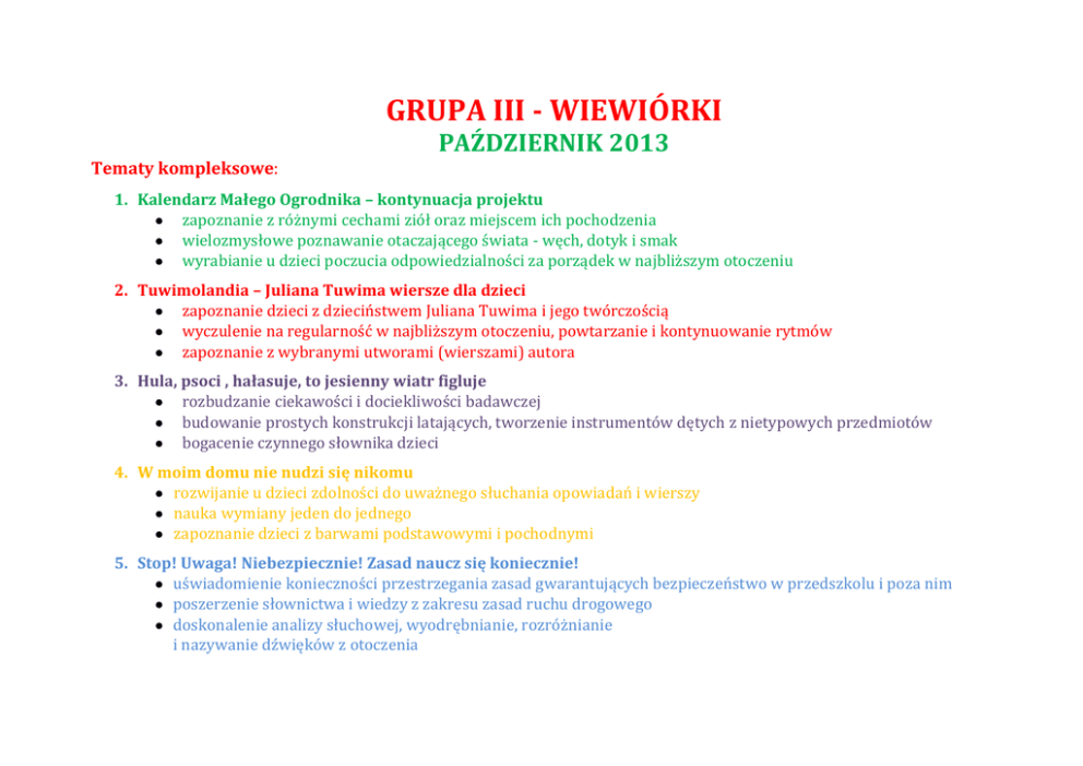 GRUPA III - WIEWIÓRKI Tematy kompleksowe: PAŹDZIERNIK 2013 1. Kalendarz Małego Ogrodnika – kontynuacja projektu zapoznanie z różnymi cechami ziół oraz miejscem ich pochodzenia wielozmysłowe poznawanie otaczającego świata - węch, dotyk i smak wyrabianie u dzieci poczucia odpowiedzialności za porządek w najbliższym otoczeniu 2. Tuwimolandia – Juliana Tuwima wiersze dla dzieci zapoznanie dzieci z dzieciństwem Juliana Tuwima i jego twórczością wyczulenie na regularność w najbliższym otoczeniu, powtarzanie i kontynuowanie rytmów zapoznanie z wybranymi utworami (wierszami) autora 3. Hula, psoci , hałasuje, to jesienny wiatr figluje rozbudzanie ciekawości i dociekliwości badawczej budowanie prostych konstrukcji latających, tworzenie instrumentów dętych z nietypowych przedmiotów bogacenie czynnego słownika dzieci 4. W moim domu nie nudzi się nikomu rozwijanie u dzieci zdolności do uważnego słuchania opowiadań i wierszy nauka wymiany jeden do jednego zapoznanie dzieci z barwami podstawowymi i pochodnymi 5. Stop! Uwaga! Niebezpiecznie! Zasad naucz się koniecznie! uświadomienie konieczności przestrzegania zasad gwarantujących bezpieczeństwo w przedszkolu i poza nim poszerzenie słownictwa i wiedzy z zakresu zasad ruchu drogowego doskonalenie analizy słuchowej, wyodrębnianie, rozróżnianie i nazywanie dźwięków z otoczenia