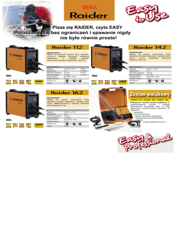 SERIA Pisze się RAIDER, czyta EASY: Poruszanie się bez ograniczeń i spawanie nigdy nie było równie proste! Zastosowanie Idealny do drobnych napraw bram, ogrodzeń, rusztowań, narzędzi roboczych, konstrukcji metalowych o nieduŜej grubości, wykonywania obudów metalowych, wiat, itp... Zastosowanie Idealny do napraw, konserwacji, bram, ogrodzeń, obudów metalowych, narzędzi rolniczych, średnich konstrukcji stalowych, karoserii, wiat, itp... Dane techniczne Napięcie Bezpiecznik Moc Max pobierana Zakres regulacji Prąd spawania Stopień ochrony Dane techniczne ABS Wymiary cm 13 Anti-Shock CięŜar 4,7 Kg MMA 1x115V • ± 15% 1x230 V 16 A 16 A Moc 2,76 kW 2,76 kW 10 - 85 A 10 - 85 A 85 A (20% - 25°C) Napięcie Bezpiecznik Moc Max pobierana Zakres regulacji Prąd spawania Stopień ochrony 1x230 V • ± 15% ABS Wymiary cm 13 Anti-Shock CięŜar 4,7 Kg MMA IP 21 S x 31,5 x24 16 A 4,48 kW 10 - 130 A 130 A (25% - 25°C) IP 21 S x 31,5 x 24 Zestaw walizkowy Zastosowanie Idealny do napraw, konserwacji, bram, ogrodzeń, obudów metalowych, narzędzi rolniczych, średnich konstrukcji, karoserii, belkowań, profili blaszanych, itp... Napięcie Bezpiecznik Moc Max pobierana Zakres regulacji Prąd spawania Stopień ochrony MMA ABS Anti-Shock 1x230 V • ± 15% 16 A 5,49 kW 10 - 160 A 150 A (20% - 25°C) IP 21 S Wymiary cm 13 CięŜar 4,7 Kg x 31,5 x 24 Raider 112 • Raider 142 • Raider 162 Praktyczny i solidny zestaw walizkowy do przechowywania, ochrony i łatwego przenoszenia wszystkiego tego, co słuŜy zachowaniu natychmiastowej gotowości do spawania: • spawarka, • uchwyt elektrody, • zacisk mocowania uziemienia, • odrdzewiacz (szczotka/młotek), • maska • zestaw elektrod od Ø 2.5