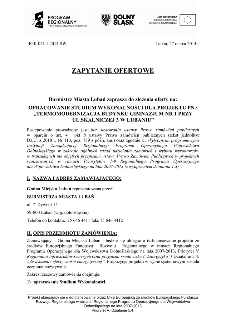 IGK.041.1.2014.SW Lubań, 27 marca 2014r. ZAPYTANIE OFERTOWE Burmistrz Miasta Lubań zaprasza do złożenia oferty na: OPRACOWANIE STUDIUM WYKONALNOŚCI DLA PROJEKTU PN.: „TERMOMODERNIZACJA BUDYNKU GIMNAZJUM NR 1 PRZY UL.SKALNICZEJ 3 W LUBANIU” Postępowanie prowadzone jest bez stosowania ustawy Prawo zamówień publicznych w oparciu o art. 4 pkt 8 ustawy Prawo zamówień publicznych (tekst jednolity: Dz.U. z 2010 r. Nr 113, poz. 759 z późn. zm.) oraz zgodnie z „Wytycznymi programowymi Instytucji Zarządzającej Regionalnego Programu Operacyjnego Województwa Dolnośląskiego w zakresie ogólnych zasad udzielania zamówień i wyboru wykonawców w transakcjach nie objętych przepisami ustawy Prawo Zamówień Publicznych w projektach realizowanych w ramach Priorytetów 1-9 Regionalnego Programu Operacyjnego dla Województwa Dolnośląskiego na lata 2007-2013 (z wyłączeniem działania 1.3)”. I. NAZWA I ADRES ZAMAWIAJĄCEGO: Gmina Miejska Lubań reprezentowana przez: BURMISTRZA MIASTA LUBAŃ ul. 7 Dywizji 14 59-800 Lubań (woj. dolnośląskie) Telefon do kontaktu:. 75 646 4411 faks 75 646 4412 II. OPIS PRZEDMIOTU ZAMÓWIENIA: Zamawiający – Gmina Miejska Lubań - będzie się ubiegać o dofinansowanie projektu ze środków Europejskiego Funduszu Rozwoju Regionalnego w ramach Regionalnego Programu Operacyjnego dla Województwa Dolnośląskiego na lata 2007-2013, Priorytet V Regionalna infrastruktura energetyczna przyjazna środowisku („Energetyka”) Działanie 5.4. „Zwiększenie efektywności energetycznej”. Propozycja projektu w trybie systemowym została oceniona pozytywnie. Zakres rzeczowy zamówienia obejmuje: 1) opracowanie Studium Wykonalności. Projekt ubiegający się o dofinansowanie przez Unię Europejską ze środków Europejskiego Funduszu Rozwoju Regionalnego w ramach Regionalnego Programu Operacyjnego dla Województwa Dolnośląskiego na lata 2007-2013 Priorytet V. Działanie 5.4. Studium Wykonalności stanowić będzie obligatoryjny załącznik do wniosku o dofinansowanie projektu i musi być opracowane zgodnie z obowiązującą metodologią, zasadami i wytycznymi Instytucji Zarządzającej RPO WD 2007-2013 w przedmiotowym zakresie: Metodologia opracowania studium wykonalności - analiza ekonomicznofinansowa na potrzeby Regionalnego Programu Operacyjnego Województwa Dolnośląskiego 2007-2013 (wersja z 4.01.2012 r.) obowiązująca Wnioskodawców składających propozycje projektów/projekty w ramach Regionalnego Programu Operacyjnego dla Województwa Dolnośląskiego na lata 2007-2013, w odpowiedzi na nabory ogłaszane i opublikowane po 4 stycznia 2012 r. na stronie www.rpo.dolnyslask.pl Struktura i zawartość dokumentu musi być zgodna z Ramową strukturą i zawartością Studium Wykonalności określoną w w/w Metodologii. Dokument należy opracować w czterech egzemplarzach w języku polskim (cztery w formie pisemnej plus jeden w formie elektronicznej) oraz odrębnie dwa egzemplarze w zapisie cyfrowym (dysk CD) załącznika Nr 1 do Studium Wykonalności – Założenia projekcji finansowej dla celów przeprowadzenia analizy ekonomiczno-finansowej (scenariusz z projektem i bez projektu). Studium Wykonalności będzie weryfikować, czy dany projekt ma dobre podstawy do realizacji i czy odpowiada potrzebom Beneficjenta – Gminie Miejskiej Lubań. Studium będzie stanowić plan projektu. Muszą w nim zostać określone i krytycznie przeanalizowane wszystkie szczegóły operacyjne jego wdrażania, a więc uwarunkowania handlowe, techniczne, finansowe, ekonomiczne, instytucjonalne, społeczno-kulturowe oraz związane ze środowiskiem naturalnym. Studium wykonalności pozwoli na określenie rentowności finansowej i ekonomicznej, a w rezultacie jasne uzasadnienie celu realizacji projektu. Studium Wykonalności zostanie opatrzone logotypami oraz informacją o współfinansowaniu projektu zgodnie z wytycznymi krajowymi i IZ RPO WD w przedmiotowym zakresie. 2) opracowanie Wniosku o dofinansowanie. Wniosek o dofinansowanie projektu należy wypełnić w aplikacji komputerowej dostępnej na stronie internetowej: www.rpo.dolnyslask.pl zgodnie z instrukcją wypełniania wniosku. Dodatkowe informacje pomocne w przygotowaniu wniosku o dofinansowanie znajdują się w Poradniku dla Beneficjenta w ramach RPO WD 2007-2013 z wyłączeniem Działania 1.1, 1.2, 5.1 i 5.3 oraz Priorytetu 10. Wniosek należy opracować w czterech egzemplarzach w języku polskim (cztery w formie pisemnej plus jeden w formie elektronicznej). III. SPOSÓB OKREŚLENIA CENY Cenę ofertową należy określić jako ryczałtową dla całego zakresu robót wyrażoną w PLN. Zamawiający nie dopuszcza składania ofert częściowych i wariantowych. IV. TERMIN WYKONANIA ZAMÓWIENIA Miejsce wykonania zamówienia – siedziba Wydziału IGK Urzędu Miasta Lubań, Plac Lompy 1, 59-800 Lubań. Ostateczną wersję Studium Wykonalności oraz Wniosku o dofinansowanie należy złożyć w miejscu określonym wyżej. Wersje robocze Studium Wykonalności i Wniosku o dofinansowanie będą uzgadniane w formie elektronicznej. 2 Ostateczna wersja SW i Wniosku o dofinansowanie zostanie zatwierdzona drogą mailową. Termin wykonania zamówienia: Termin złożenia ostatecznych wersji Studium Wykonalności i Wniosku o dofinansowanie 21 kwietnia 2014r. V. WARUNKI UDZIAŁU POTWIERDZAJĄCE W POSTĘPOWANIU. W POSTĘPOWANIU ORAZ DOKUMENTY SPEŁNIANIE WARUNKÓW UDZIAŁU Wykonawcy ubiegający się o zamówienie publiczne muszą spełniać niżej wymienione warunki udziału w postępowaniu: 1) posiadać odpowiednie wykształcenie techniczne i praktykę zawodową, 2) posiadać niezbędną wiedzę i doświadczenie. Ocena spełnienia w/w warunków udziału w oparciu o złożone przez Wykonawcę: w postępowaniu dokonywana będzie a) wykaz opracowanych SW – sporządzony przez Wykonawcę z wykorzystaniem Załącznika Nr 2 do niniejszego zaproszenia – wymagane jest udokumentowanie opracowania co najmniej dwóch SW. b) wykaz osób, kt