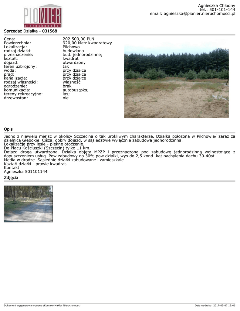 Agnieszka Chłodny tel.: 501-101-144 email: [email protected] Sprzedaż Działka - 031568 Cena: Powierzchnia: Lokalizacja: rodzaj działki: przeznaczenie: kształt: dojazd: teren uzbrojony: woda: prąd: kanalizacja: rodzaj własności: ogrodzenie: komunikacja: tereny rekreacyjne: drzewostan: 202 500,00 PLN 920,00 Metr kwadratowy Pilchowo budowlana bud. jednorodzinne; kwadrat utwardzony tak przy działce przy działce przy działce własność brak autobus;pks; las; nie Opis Jedno z niewielu miejsc w okolicy Szczecina o tak urokliwym charakterze. Działka połozona w Pilchowie/ zaraz za dzielnicą Głębokie. Cisza, dobry dojazd, w sąsiedztwie wyłącznie zabudowa jednorodzinna. Lokalizacja przy lesie - piękne otoczenie. Do Placu Kościuszki (Szczecin) tylko 11 km. Dojazd drogą utwardzoną. Działka objęta MPZP i przeznaczona pod zabudowę jednorodzinną wolnostojącą z dopuszczeniem usług. Pow.zabudowy do 30% pow.działki, wys.do 2,5 kond.,kąt nachylenia dachu 30-40st.. Media w drodze. Sąsiednie działki zabudowane i zamieszkałe. Kształt działki - prawie kwadrat. Kontakt Agnieszka 501101144 Zdjęcia Dokument wygenerowany przez eKomako Makler Nieruchomości Data wydruku: 2017-03-07 12:46