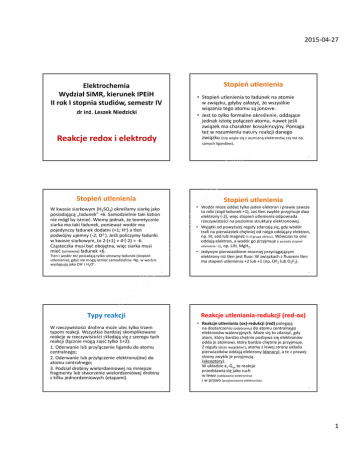2015-04-27 Elektrochemia Wydział SiMR, kierunek IPEiH II rok I stopnia studiów, semestr IV dr inż. Leszek Niedzicki Reakcje redox i elektrody Stopień utlenienia • Stopień utlenienia to ładunek na atomie w związku, gdyby założyć, że wszystkie wiązania tego atomu są jonowe. • Jest to tylko formalne określenie, oddające jednak istotę połączeń atomu, nawet jeśli związek ma charakter kowalencyjny. Pomaga też w rozumieniu natury reakcji danego związku (czy wiąże się z wymianą elektronów, czy też np. samych ligandów). 2 Stopień utlenienia Stopień utlenienia W kwasie siarkowym (H2SO4) określamy siarkę jako posiadającą „ładunek” +6. Samodzielnie taki kation nie mógł by istnieć. Wiemy jednak, że teoretycznie siarka ma taki ładunek, ponieważ wodór ma pojedynczy ładunek dodatni (+1; H+) a tlen podwójny ujemny (-2; O2-). Jeśli policzymy ładunki w kwasie siarkowym, to 2·(+1) + 4·(-2) = -6. Cząsteczka musi być obojętna, więc siarka musi mieć (umowny) ładunek +6. • Wodór może oddać tylko jeden elektron i prawie zawsze to robi (stąd ładunek +1), zaś tlen zwykle przyjmuje dwa elektrony (-2), więc stopień utlenienia odpowiada rzeczywistości na poziomie struktury elektronowej. • Wyjątki od powyższej reguły zdarzają się, gdy wodór trafi na pierwiastek chętniej od niego oddający elektron, np. lit, sód lub magnez (I i II grupa okresu). Wówczas to one oddają elektron, a wodór go przyjmuje (i posiada stopień utlenienia –1), np. LiH, MgH2. • Jedynym pierwiastkiem mocniej przyciągającym elektrony niż tlen jest fluor. W związkach z fluorem tlen ma stopień utlenienia +2 lub +1 (np. OF2 lub O2F2). Tlen i wodór też posiadają tylko umowny ładunek (stopień utlenienia), gdyż nie mogą istnieć samodzielnie. Np. w wodzie występują jako OH- i H3O+. 3 Typy reakcji 4 Reakcje utleniania-redukcji (red-ox) • Reakcje utleniania (ox)-redukcji (red) polegają na dostarczeniu (odebraniu) do atomu centralnego elektronów walencyjnych. Może się to zdarzyć, gdy atom, który bardzo chętnie pozbywa się elektronów odda je atomowi, który bardzo chętnie je przyjmuje. Z reguły (dużo wyjątków!), atomy z lewej strony układu pierwiastków oddają elektrony (donory), a te z prawej strony zwykle je przyjmują (akceptory). W układzie ez-Gox te reakcje przedstawia się jako ruch w lewo (oddawanie elektronów) i w prawo (przyjmowanie elektronów). W rzeczywistości drobina może ulec tylko trzem typom reakcji. Wszystkie bardziej skomplikowane reakcje w rzeczywistości składają się z szeregu tych reakcji (łącznie mogą zajść tylko 1+2): 1. Oderwanie lub przyłączenie ligandu do atomu centralnego; 2. Oderwanie lub przyłączenie elektronu(ów) do atomu centralnego; 3. Podział drobiny wielordzeniowej na mniejsze fragmenty lub stworzenie wielordzeniowej drobiny z kilku jednordzeniowych (etapami). 5 6 1 2015-04-27 Reakcje połówkowe • Proces utleniania-redukcji może być rozróżniony jako dwa osobne procesy – utleniania z jednej strony i redukcji z drugiej. Z tego powodu piszemy zwykle osobno obie reakcje, następnie uzgadniamy ilość elektronów po obu stronach równań i dopiero uzyskujemy stechiometrię reakcji. Np.: Na(s) → Na+ + e- /·2 (reduktor – sód – utlenia się) Cl2(g) + 2e- → 2Cl- /·1 (utleniacz – chlor – redukuje się) 2Na(s) + Cl2(g) → 2NaCl(s) Reakcje redox • Typowymi reakcjami redox są reakcje między metalami: 2Fe3+(aq) + Sn2+(aq) → 2Fe2+(aq) + Sn4+(aq) Fe3+ + e- → Fe2+ Sn2+ → Sn4+ + 2e2+ • Cu (aq) + Zn(s) → Cu(s) + Zn2+(aq) Oczywiście jony nie są zawieszone w próżni, realna reakcja (przykładowa na tych jonach) to: CuSO4(aq) + Zn(s) → Cu(s) + ZnSO4(aq) 7 8 Reakcje red-ac i ox-bas (mieszane) • W rzeczywistości bardzo duży odsetek reakcji to powiązane ze sobą reakcje utleniania/redukcji i kwasowo-zasadowych. Polegają one jednoczesnym oddaniu ligandu i pobraniu elektronu (ox-bas) lub jednoczesnym przyjęciu ligandu i oddaniu elektronu (red-ac). • Przykładem takiej reakcji może być na przykład reakcja tworzenia siarczanu sodu: Reakcje red-ac i ox-bas ez 8 ( ) - niestabilne SO42- 7 S2O726 SO3 S2O62- S2O52- 4 SO2 (S2O42-) (SO22-) S2O32- 3 (SO2+) 2 Na2S + 2O2 Na2SO4 cztery etapy, w tym: I: S2- → S + 2e- / O2 + 4e- → 2O2- / S + O2- → SO2IV: SO32-→SO3 + 2e- / O2 + 4e-→2O2- / SO3 + O2-→SO42- SO32- 5 (SO2-) (SO) 1 0 +6 +5 +4 +3 +2 +1 S0 S22- S2- 0 -1 -2 Gox 9 Reakcje red-ac i ox-bas 10 Reakcje red-ac i ox-bas Reakcje zachodzące w akumulatorze kwasowo-ołowiowym (w tym przypadku zapis protonu jako H+(aq) jest równoznaczny z zapisem „H3O+” bez potrzeby uwzględniania wód w bilansie): Pb(s)+ H2SO4(aq) → PbSO4(s)+ 2H+(aq)+ 2e- (Pb → Pb2+ + 2e-) PbO2(s)+ H2SO4(aq)+ 2H+(aq)+ 2e- → PbSO4(s)+ 2H2O (Pb2+ + 2e- → Pb) (2O2- + 4H+ → 2H2O) • Nadmanganian potasu (fioletowy/ciemnoróżowy, w kwasie robi się bezbarwny, bladoróżowy), reakcja zachodzi w całości w wodzie, wiec nie ma potrzeby pisania przy wszystkich reagentach (aq): 2KMnO4 + 3H2SO4 + 5KNO2 → 2MnSO4 + 5KNO3 + K2SO4 (8H3O+ + MnO4- +5e- → Mn2+ + 12H2O) /·2 (NO2- + 3H2O → NO3- + 2H3O+ + 2e-) /·5 (16H3O+ + 2MnO4- +10e- → 2Mn2+ + 24H2O) (5NO2- + 15H2O → 5NO3- + 10H3O+ + 10e-) Lub spalanie termitu (np. Fe2O3 + Al → Fe + Al2O3) 11 12 2 2015-04-27 Reakcje red-ac i ox-bas ez ox-bas 8 MnO4- MnO42- -8x-5 7 Reakcje red-ac i ox-bas 2xMn ez 8 -16x-10 7 6 6 5 5 4 MnO2 +2x+2 3 3 2 2 1 -2 0 (O2-) +10x+10 -1 OH- NO3- 4 MnO2- ez 5N NO2- +1x0 red-ac -2 H2O -3 H3O+ Gox ac 6H +6x0 1 Mn2+ 0 +7 +6 +5 +4 +3 +2 Mn +1 0 N2 0 -1 Gox +5 +4 +3 +2 +1 0 -1 -2 -3 Gox 13 Zależność zachodzenia reakcji od pH 14 Zależność zachodzenia reakcji od pH Obecność H3O+ lub OH- w odpowiednim stężeniu może być traktowana jak obecność dowolnego innego składnika. Tak więc jeśli do zajścia reakcji potrzebne są protony (jony H+) lub jony wodorotlenowe (OH-), wówczas reakcja jest zależna od pH (a