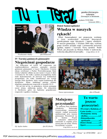 gazetka informacyjno-kulturalna Gimnazjum w Skrobowie wydanie XVII/2004 kwiecień 2004 r.. Dzień Samorządności Władza w naszych rękach! Dzień Samorządności jest propozycją wcielania w życie uczniowskich rozwiązań dotyczących uatrakcyjniania zajęć lekcyjnych i imprez szkolnych. W naszym gimnazjum, 1 kwietnia 2004 roku, wybrana grupa uczniów przejęła rządy i postanowiła pracować zgodnie, mądrze i wytrwale. Nowy dyrektor –Rafał Włoch, jak przystało na Mistrza Polski w taekwon-do, waleczną ręką pilnował porządku. (ciąg dalszy str.4) Pan dyrektor przekazuje symboliczny klucz nowemu „dyrektorowi” Rafałowi (fot.M.K Przekazanie władzy (fot.M.Kaczor) IV Turniej gminnych gimnazjów Niegościnni gospodarze Już tradycyjnie od trzech lat rozgrywany jest współzawodnictwo sportowe pomiędzy naszymi gminnymi gimnazjami w Łucce i Skrobowie. Czwarta edycja rywalizacji o Puchar Przewodniczącego Rady Gminy Lubartów odbyła się tym razem w Łucce w dniu 2 kwietnia br. Do walki o puchar przystąpiliśmy chyba mało skoncentrowani, bo pierwsze trzy konkurencje przegraliśmy. Do walki zmobilizował nas występ naszego Pana dyrektora, który wygrał konkurencję dla dyrektorów. Mimo ambitnego pościgu niestety ulegliśmy gospodarzom rozgrywek w stosunki 18:12. Tak już jest od lat, że gospodarze, którym pomagają nawet ściany, zdobywają puchar. Do zobaczenia w Skrobowie, gdzie my będziemy gospodarzami rozgrywek i zgodnie z tradycją... Nasza reprezentacja Malujemy przystanki! Oj, będzie ładnie (fot.H.Libich) Za namową Pana dyrektora członkowie Samorządu Uczniowskiego postanowili zmienić wygląd przystanku autobusowego przy naszym gimnazjum. Prezentował się on fatalnie. Projekt i wykonanie efektownych malowideł to wspólna praca naszej pani od sztuki, Doroty Szczuchniak i uczniów (fot.A.Wasak) To warto jeszcze przeczytać: -Wywiad z Rafałem.s.2 -Lana środa..............s.2 -Poznajemy naszą okolicę....................s.2 -Dziennikarskie spotkania................s.3 -Dzień Ziemi.............s.5 -Sport........................s.6 (ciąg dalszy na str.4) „Tu i Teraz” nr XVII/2004 PDF stworzony przez wersję demonstracyjną pdfFactory www.pdffactory.pl/ str.1 WYWIADY * WYWIADY W tym numerze naszej gazety poprosiliśmy o wywiad „naszego mistrza”. Kolega Rafał Włoch jest uczniem naszego gimnazjum. Uczęszcza do klasy klasy III a. Jako zodiakalny Byk dba o swoją kondycję fizyczną. Przy wzroście 190 cm i wadze 80 kg, dzięki uporowi i intensywnym treningom zdobył tytuł Lana środa Śmigus dyngus to bardzo mokre święto. Wypada ono w drugi dzień świąt Wielkanocnych. Czeka się na nie przez cały rok. Najbardziej oczekują go chłopcy. Ponieważ płeć męska w naszej szkole jest zawsze do przodu, postanowiła z lanego poniedziałku zrobić laną środę. Wielkim niebezpieczeństwie znalazły się wszystkie dziewczyny uczęszczające do naszego gimnazjum. Chłopcy z samego rana przywitali nas odrobiną H2O. Niektóre dziewczęta reagowały śmiechem, inne krzykiem. Ale tak szczerze mówiąc na pewno wszystkie były zadowolone. W końcu ilość wylanych litrów świadczy o powodzeniu dziewczyny. . ( ciąg dalszy na str.3) Mistrza Polski w TAE-KWON DO w kategorii juniorów młodszych. Zawsze lubił ćwiczyć na lekcjach wychowania fizycznego, oprócz tego chętnie jeździ na rowerze i rekreacyjnie biega. Wolny czas spędza przy komputerze buszując w Internecie. Wywiad przygotowała Aneta Kanadys. Od ilu lat trenujesz? Dokładnie nie pamiętam, ale prawie siedem lat. Dlaczego wybrałeś tę dziedzinę sportu? Zawsze interesowałem się sportami walki. Wiedziałem, że w Lubartowie istnieje sekcja w MKS. To tata zachęcił, zawiózł i zapisał mnie do grupy trenującej TAE-KWONDO . Marzyłem wówczas o tym, aby być sławnym. Lubię prezentować swoje umiejętności, dobrze czuję się na macie. Publiczność wpływa na mnie motywująco, rzadko towarzyszy mi trema. W ilu zawodach uczestniczyłeś? Uczestniczyłem w wielu zawodach, zgromadziłem około 20 medali w tym dwa puchary dla najlepszego zawodnika w województwie lubelskim i podlaskim. Najcenniejszym, jak dotąd, jest dla mnie złoty medal za zdobyte Mistrzostwo Polski w technikach specjalnych w Kielcach w 2003 roku. Jak się czujesz będąc sportowcem roku? Wiedziałem, że znalazłem się w grupie 10 sportowców powiatu lubartowskiego. Liczyłem ewentualnie na trzecie miejsce i dlatego byłem bardzo mile zaskoczony, gdy tytuł najlepszego sportowca roku 2003 przypadł akurat mi. Cała rodzina cieszyła się ze mną, a szczególnie rodzice. Czy Twoje plany na przyszłość są związane z uprawianą dyscypliną sportu? Sport jest pasją. Poświęcam mu każdą wolną chwilę. Jest na pierwszym planie. Z nim wiążę swoje plany zawodowe. Teraz wybieram się do liceum ogólnokształcącego o profilu sportowym, a później studia- pewnie AWF ... i własna sekcja. A teraz złota rybko spraw... Gdybym mógł to poprosiłbym o spełnienie marzeń sportowych i nie tylko... Dziękujemy za wywiad i życzymy Ci sukcesów nie tylko sportowych Zarekwirowana „broń” (fot .A. Chojnacka) Poznajemy naszą okolicę Dnia 22 kwietnia br. mieliśmy okazję sprawdzić swoją wiedzę na temat Lubartowa i okolic. Uczestniczyliśmy w konkursie krajoznawczoturystycznym zorganizowanym przez Lubartowskie Towarzystwo Regionalne. Przygotowaliśmy się do niego pod opieką p. Bożeny Sputo z różnych materiałów, które nam udostępniła. W konkursie brały udział trzyosobowe zespoły. Każda osoba odpowiadała pisemnie na 50 pytań zamkniętych o Lubartowie i 10 o Lubelszczyźnie. Wszyscy otrzymali osobne arkusze i 60 minut na rozwiązanie testu. Zadania dotyczyły najważniejszych zabytków, historii i wybitnych postaci związanych z Ziemią Lubartowską. Testy sprawdzono bardzo szybko, po krótkim czasie ogłoszono wyniki i rozdano nagrody. Mimo, że reprezentanci naszej szkoły nie zajęli wysokich mi
