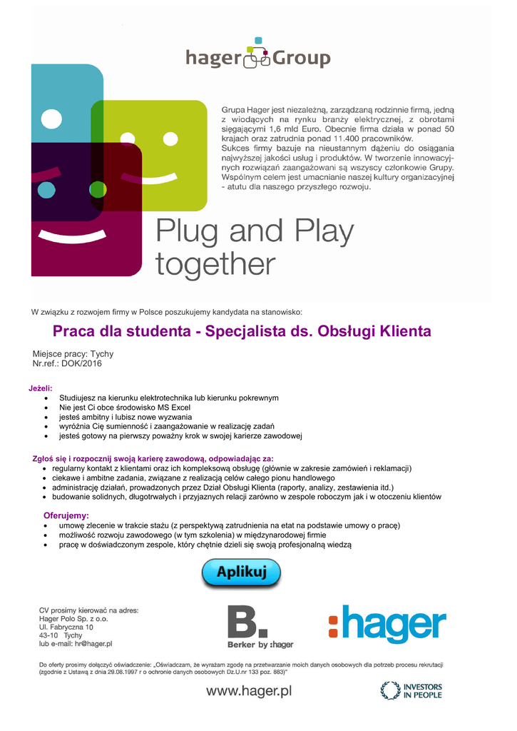 W związku z rozwojem firmy w Polsce poszukujemy kandydata na stanowisko: Praca dla studenta - Specjalista ds. Obsługi Klienta Miejsce pracy: Tychy Nr.ref.: DOK/2016 Jeżeli: Studiujesz na kierunku elektrotechnika lub kierunku pokrewnym Nie jest Ci obce środowisko MS Excel jesteś ambitny i lubisz nowe wyzwania wyróżnia Cię sumienność i zaangażowanie w realizację zadań jesteś gotowy na pierwszy poważny krok w swojej karierze zawodowej Zgłoś się i rozpocznij swoją karierę zawodową, odpowiadając za: regularny kontakt z klientami oraz ich kompleksową obsługę (głównie w zakresie zamówień i reklamacji) ciekawe i ambitne zadania, związane z realizacją celów całego pionu handlowego administrację działań, prowadzonych przez Dział Obsługi Klienta (raporty, analizy, zestawienia itd.) budowanie solidnych, długotrwałych i przyjaznych relacji zarówno w zespole roboczym jak i w otoczeniu klientów Oferujemy: umowę zlecenie w trakcie stażu (z perspektywą zatrudnienia na etat na podstawie umowy o pracę) możliwość rozwoju zawodowego (w tym szkolenia) w międzynarodowej firmie pracę w doświadczonym zespole, który chętnie dzieli się swoją profesjonalną wiedzą
