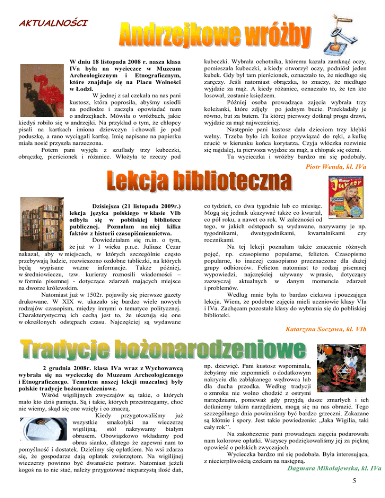 AKTUALNOŚCI W dniu 18 listopada 2008 r. nasza klasa IVa była na wycieczce w Muzeum Archeologicznym i Etnograficznym, które znajduje się na Placu Wolności w Łodzi. W jednej z sal czekała na nas pani kustosz, która poprosiła, abyśmy usiedli na podłodze i zaczęła opowiadać nam o andrzejkach. Mówiła o wróŜbach, jakie kiedyś robiło się w andrzejki. Na przykład o tym, Ŝe chłopcy pisali na kartkach imiona dziewczyn i chowali je pod poduszkę, a rano wyciągali kartkę. Imię napisane na papierku miała nosić przyszła narzeczona. Potem pani wyjęła z szuflady trzy kubeczki, obrączkę, pierścionek i róŜaniec. WłoŜyła te rzeczy pod kubeczki. Wybrała ochotnika, któremu kazała zamknąć oczy, pomieszała kubeczki, a kiedy otworzył oczy, podniósł jeden kubek. Gdy był tam pierścionek, oznaczało to, Ŝe niedługo się zaręczy. Jeśli natomiast obrączka, to znaczy, Ŝe niedługo wyjdzie za mąŜ. A kiedy róŜaniec, oznaczało to, Ŝe ten kto losował, zostanie księdzem. Później osoba prowadząca zajęcia wybrała trzy koleŜanki, które zdjęły po jednym bucie. Przekładały je równo, but za butem. Ta której pierwszy dotknął progu drzwi, wyjdzie za mąŜ najwcześniej. Następnie pani kustosz dała dzieciom trzy kłębki wełny. Trzeba było ich końce przywiązać do ręki, a kulkę rzucić w kierunku końca korytarza. Czyja włóczka rozwinie się najdalej, ta pierwsza wyjdzie za mąŜ, a chłopak się oŜeni. Ta wycieczka i wróŜby bardzo mi się podobały. Piotr Wenda, kl. IVa Dzisiejsza (21 listopada 2009r.) lekcja języka polskiego w klasie VIb odbyła się w pobliskiej bibliotece publicznej. Poznałam na niej kilka faktów z historii czasopiśmiennictwa. Dowiedziałam się m.in. o tym, Ŝe juŜ w I wieku p.n.e. Juliusz Cezar nakazał, aby w miejscach, w których szczególnie często przebywają ludzie, rozwieszono ozdobne tabliczki, na których będą wypisane waŜne informacje. TakŜe później, w średniowieczu, tzw. kurierzy roznosili wiadomości – w formie pisemnej - dotyczące zdarzeń mających miejsce na dworze królewskim. Natomiast juŜ w 1502r. pojawiły się pierwsze gazety drukowane. W XIX w. ukazało się bardzo wiele nowych rodzajów czasopism, między innymi o tematyce politycznej. Charakterystyczną ich cechą jest to, Ŝe ukazują się one w określonych odstępach czasu. Najczęściej są wydawane co tydzień, co dwa tygodnie lub co miesiąc. Mogą się jednak ukazywać takŜe co kwartał, co pół roku, a nawet co rok. W zaleŜności od tego, w jakich odstępach są wydawane, nazywamy je np. tygodnikami, dwutygodnikami, kwartalnikami czy rocznikami. Na tej lekcji poznałam takŜe znaczenie róŜnych pojęć, np. czasopismo popularne, felieton. Czasopismo popularne, to inaczej czasopismo przeznaczone dla duŜej grupy odbiorców. Felieton natomiast to rodzaj pisemnej wypowiedzi, najczęściej uŜywany w prasie, dotyczący zazwyczaj aktualnych w danym momencie zdarzeń i problemów. Według mnie była to bardzo ciekawa i pouczająca lekcja. Wiem, Ŝe podobne zajęcia mieli uczniowie klasy VIa i IVa. Zachęcam pozostałe klasy do wybrania się do pobliskiej biblioteki. Katarzyna Soczawa, kl. VIb 2 grudnia 2008r. klasa IVa wraz z Wychowawcą wybrała się na wycieczkę do Muzeum Archeologicznego i Etnograficznego. Tematem naszej lekcji muzealnej były polskie tradycje boŜonarodzeniowe. Wśród wigilijnych zwyczajów są takie, o których mało kto dziś pamięta. Są i takie, których przestrzegamy, choć nie wiemy, skąd się one wzięły i co znaczą. Kiedy przygotowaliśmy juŜ wszystkie smakołyki na wieczerzę wigilijną, stół nakrywamy białym obrusem. Obowiązkowo wkładamy pod obrus sianko, dlatego Ŝe zapewni nam to pomyślność i dostatek. Dzielimy się opłatkiem. Na wsi zdarza się, Ŝe gospodarze dają opłatek zwierzętom. Na wigilijnej wieczerzy powinno być dwanaście potraw. Natomiast jeŜeli kogoś na to nie stać, naleŜy przygotować nieparzystą ilość dań, np. dziewięć. Pani kustosz wspominała, Ŝebyśmy nie zapomnieli o dodatkowym nakryciu dla zabłąkanego wędrowca lub dla ducha przodka. Według tradycji o zmroku nie wolno chodzić z ostrymi narzędziami, poniewaŜ gdy przyjdą dusze zmarłych i ich dotkniemy takim narzędziem, mogą się na nas obrazić. Tego szczególnego dnia powinniśmy być bardzo grzeczni. Zakazane są kłótnie i spory. Jest takie powiedzenie: „Jaka Wigilia, taki cały rok’’. Na zakończenie pani prowadząca zajęcia podarowała nam kolorowe opłatki. Wszyscy podziękowaliśmy jej za piękną opowieść o polskich zwyczajach. Wycieczka bardzo mi się podobała. Była interesująca, z niecierpliwością czekam na następną. Dagmara Mikołajewska, kl. IVa 5