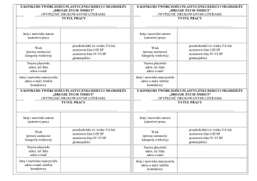 X KONKURS TWÓRCZOŚCI PLASTYCZNEJ DZIECI I MŁODZIEŻY „DRUGIE ŻYCIE ŚMIECI” (WYPEŁNIĆ DRUKOWANYMI LITERAMI) TYTUŁ PRACY X KONKURS TWÓRCZOŚCI PLASTYCZNEJ DZIECI I MŁODZIEŻY „DRUGIE ŻYCIE ŚMIECI” (WYPEŁNIĆ DRUKOWANYMI LITERAMI) TYTUŁ PRACY …………………………………………………………………… …………………………………………………………………… Imię i nazwisko autora (autorów) pracy Wiek (proszę zaznaczyć kategorię wiekową) Imię i nazwisko autora (autorów) pracy przedszkolaki (w wieku 5-6 lat) uczniowie klas I-III SP uczniowie klas IV-VI SP gimnazjaliści Wiek (proszę zaznaczyć kategorię wiekową) przedszkolaki (w wieku 5-6 lat) uczniowie klas I-III SP uczniowie klas IV-VI SP gimnazjaliści Nazwa placówki adres, tel./faks adres e-mail Nazwa placówki adres, tel./faks adres e-mail Imię i nazwisko nauczyciela adres e-mail, telefon kontaktowy Imię i nazwisko nauczyciela adres e-mail, telefon kontaktowy X KONKURS TWÓRCZOŚCI PLASTYCZNEJ DZIECI I MŁODZIEŻY „DRUGIE ŻYCIE ŚMIECI” (WYPEŁNIĆ DRUKOWANYMI LITERAMI) TYTUŁ PRACY X KONKURS TWÓRCZOŚCI PLASTYCZNEJ DZIECI I MŁODZIEŻY „DRUGIE ŻYCIE ŚMIECI” (WYPEŁNIĆ DRUKOWANYMI LITERAMI) TYTUŁ PRACY …………………………………………………………………… …………………………………………………………………… Imię i nazwisko autora (autorów) pracy Wiek (proszę zaznaczyć kategorię wiekową) Imię i nazwisko autora (autorów) pracy przedszkolaki (w wieku 5-6 lat) uczniowie klas I-III SP uczniowie klas IV-VI SP gimnazjaliści Wiek (proszę zaznaczyć kategorię wiekową) Nazwa placówki adres, tel./faks adres e-mail Nazwa placówki adres, tel./faks adres e-mail Imię i nazwisko nauczyciela adres e-mail, telefon kontaktowy Imię i nazwisko nauczyciela adres e-mail, telefon kontaktowy przedszkolaki (w wieku 5-6 lat) uczniowie klas I-III SP uczniowie klas IV-VI SP gimnazjaliści