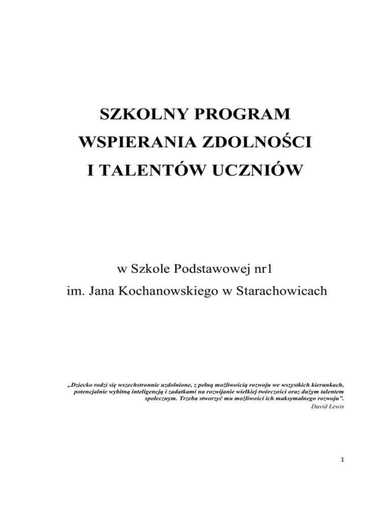 SZKOLNY PROGRAM WSPIERANIA ZDOLNOŚCI I TALENTÓW UCZNIÓW w Szkole Podstawowej nr1 im. Jana Kochanowskiego w Starachowicach „Dziecko rodzi się wszechstronnie uzdolnione, z pełną możliwością rozwoju we wszystkich kierunkach, potencjalnie wybitną inteligencją i zadatkami na rozwijanie wielkiej twórczości oraz dużym talentem społecznym. Trzeba stworzyć mu możliwości ich maksymalnego rozwoju”. David Lewis 1 1. WSTĘP Od wielu lat obserwuje się ogromne zainteresowanie uczniami zdolnymi. Nie jest to temat nowy - w każdej epoce historycznej pojawiali się ludzie utalentowani, zdolni, geniusze. Zapewne każdy współczesny nauczyciel spotkał w swej pracy zawodowej ucznia o którym mówiono, że jest zdolny, czy też obdarzony określonym talentem. Właśnie uczniowie wyróżniający się nieprzeciętnymi zdolnościami to ci, z którymi szkoła, rodzina i społeczeństwo wiążą ogromne nadzieje. Jednym z najważniejszych zadań współczesnej szkoły jest wsparcie utalentowanych uczniów. Kierując się tym stwierdzeniem w naszej szkole dążymy do tego, aby wszystkie dzieci, również te mniej uzdolnione, miały możliwość rozwijania zainteresowań i odkrywania swoich pasji. Stąd część oferty zajęć pozalekcyjnych kierowana jest do całej społeczności szkolnej. Nasza szkoła to miejsce, w którym każde dziecko może rozwijać swoją twórczość, aktywność i zainteresowania. Z drugiej strony przywiązujemy wagę do tego, aby jak najwcześniej zdiagnozować uczniów szczególnie uzdolnionych, co pozwala nam szybko odpowiadać na ich potrzeby edukacyjne, zaplanować odpowiednie działania oraz stwarzać im takie warunki, aby wykorzystali maksymalnie swój potencjał i talenty osiągając sukcesy. W tym celu powstał Szkolny Program Wspierania Zdolności i Talentów Uczniów w Szkole Podstawowej nr 1 im. Jana Kochanowskiego w Starachowicach, który zawiera cele, zadania i rodzaje obszarów, w których uczniowie mogą rozwijać swoje zainteresowania. Program uwzględnia indywidualne cechy, potrzeby i możliwość i uczniów. 2. KONCEPCJA PROGRAMU I SPOSÓB REALIZACJI Szkolny Program Wspierania Zdolności i Talentów Uczniów obejmuje uczniów szkoły na wszystkich etapach edukacji. Adresatami programu są: uczniowie, dyrektor szkoły, wychowawcy i nauczyciele przedmiotów, nauczyciele świetlicy i nauczyciel biblioteki, pedagog szkolny, rodzice Program zawiera sposób realizacji celów kształcenia i zadań edukacyjnych wynikających z realizacji podstawy programowej poszczególnych przedmiotów. Zapewnia uczniom poznawanie również treści ponadprogramowych. Proponowane działania umożliwią szybszy rozwój uczniów. Wyposażą ich w większy zakres wiedzy zgodnie z poziomem rozwoju intelektualnego, zdolnościami, ukształtują twórcze i oryginalne myślenie. Realizacja programu odbywać się będzie w trakcie zajęć lekcyjnych i zajęć pozalekcyjnych takich jak: koła zainteresowań, zajęcia wynikające z organizacji pracy szkoły, zajęcia 2 w ramach realizacji godzin z art. 42 ust.2 pkt 2 Karty Nauczyciela oraz zajęcia z inicjatywy nauczyciela. W toku realizacji programu przewiduje się współpracę z PPP, Biblioteką Miejską „Plastuś”, szkołami podstawowymi, klubami sportowymi, Nadleśnictwem Starachowice, Muzeum Przyrody i Techniki, samorządem lokalnym i innymi instytucjami realizującymi zadania w zakresie pracy z uczniem zdolnym. 3. CELE. Cel główny: zapewnienie uczniowi zdolnemu możliwości wszechstronnego rozwoju poprzez rozbudzanie i rozwijanie zainteresowań, uzdolnień i umiejętności uczniów na każdym etapie kształcenia i w ramach wszystkich przedmiotów szkolnych, stworzenie warunków do osiągania sukcesów oraz promowanie ich na terenie szkoły i w środowisku lokalnym, doskonalenie jakości pracy szkoły. Cele szczegółowe: diagnozowanie szczególnych uzdolnień uczniów, stymulowanie aktywności twórczej, zachęcanie do niezależnego myślenia i stosowania nietypowych rozwiązań, wdrażanie uczniów do pracy samokształceniowej, rozwijanie kreatywności, wyobraźni, fantazji, ciekawości poznawczej oraz samodzielności, przygotowanie uczniów zdolnych do udziału w konkursach, olimpiadach przedmiotowych, artystycznych, zawodach sportowych, promocja osiągnięć uczniów w szkole i środowisku lokalnym, doskonalenie form współpracy z rodzicami w zakresie wspierania rozwoju i talentów dzieci, współdziałanie z instytucjami i organizacjami realizującymi zadania w zakresie pracy z uczniem zdolnym. 4. CHARAKTERYSTYKA UCZNIA ZDOLNEGO. Uczeń wybitnie zdolny, poza wysoką inteligencją ogólną, wyróżnia się osiągnięciem twórczym, wyobraźnią, wybitnymi zdolnościami specjalnymi, łatwością uczenia się, szerokimi zainteresowaniami, samokrytycyzmem, kreatywnością, perfekcyjnością. Uczestniczy w konkursach szkolnych i pozaszkolnych o charakterze przedmiotowym 3 i interdyscyplinarnym oraz osiąga znaczące sukcesy. Ma udokumentowane osiągniecia w dziedzinach pozaszkolnych (modelarstwo, szachy, taniec, sport, zaangażowanie społeczne i inne). Wykazuje zainteresowanie danym przedmiotem i chęć współpracy z nauczycielem w rozwijaniu swoich pasji. 4.1. Obszary uzdolnień: artystyczne, przyrodniczo – ekologiczne, humanistyczne, matematyczne, informatyczne, językowe, sportowe. 4.2. Narzędzia identyfikacji i diagnozy uzdolnień. Testy: - predyspozycji i zdolności, - diagnostyczne w szczególności klasy I-IV, Obserwacja zachowań ucznia w obszarze określonych uzdolnień przez wychowawcę, nauczycieli przedmiotowców, pedagoga, pracownika biblioteki, świetlicy, Nominacja: - przyznana przez nauczyciela (rozpoznanie przez nauczycieli uczących zdolności np.: recytatorskich, plastycznych, muzycznych, matematycznych, społecznych, 4 sportowych i innych), - przyznana przez rodziców, - przyznana przez grupę rówieśniczą, - przyznana przez instytucje i ekspertów pracujących z uczniami, - uczeń może sam 