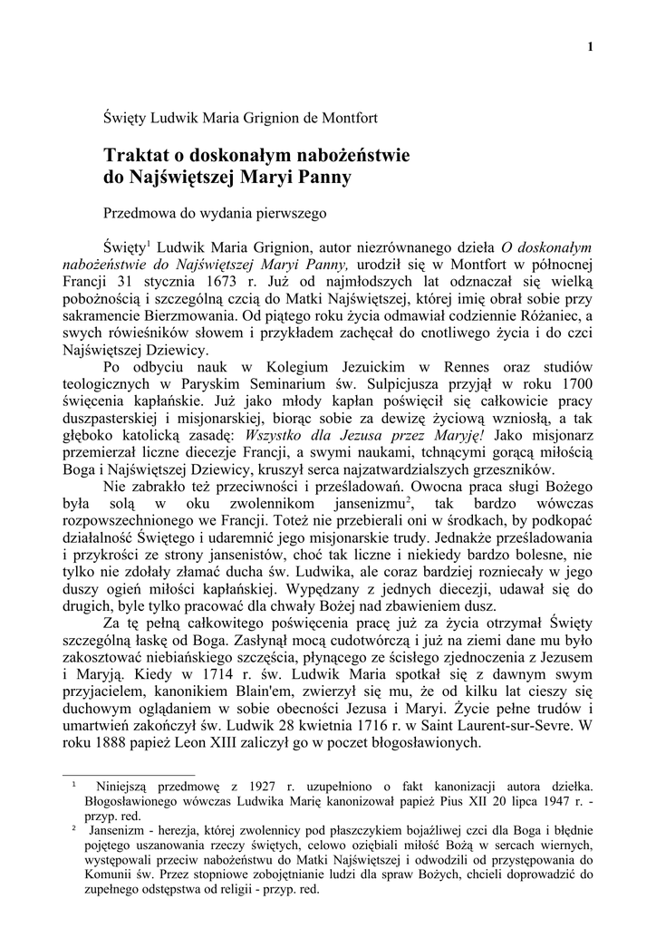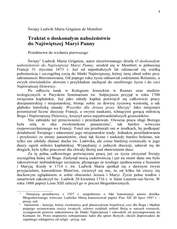 1 Święty Ludwik Maria Grignion de Montfort Traktat o doskonałym nabożeństwie do Najświętszej Maryi Panny Przedmowa do wydania pierwszego Święty1 Ludwik Maria Grignion, autor niezrównanego dzieła O doskonałym nabożeństwie do Najświętszej Maryi Panny, urodził się w Montfort w północnej Francji 31 stycznia 1673 r. Już od najmłodszych lat odznaczał się wielką pobożnością i szczególną czcią do Matki Najświętszej, której imię obrał sobie przy sakramencie Bierzmowania. Od piątego roku życia odmawiał codziennie Różaniec, a swych rówieśników słowem i przykładem zachęcał do cnotliwego życia i do czci Najświętszej Dziewicy. Po odbyciu nauk w Kolegium Jezuickim w Rennes oraz studiów teologicznych w Paryskim Seminarium św. Sulpicjusza przyjął w roku 1700 święcenia kapłańskie. Już jako młody kapłan poświęcił się całkowicie pracy duszpasterskiej i misjonarskiej, biorąc sobie za dewizę życiową wzniosłą, a tak głęboko katolicką zasadę: Wszystko dla Jezusa przez Maryję! Jako misjonarz przemierzał liczne diecezje Francji, a swymi naukami, tchnącymi gorącą miłością Boga i Najświętszej Dziewicy, kruszył serca najzatwardzialszych grzeszników. Nie zabrakło też przeciwności i prześladowań. Owocna praca sługi Bożego była solą w oku zwolennikom jansenizmu 2, tak bardzo wówczas rozpowszechnionego we Francji. Toteż nie przebierali oni w środkach, by podkopać działalność Świętego i udaremnić jego misjonarskie trudy. Jednakże prześladowania i przykrości ze strony jansenistów, choć tak liczne i niekiedy bardzo bolesne, nie tylko nie zdołały złamać ducha św. Ludwika, ale coraz bardziej rozniecały w jego duszy ogień miłości kapłańskiej. Wypędzany z jednych diecezji, udawał się do drugich, byle tylko pracować dla chwały Bożej nad zbawieniem dusz. Za tę pełną całkowitego poświęcenia pracę już za życia otrzymał Święty szczególną łaskę od Boga. Zasłynął mocą cudotwórczą i już na ziemi dane mu było zakosztować niebiańskiego szczęścia, płynącego ze ścisłego zjednoczenia z Jezusem i Maryją. Kiedy w 1714 r. św. Ludwik Maria spotkał się z dawnym swym przyjacielem, kanonikiem Blain'em, zwierzył się mu, że od kilku lat cieszy się duchowym oglądaniem w sobie obecności Jezusa i Maryi. Życie pełne trudów i umartwień zakończył św. Ludwik 28 kwietnia 1716 r. w Saint Laurent-sur-Sevre. W roku 1888 papież Leon XIII zaliczył go w poczet błogosławionych. 1 2 Niniejszą przedmowę z 1927 r. uzupełniono o fakt kanonizacji autora dziełka. Błogosławionego wówczas Ludwika Marię kanonizował papież Pius XII 20 lipca 1947 r. przyp. red. Jansenizm - herezja, której zwolennicy pod płaszczykiem bojaźliwej czci dla Boga i błędnie pojętego uszanowania rzeczy świętych, celowo oziębiali miłość Bożą w sercach wiernych, występowali przeciw nabożeństwu do Matki Najświętszej i odwodzili od przystępowania do Komunii św. Przez stopniowe zobojętnianie ludzi dla spraw Bożych, chcieli doprowadzić do zupełnego odstępstwa od religii - przyp. red. 2 Święty Ludwik Maria Grignion pozostawił po sobie nie tylko przykład świątobliwego życia, lecz także mnóstwo pism pobożnych i pieśni religijnych ułożonych dla ludu. Spuścizną po nim są również dwa zgromadzenia zakonne przez Niego założone, które przetrwały aż do naszych czasów. Zgromadzenie żeńskie Córek Mądrości, założone w 1703 r., po dziś dzień poświęca się pielęgnowaniu chorych w szpitalach, a w Towarzystwie Maryi, powstałym w oparciu o ustawy św. Ludwika, zrzeszają się kapłani, którzy idąc w ślady świętego założyciela, poświęcają się pracy misjonarskiej. Spośród licznych dzieł, które wyszły spod pióra św. Ludwika Marii, bezsprzecznie najznakomitszym i najsławniejszym jest dzieło O doskonałym nabożeństwie do Najświętszej Maryi Panny. Powstało ono w 1712 r. w czasie pobytu Świętego w pustelni św. Eligiusza. Jakie miały być losy tej złotej książeczki, autor sam przepowiedział, mianowicie, że szatan, obawiając się zbawiennego jej wpływu, starać się będzie ze wszystkich sił, aby ją ukryć przed światem i pogrążyć w zapomnieniu. Istotnie, przepowiednia Świętego spełniła się dokładnie. Dzieło O doskonałym nabożeństwie do Najświętszej Maryi Panny nie wydane przez autora leżało w zapomnieniu, aż je w 1842 r. odkryto przypadkiem w starym kufrze pomiędzy innymi rękopisami w domu zakonnym w Saint Laurent-sur-Sevre. Ponieważ proces beatyfikacyjny autora był już wówczas w toku, dlatego posłano je do Rzymu, gdzie komisja papieska po gruntownym zbadaniu, osobnym dekretem orzekła, iż dzieło to wolne jest od wszelkich błędów. Odtąd zaczęły się ukazywać coraz to nowe wydania, a także tłumaczenia na inne języki. O niebywałej poczytności tej niezrównanej książki świadczy fakt, że wydań francuskich ukazało się dotąd przeszło trzydzieści 3. Na język angielski przetłumaczył ją sławny oratorianin o. Faber (+ 1863), a także napisał do niej przedmowę, gdzie w gorących i pełnych najwyższej czci słowach wyraża się o św. Ludwiku de Montfort oraz o dziele O doskonałym nabożeństwie do Najświętszej Maryi Panny. Na czym polega to nabożeństwo - spyta może niejeden - że nazwano je doskonałym4 i że cieszy się tak powszechnym uznaniem? Na to odpowiem, że gruntowne poznanie istoty i ducha tego nabożeństwa wymaga przeczytania, przemyślenia i przemodlenia samego dzieła, i to nie raz, ale częstokroć. Powtórna lektura bynajmniej nie nuży, lecz pozwala coraz lepiej odkrywać niezrównany jego urok i wnikać coraz głębiej w jego przebogatą treść 5. 3 4 5 To jest do roku 1927 - przyp. red. Na zarzut tych, którzy twierdzą, że dzieło św. Ludwika de Montfort niesłusznie zatytułowano (rękopis Świętego jest bez tytułu): O doskonałym nabożeristwie do Najświętszej 
